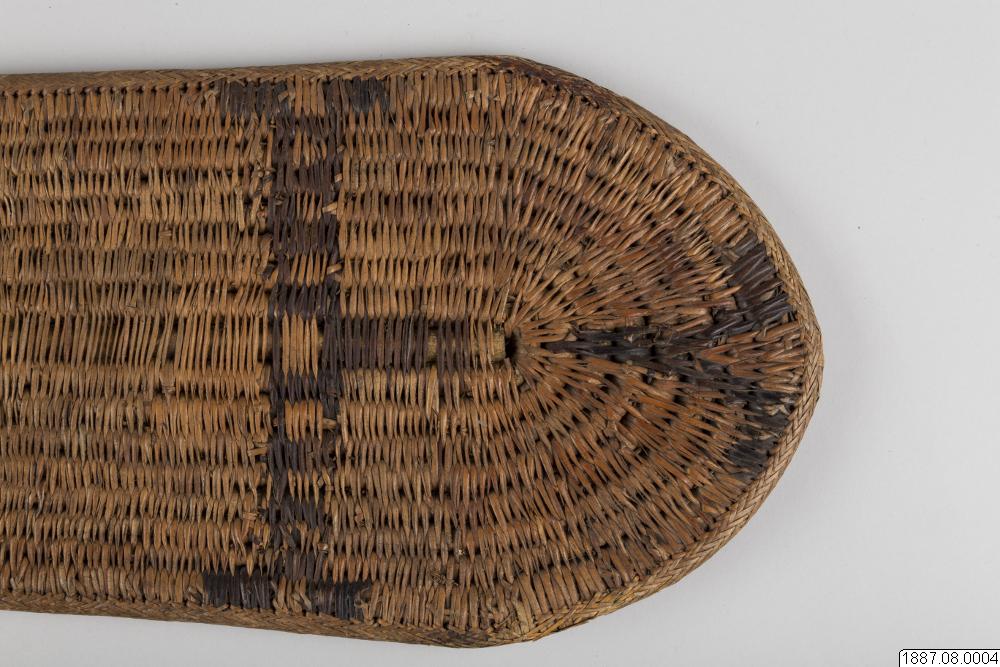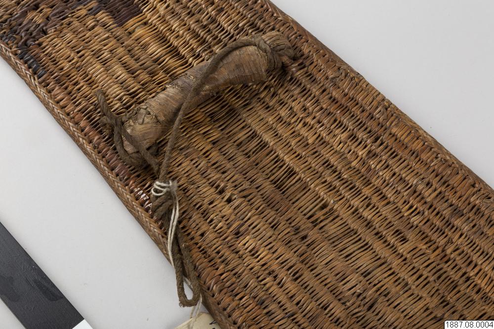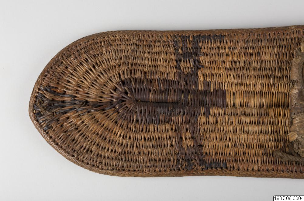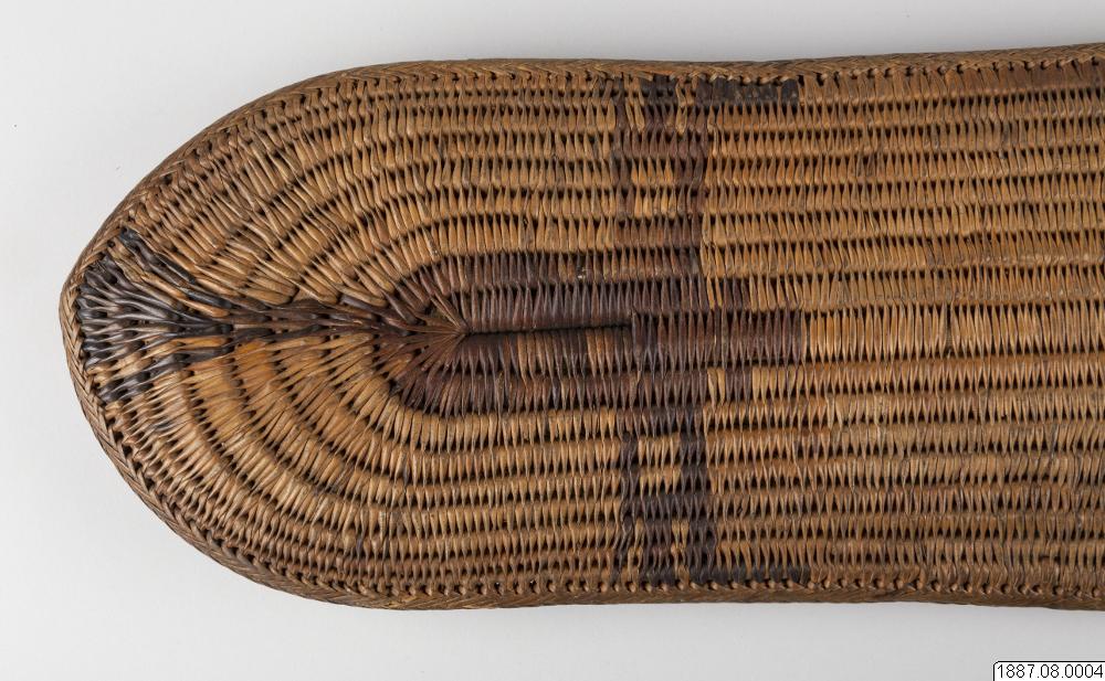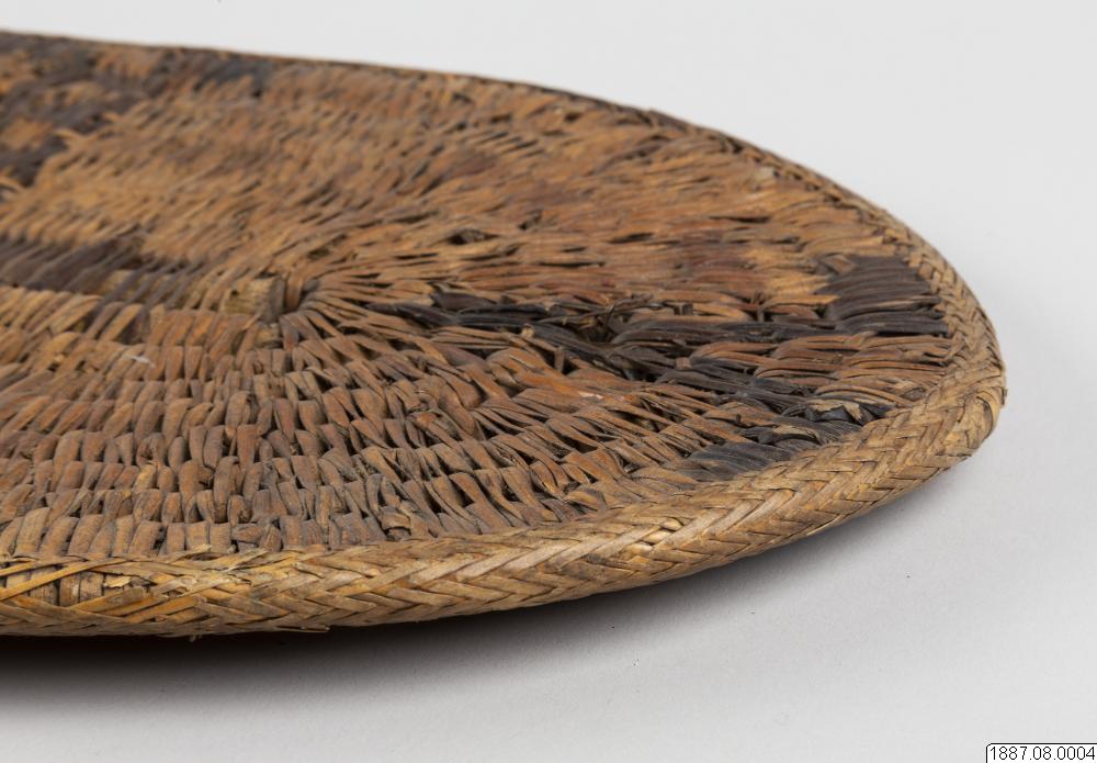 Denna flätade och ovalformade sköld, med en något avsmalnad mitt som dekorerats med svart motiv, är troligtvis tillverkad på Floridaöarna Nggela eller vid Guadalcanal (provins på Salomonöarna). Sköldar som produceras i detta område utgjorde en handelsvara på Salomonöarna, särskilt på de västra öarna. Det var framför allt här som många sköldar samlades in. Andra flätade sköldar av en mer elliptisk form, med spetsiga ändar, gjordes troligen på Santa Isabel. Denna sköld har delats upp i tre sektioner genom införandet av det svarta materialet. Den är dekorerad vid de rundade ändarna och det stiliserade mönstret föreställer den klykstjärtade fregattfågeln. Liksom hos många andra samhällen i Stilla havsområdet var fregattfågeln ofta förknippad med aggression och krigföring samt andra manligt kodade aktiviteter.