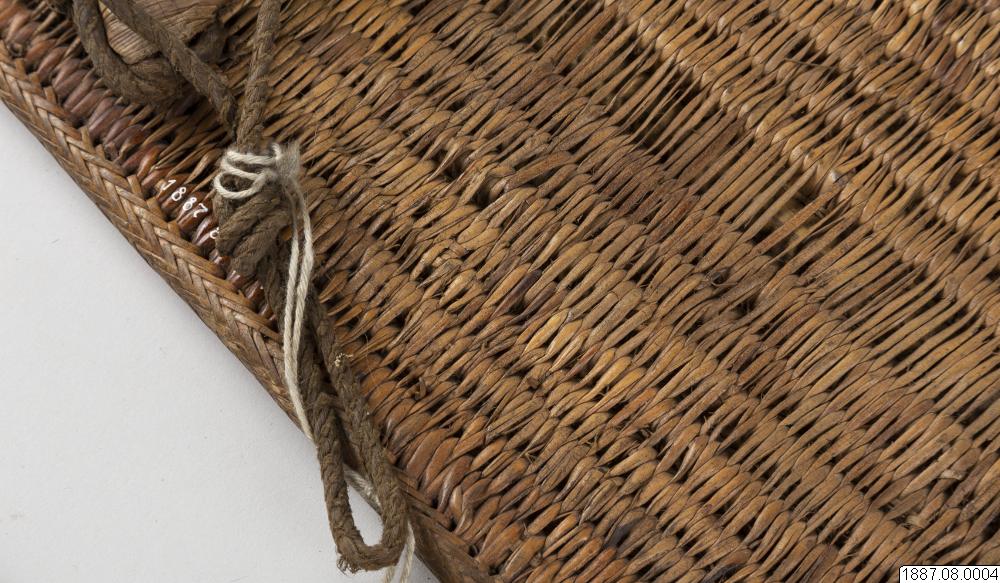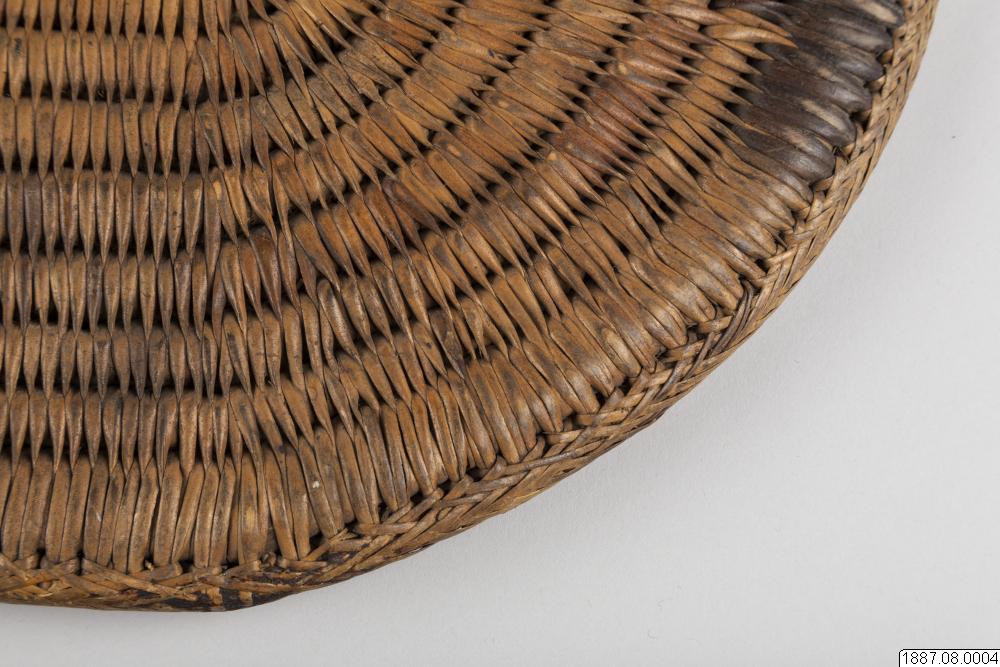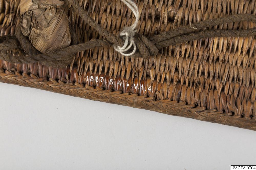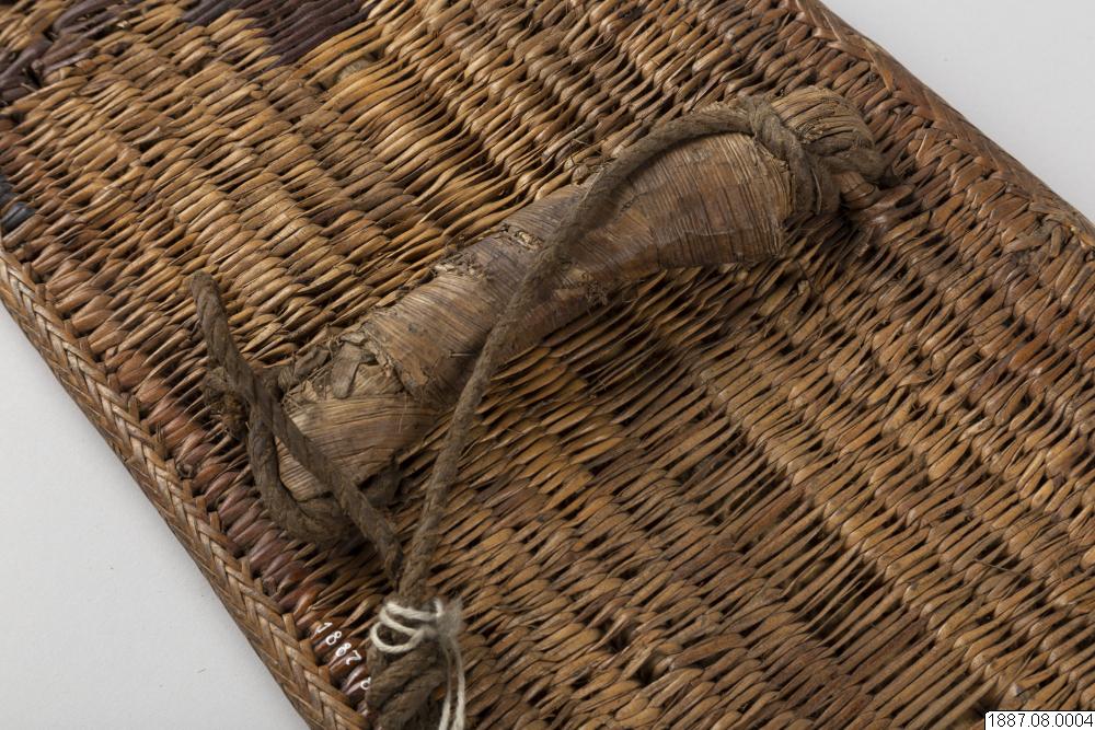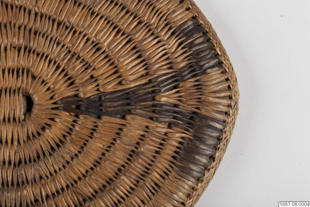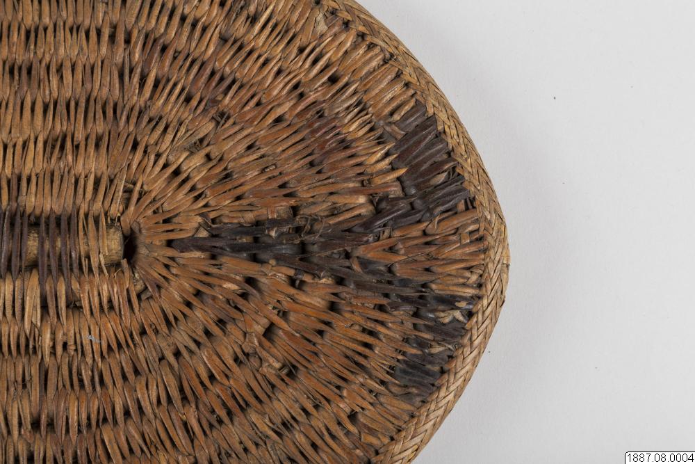 Denna flätade och ovalformade sköld, med en något avsmalnad mitt som dekorerats med svart motiv, är troligtvis tillverkad på Floridaöarna Nggela eller vid Guadalcanal (provins på Salomonöarna). Sköldar som produceras i detta område utgjorde en handelsvara på Salomonöarna, särskilt på de västra öarna. Det var framför allt här som många sköldar samlades in. Andra flätade sköldar av en mer elliptisk form, med spetsiga ändar, gjordes troligen på Santa Isabel. Denna sköld har delats upp i tre sektioner genom införandet av det svarta materialet. Den är dekorerad vid de rundade ändarna och det stiliserade mönstret föreställer den klykstjärtade fregattfågeln. Liksom hos många andra samhällen i Stilla havsområdet var fregattfågeln ofta förknippad med aggression och krigföring samt andra manligt kodade aktiviteter.