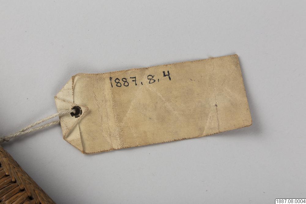 This wicker shield, which features an oval or rounded top and base with a slightly contracted middle section along with the inclusion of fine wickerwork decorative motifs in black, was probably made in Guadalcanal or Nggela (Florida Islands). Shields produced in this area were traded or sold to other islands in the Solomons, particularly to the Western Solomon Islands, from where many were eventually collected. Other wicker shields of more elliptical shape, with pointed tops and bases, were probably made in Santa Isabel and similarly traded or sold to the Western Solomons. Decoratively, the shield has been divided into three sections through the inclusion of black fibre. In this example, the top and bottom decorative patterns feature stylized representations of the forked tail of the frigate bird. As with many other societies in the Pacific, the frigate bird was often associated with aggression and warfare and other male activities.