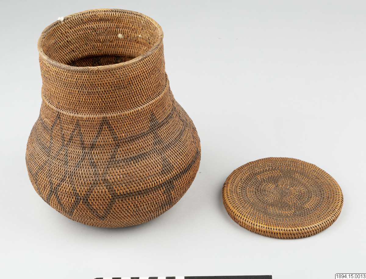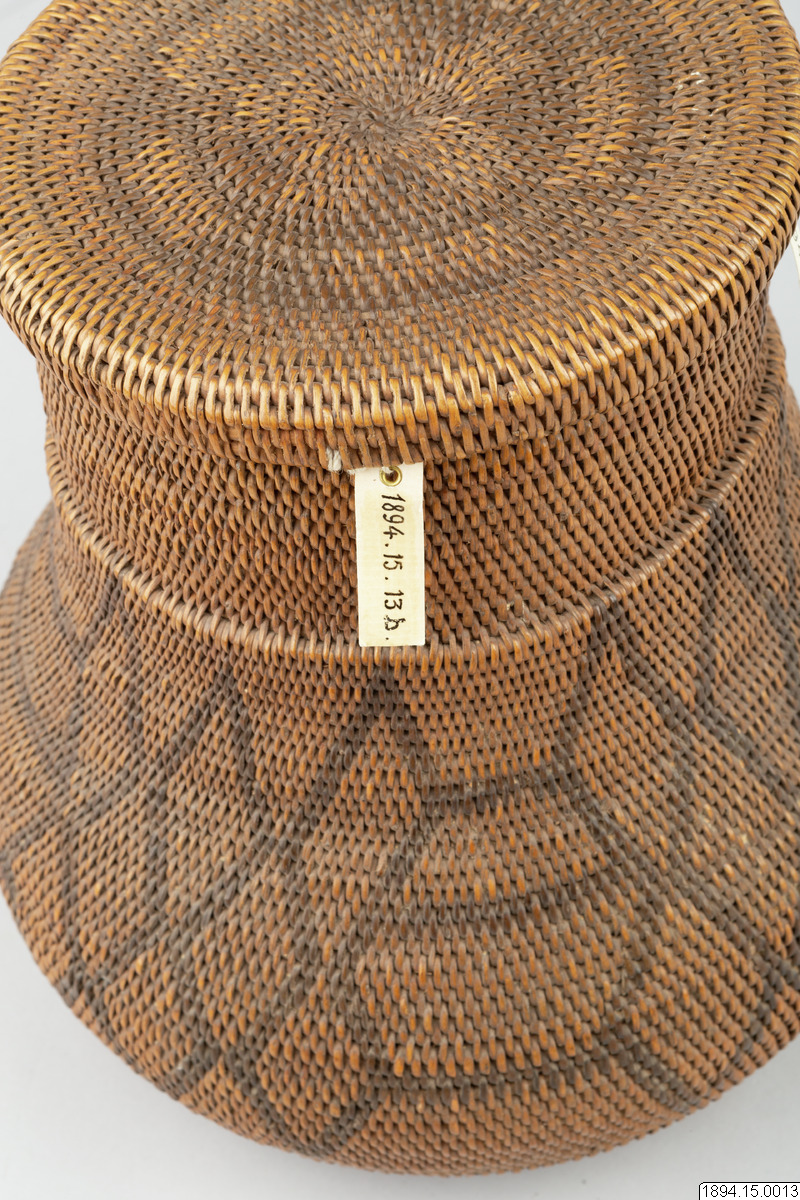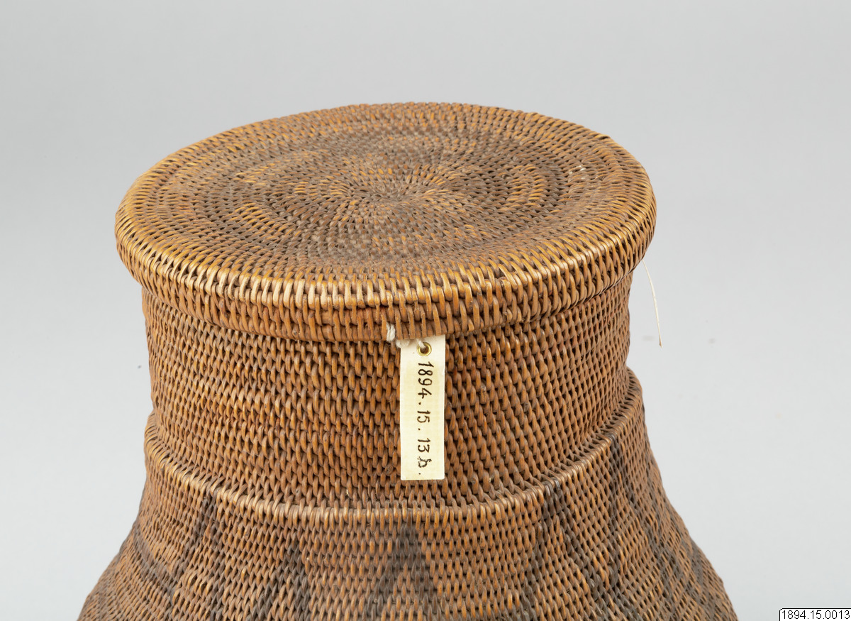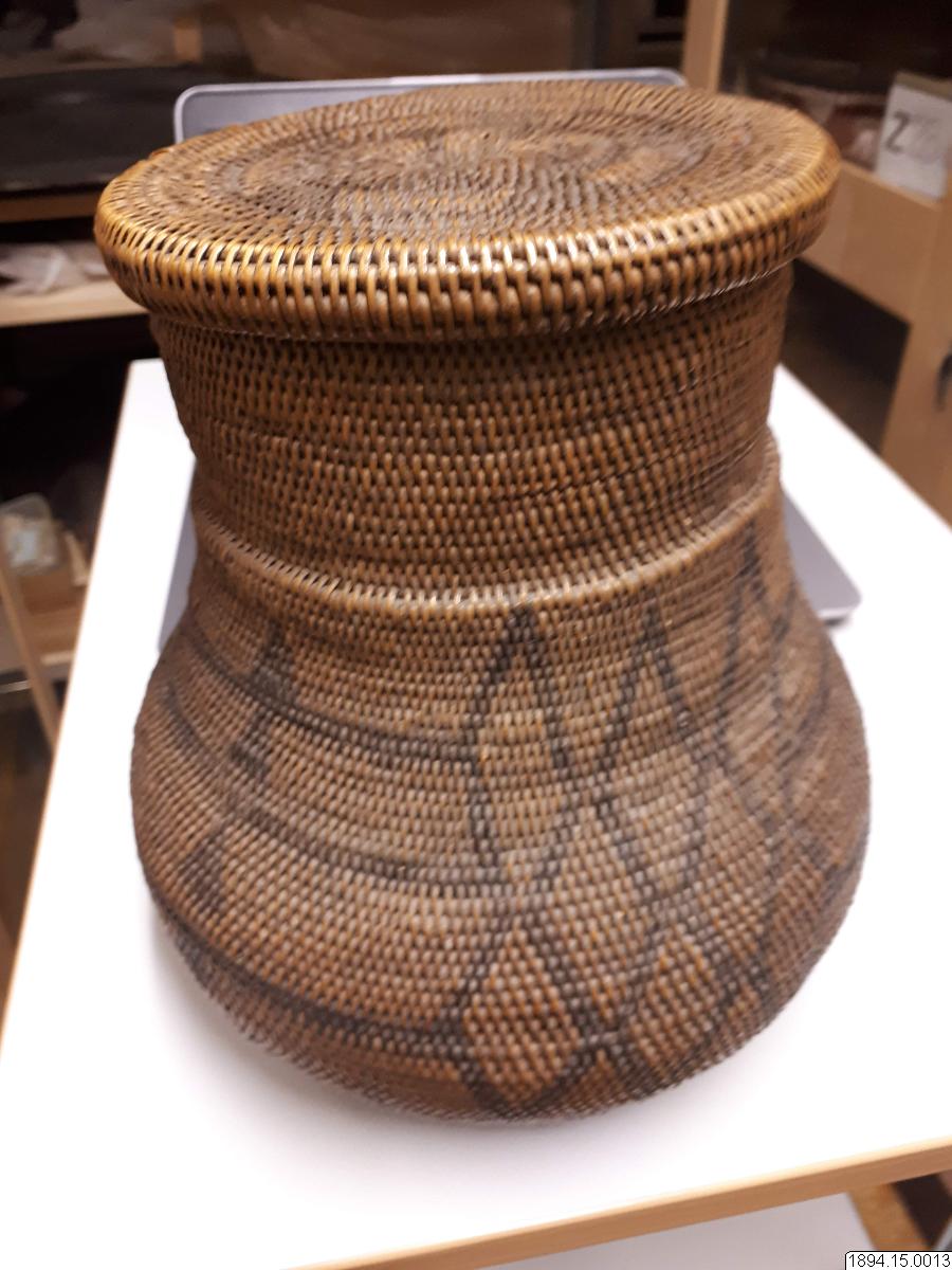According to the general catalogue: Mo-Kenge-Basket with lid. Made from tree roots. Work of the Queen of the Marutse Kingdom. Curved, rounded lower part with cylindrical mouth part. The whole object decorated with a geometric pattern, darker in color than the tree roots. The lid is fairly flat and with folded edges. Height (basket and lid) 23 cm. Mouth opening Outer diam. 14 cm. The bulging part max. diam. 20 cm. Ma-Rutse. Ma-Rutse and the Marutse kingdom refer to what is today called the Lozi people and the Lozi kingdom (Bulozi in the Lozi language). 2019-06-18, Michael Barrett