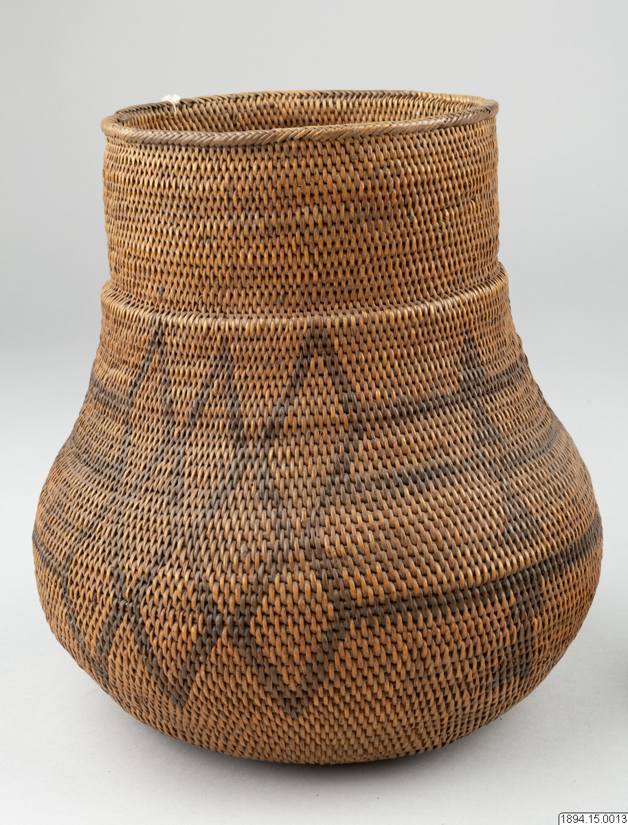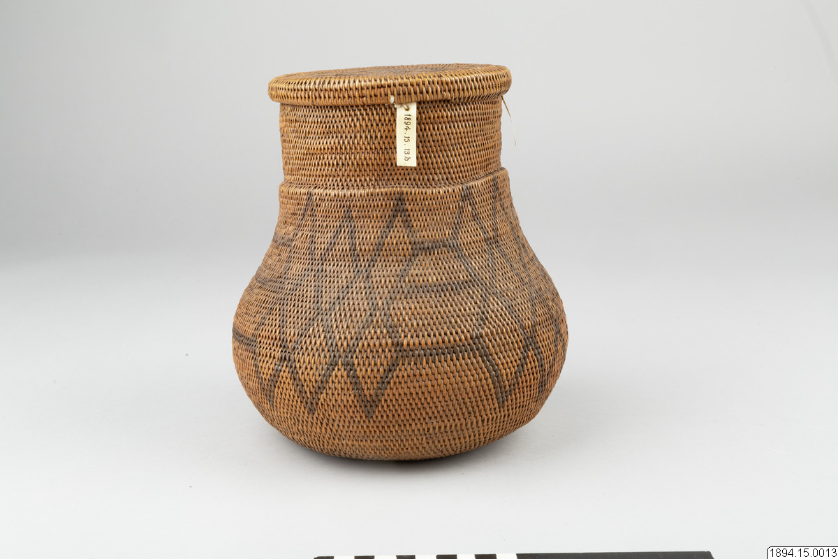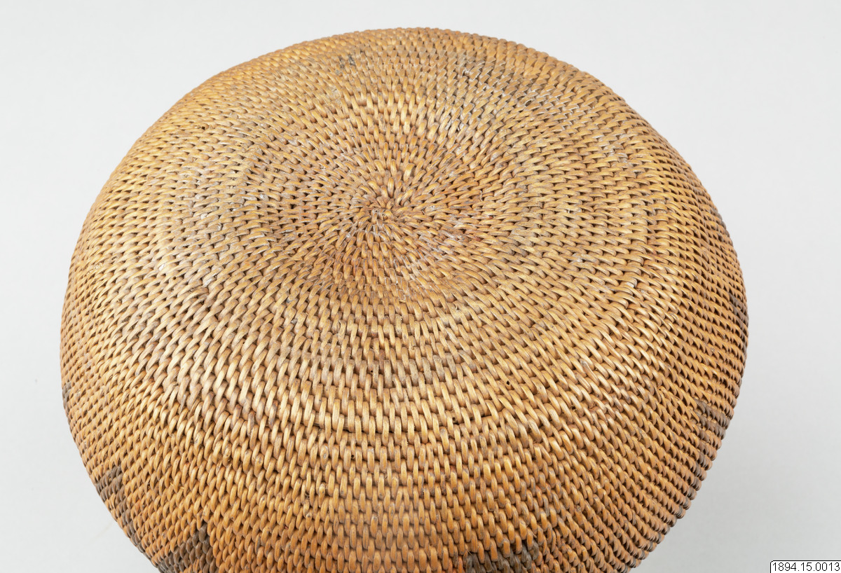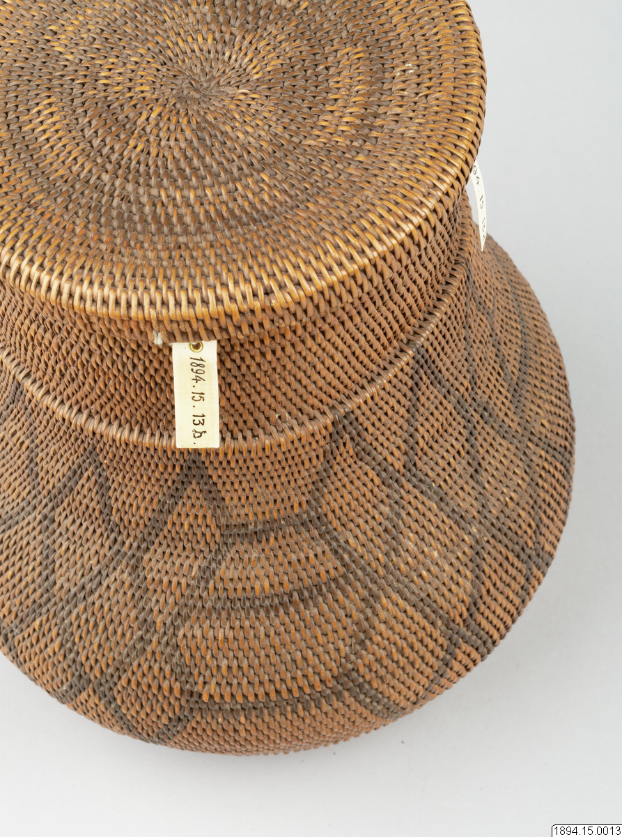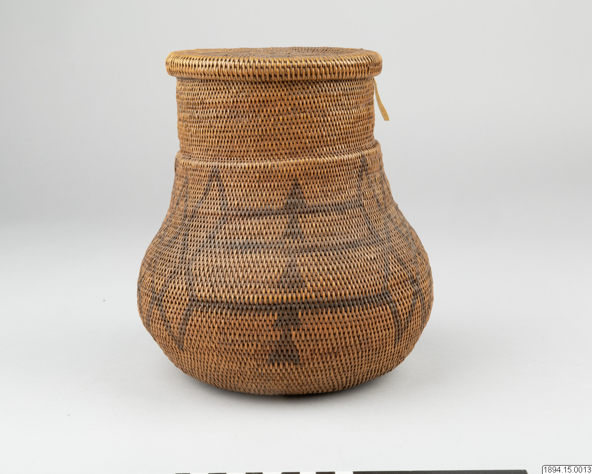 According to the general catalogue: Mo-Kenge-Basket with lid. Made from tree roots. Work of the Queen of the Marutse Kingdom. Curved, rounded lower part with cylindrical mouth part. The whole object decorated with a geometric pattern, darker in color than the tree roots. The lid is fairly flat and with folded edges. Height (basket and lid) 23 cm. Mouth opening Outer diam. 14 cm. The bulging part max. diam. 20 cm. Ma-Rutse. Ma-Rutse and the Marutse kingdom refer to what is today called the Lozi people and the Lozi kingdom (Bulozi in the Lozi language). 2019-06-18, Michael Barrett