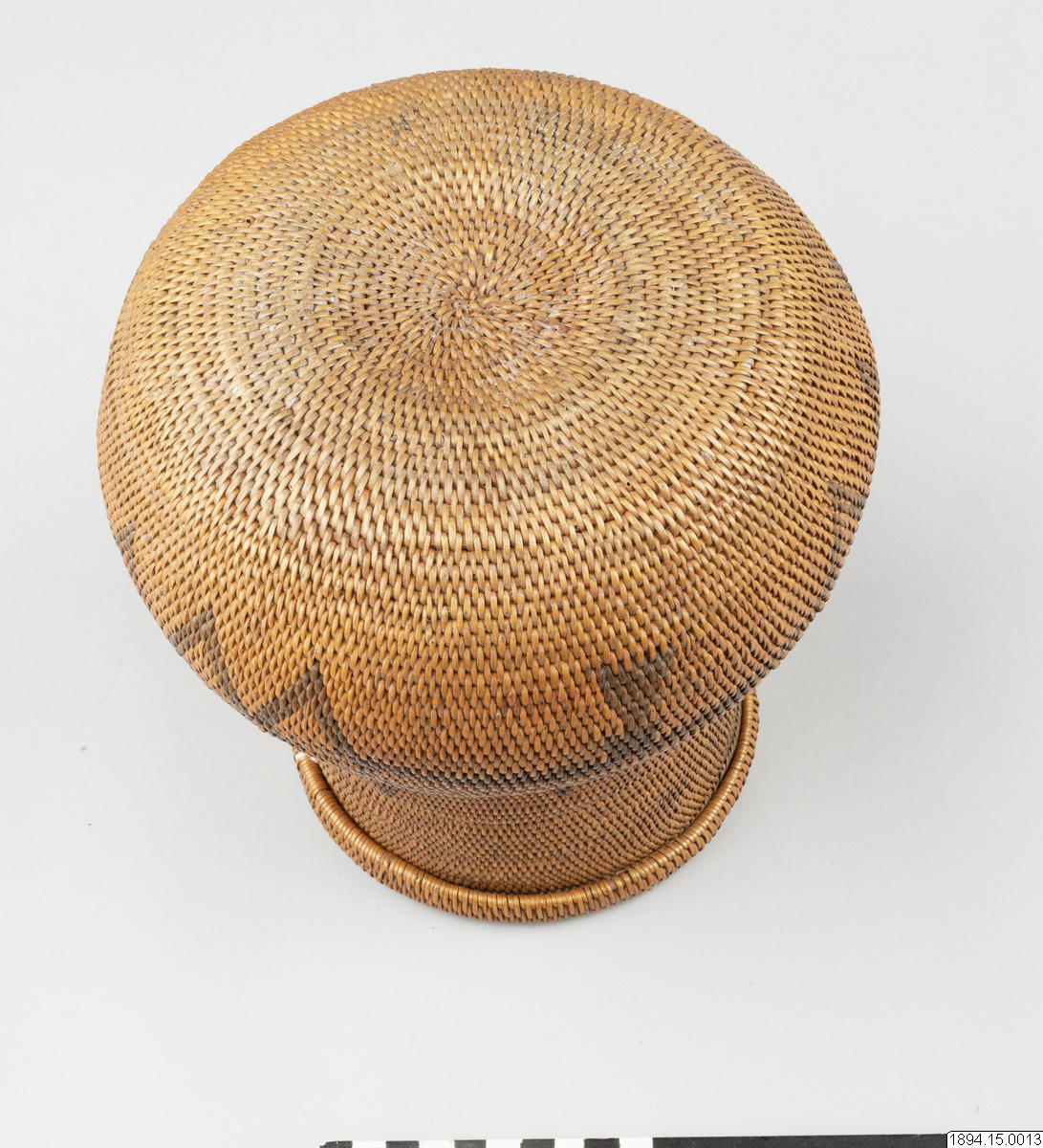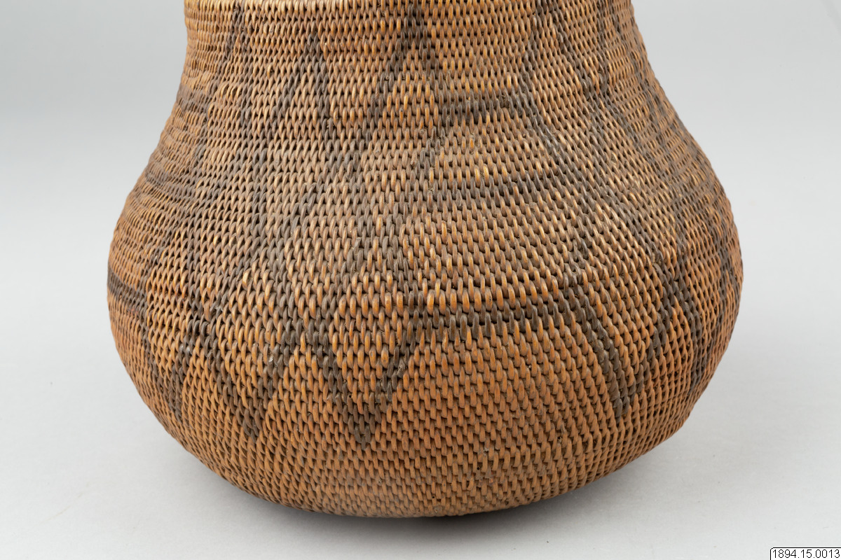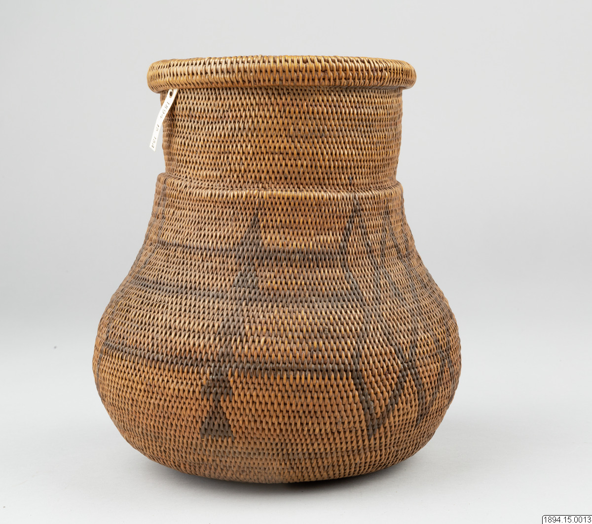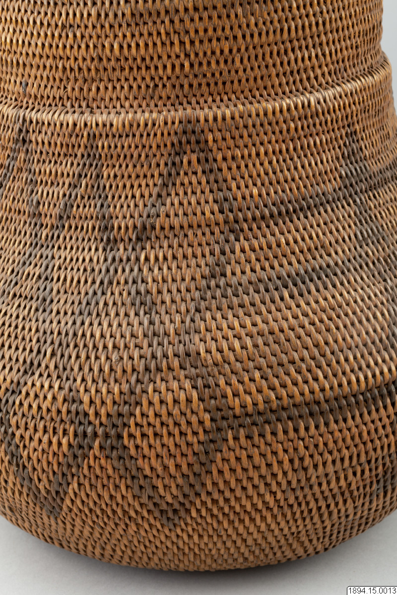 According to the general catalogue: Mo-Kenge-Basket with lid. Made from tree roots. Work of the Queen of the Marutse Kingdom. Curved, rounded lower part with cylindrical mouth part. The whole object decorated with a geometric pattern, darker in color than the tree roots. The lid is fairly flat and with folded edges. Height (basket and lid) 23 cm. Mouth opening Outer diam. 14 cm. The bulging part max. diam. 20 cm. Ma-Rutse. Ma-Rutse and the Marutse kingdom refer to what is today called the Lozi people and the Lozi kingdom (Bulozi in the Lozi language). 2019-06-18, Michael Barrett