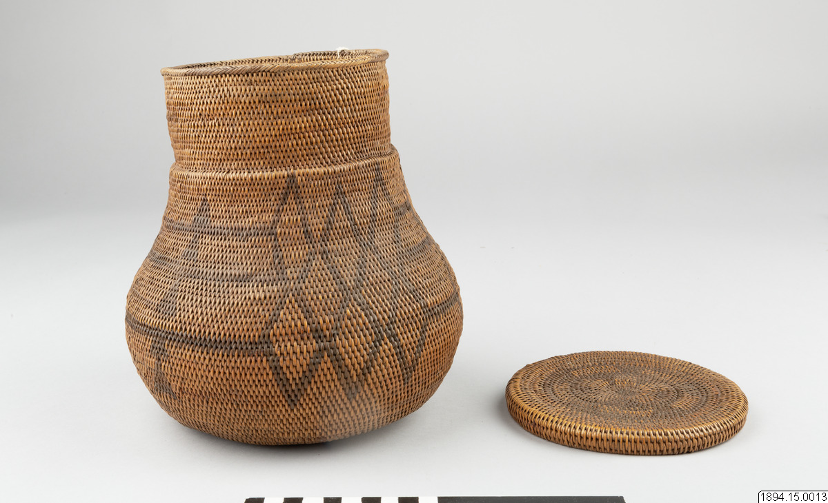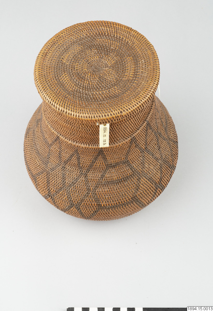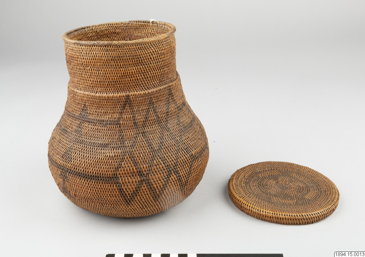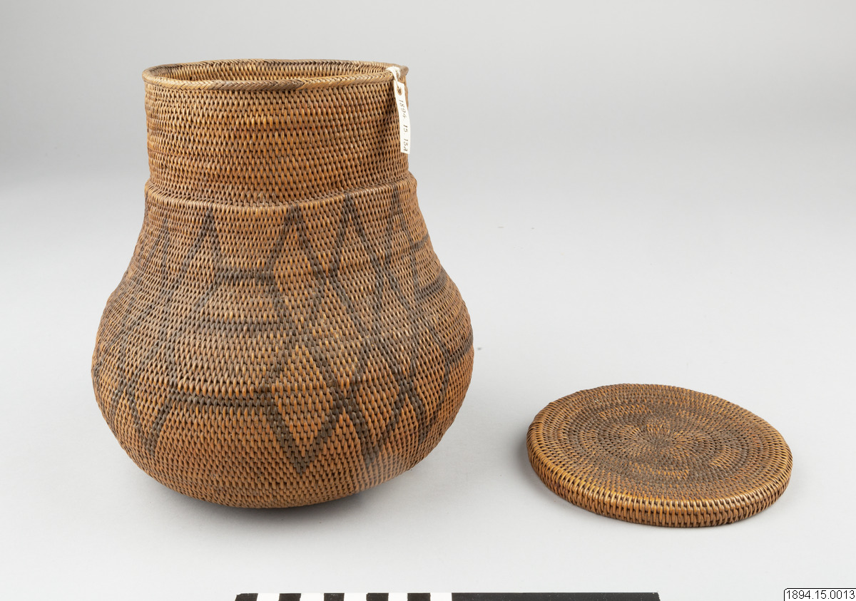 Enligt generalkatalogen: Mo-Kenge-Korg med lock. Tillverkad av trädrötter. Arbete av drottningen i Marutse-riket. Bukig, rundad underdel med cylindriskt mynningsparti. Hela föremålet dekorerat med ett geometriskt mönster, mörkare i färgen än trädrötterna. Locket ganska plant och med nedvikta kanter. Höjd (korg och lock) 23 cm. Mynningsöppning Yttre diam. 14 cm. Det bukiga partiets max. diam. 20 cm. Ma-Rutse. Med Ma-Rutse och Marutse-riket avses det som idag benämns lozi-folket och Lozi-riket (Bulozi på lozi-språket). 2019-06-18, Michael Barrett