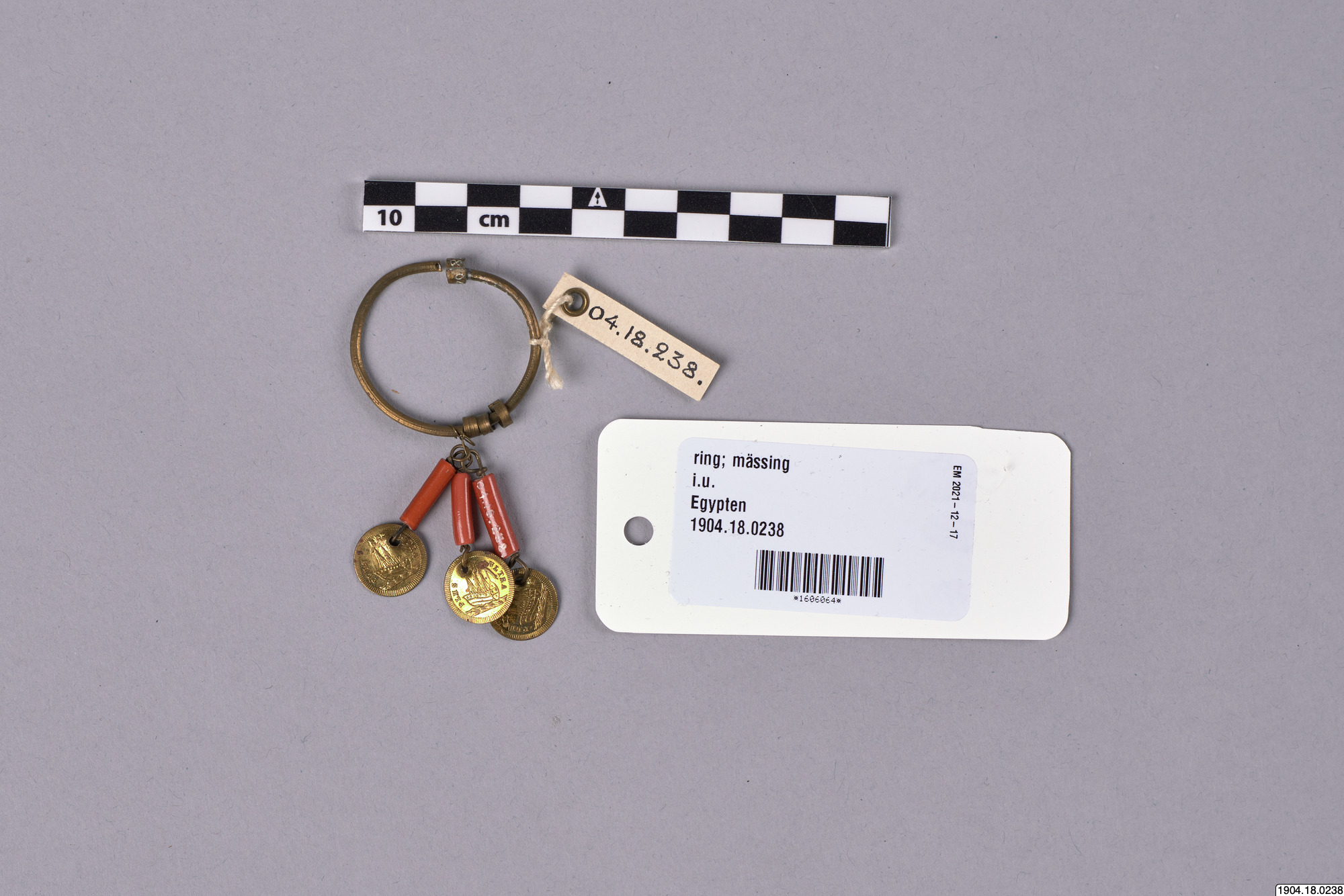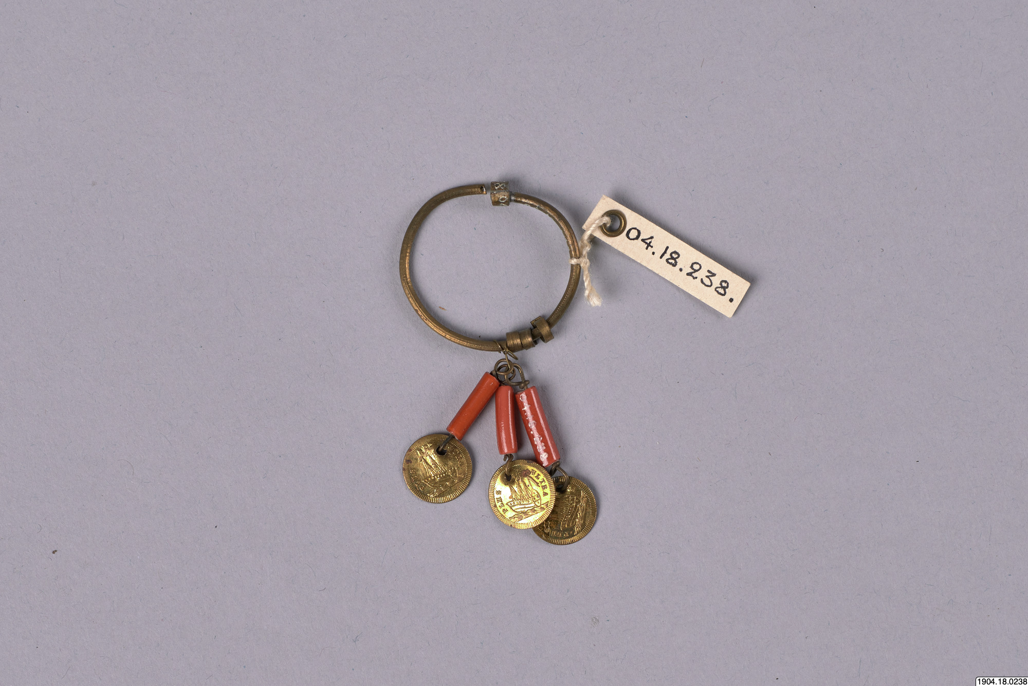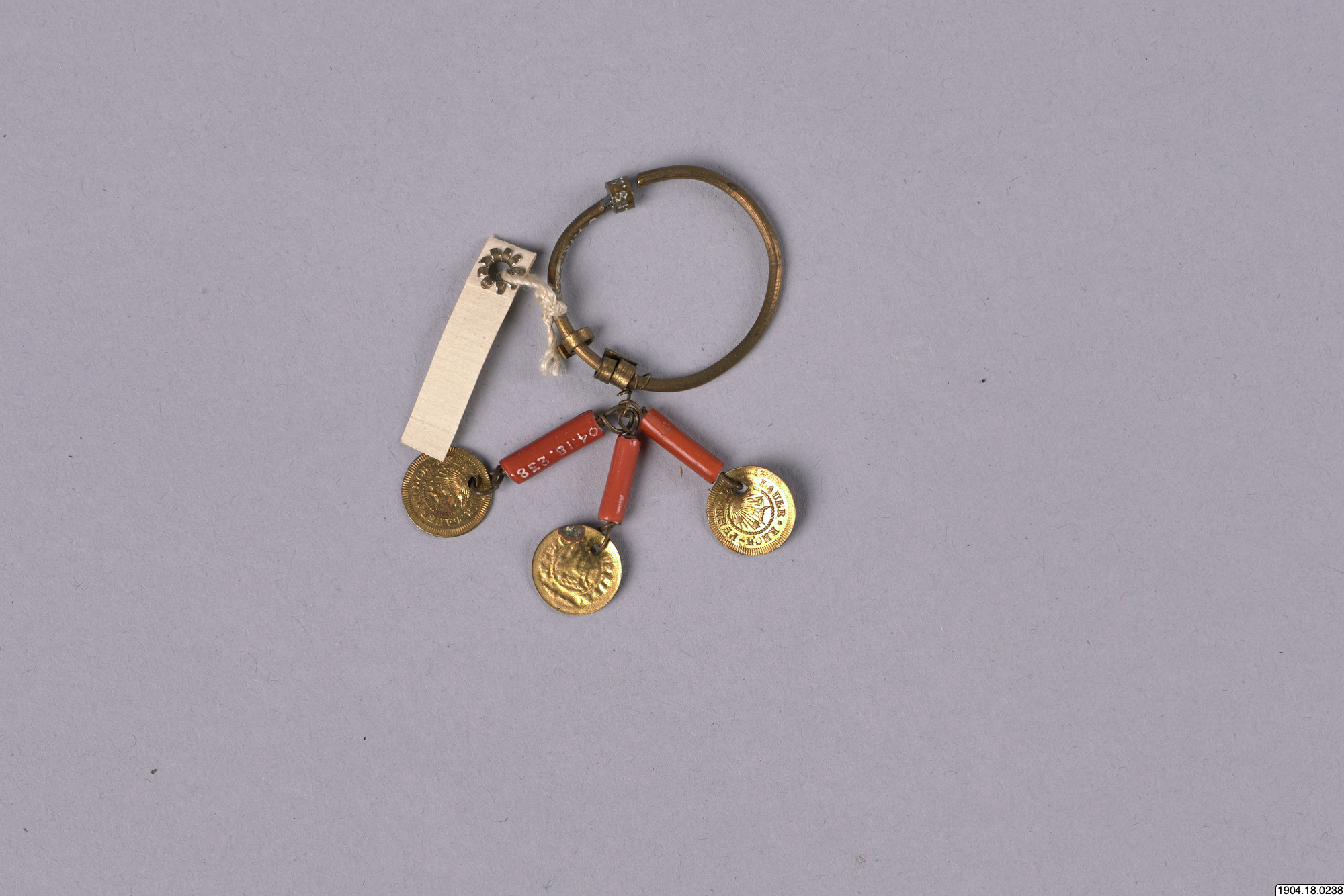 • Näsring av mässing med mässingspärlor och hängande glaspärlor med jetoner.