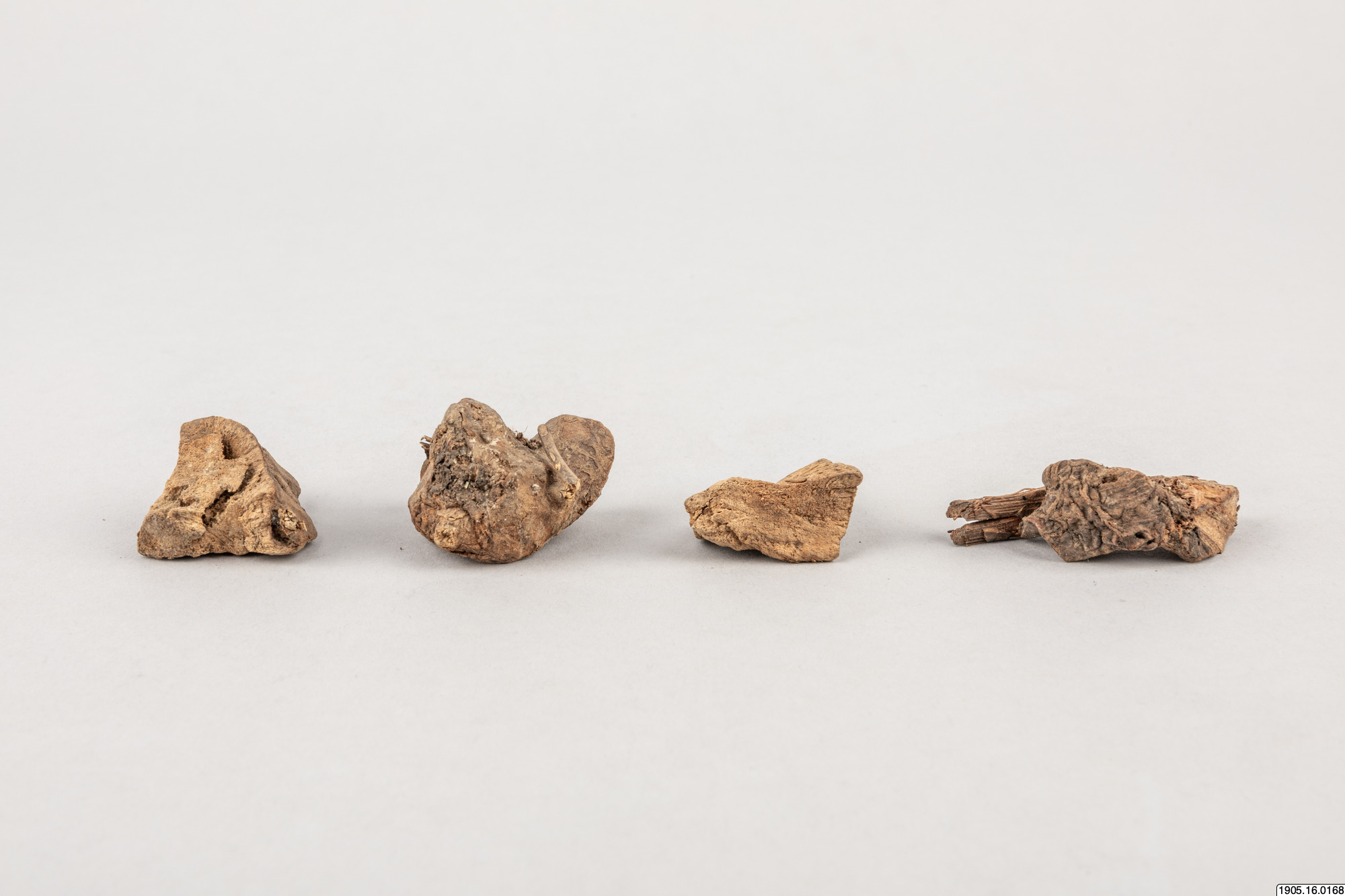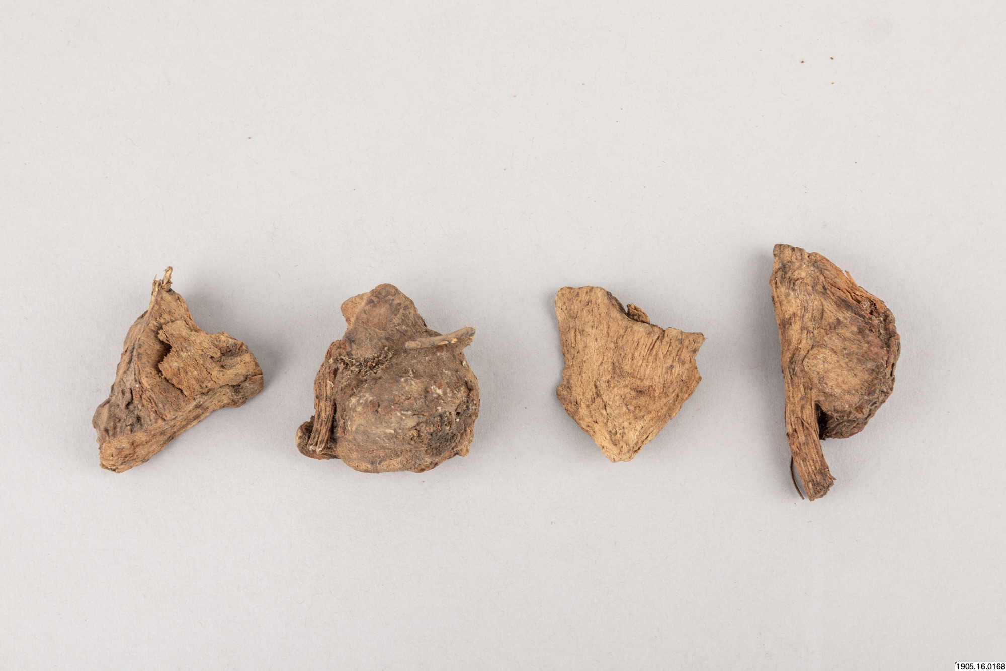 Mauzanilla ( Loricaria stenophylla Wedd). Jrickes kokad i vatten mot kolik. Hämtas från obrajes, Denna senare uppgift antagligen lögnaktig. 4 bitar av brun9äppleliknande fruk Etikett med nr och föremål påträffade åtskilda 1959. Mått: Maxådiam. 4 em. Köpt 'i La Pz, [ocr]