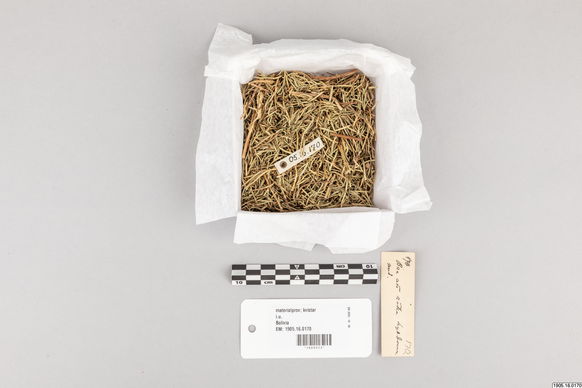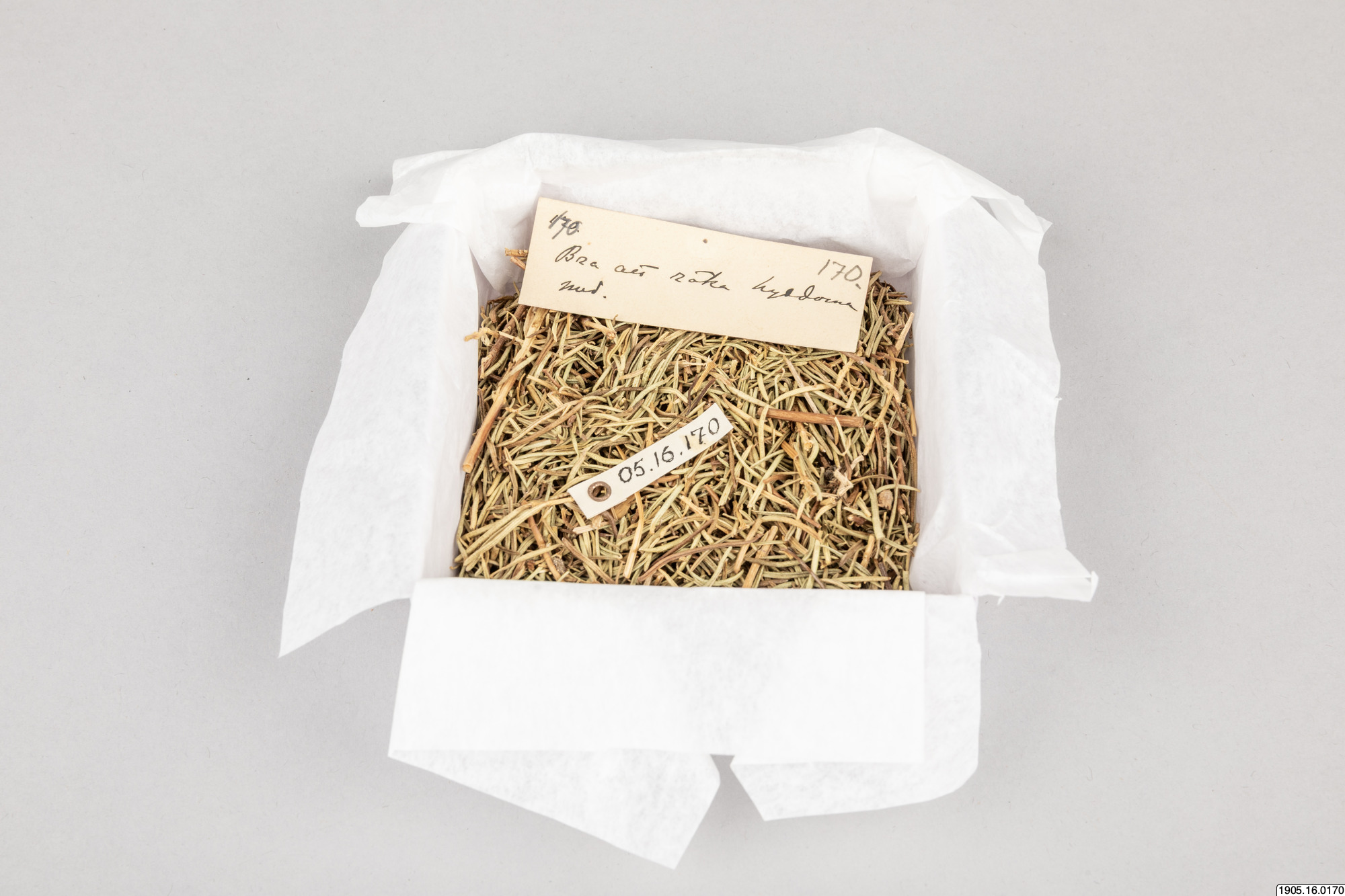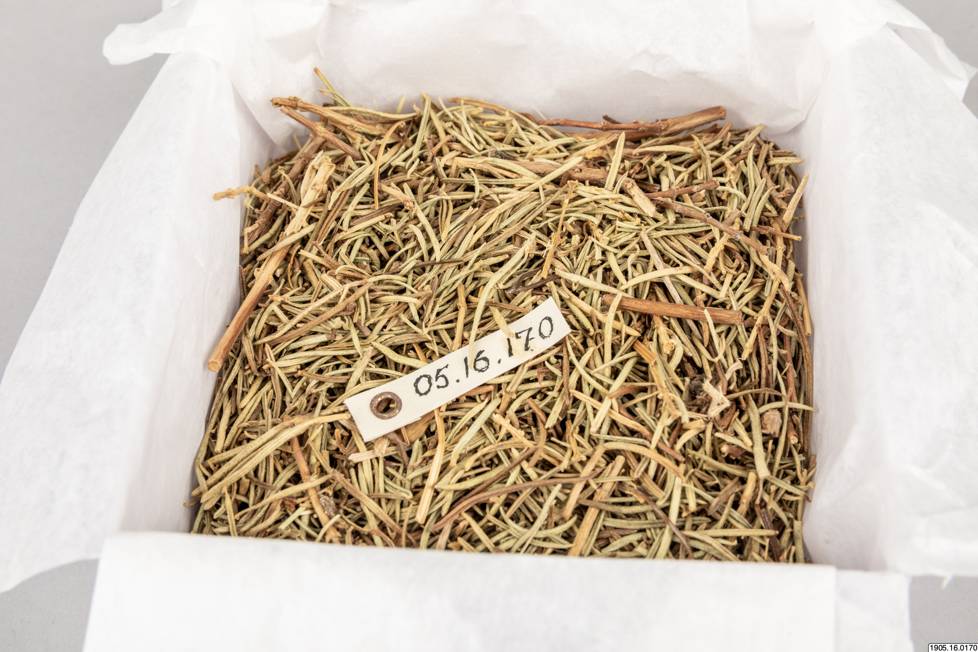 Romero. Kvistar och blad av Rosmarinnus officinalis L. Europeisk. Användes för att röka hyddorna. Barrliknande växtdelar. Hämtas från Copalabana. Köpt i [ocr]