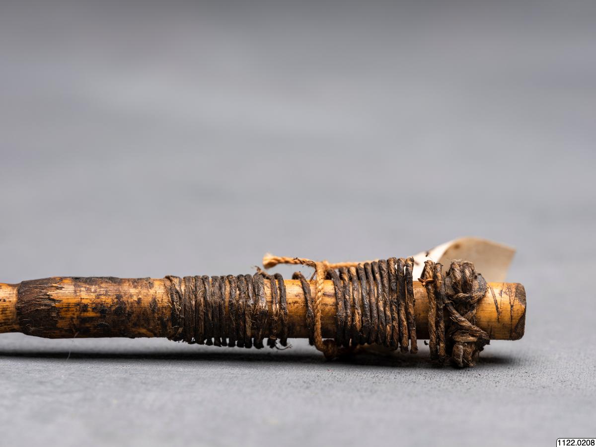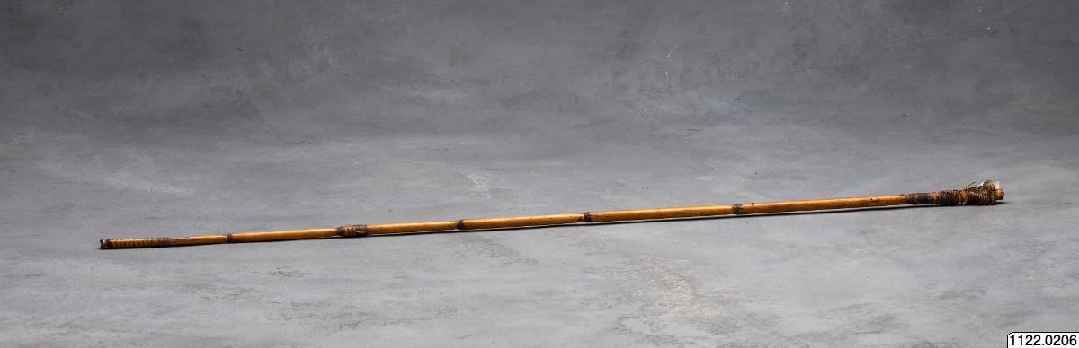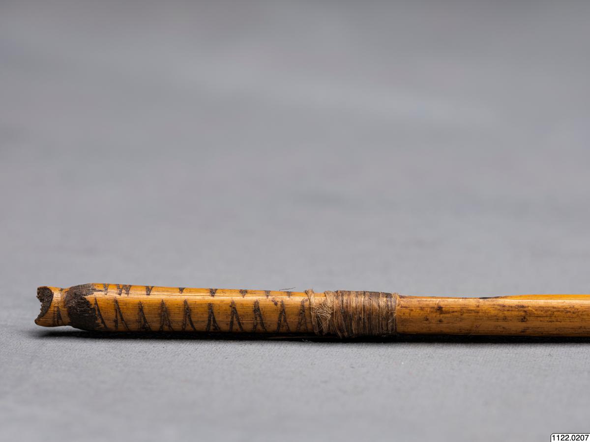 • 3 träspetsar i rörskaft. Skaftet är nedtill prytt med sniderier och försett med flygfjädrar. Längd: 82 cm [ocr]