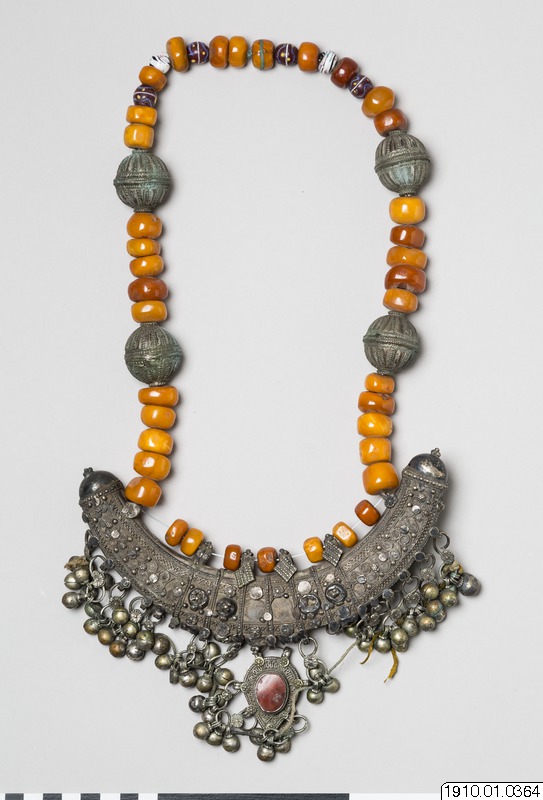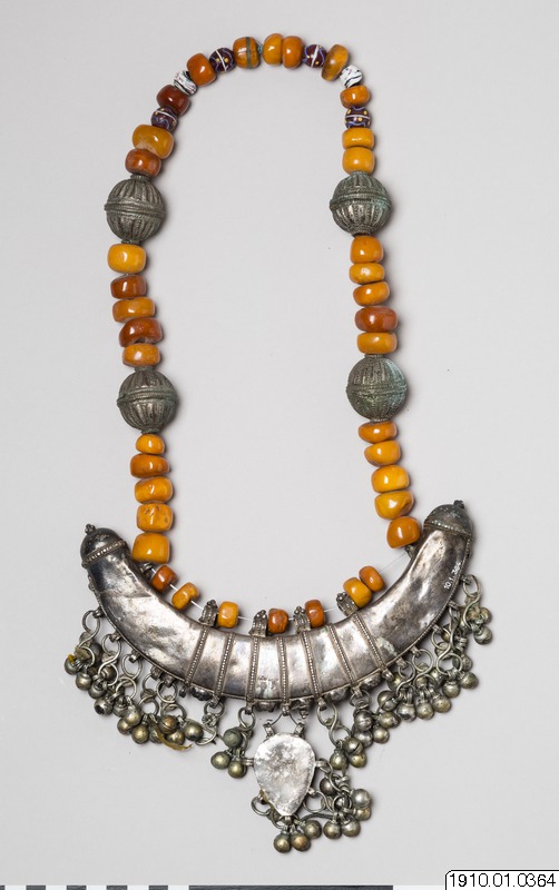 • Bröstsmycke av silver med kedja av bärnstenspärlor. [ocr]