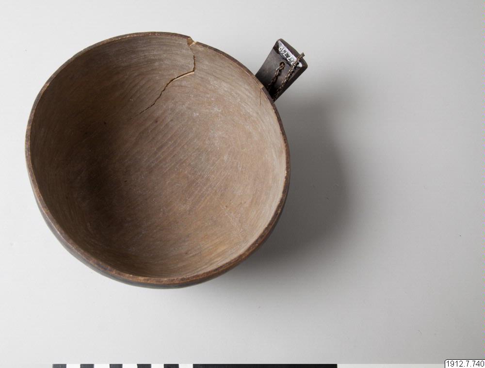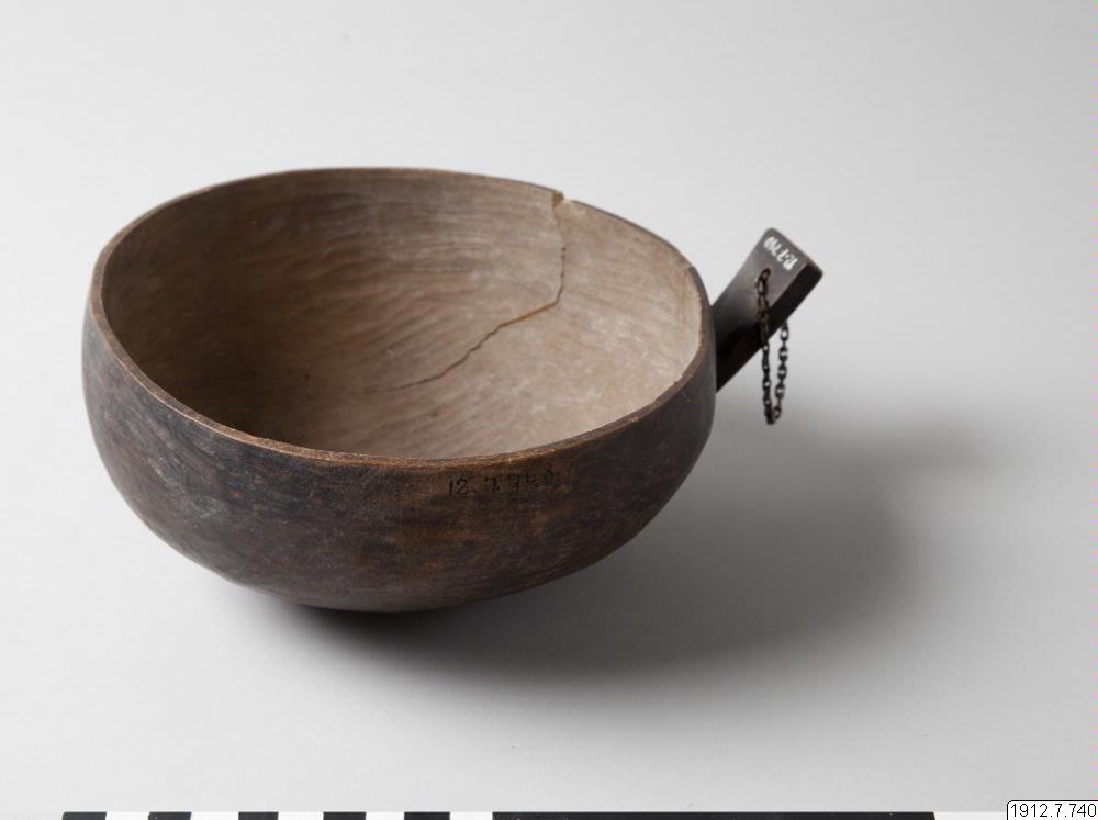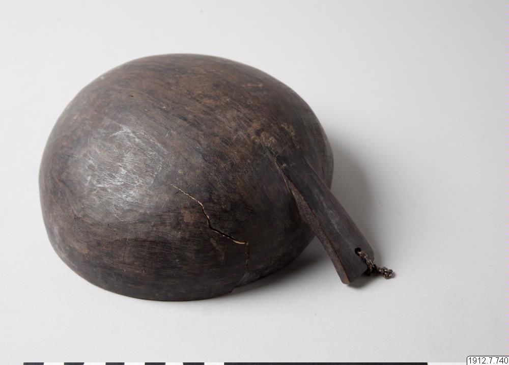 Ätskål, ,"mvanzi". Av trä, med handtag. Till formen erinrar den om en låg tekopp fast betydligt större än en sådan. Kort kedja i handtaget, för upphängning.