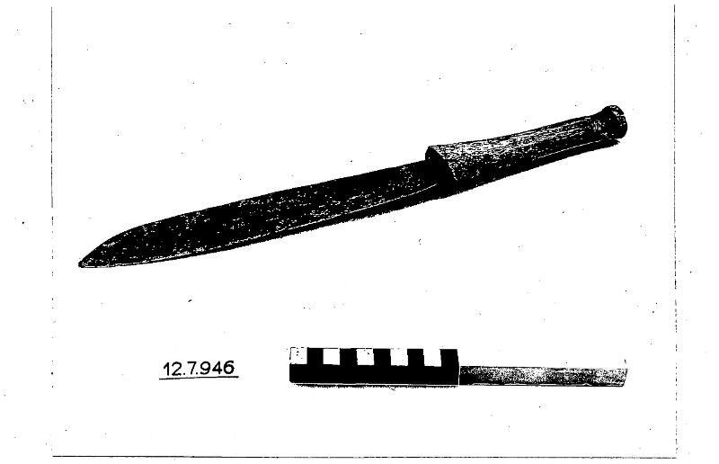 • Kniv. Med 2,5 dm långt blad, eneggad, ytterst grovt tillverkad.