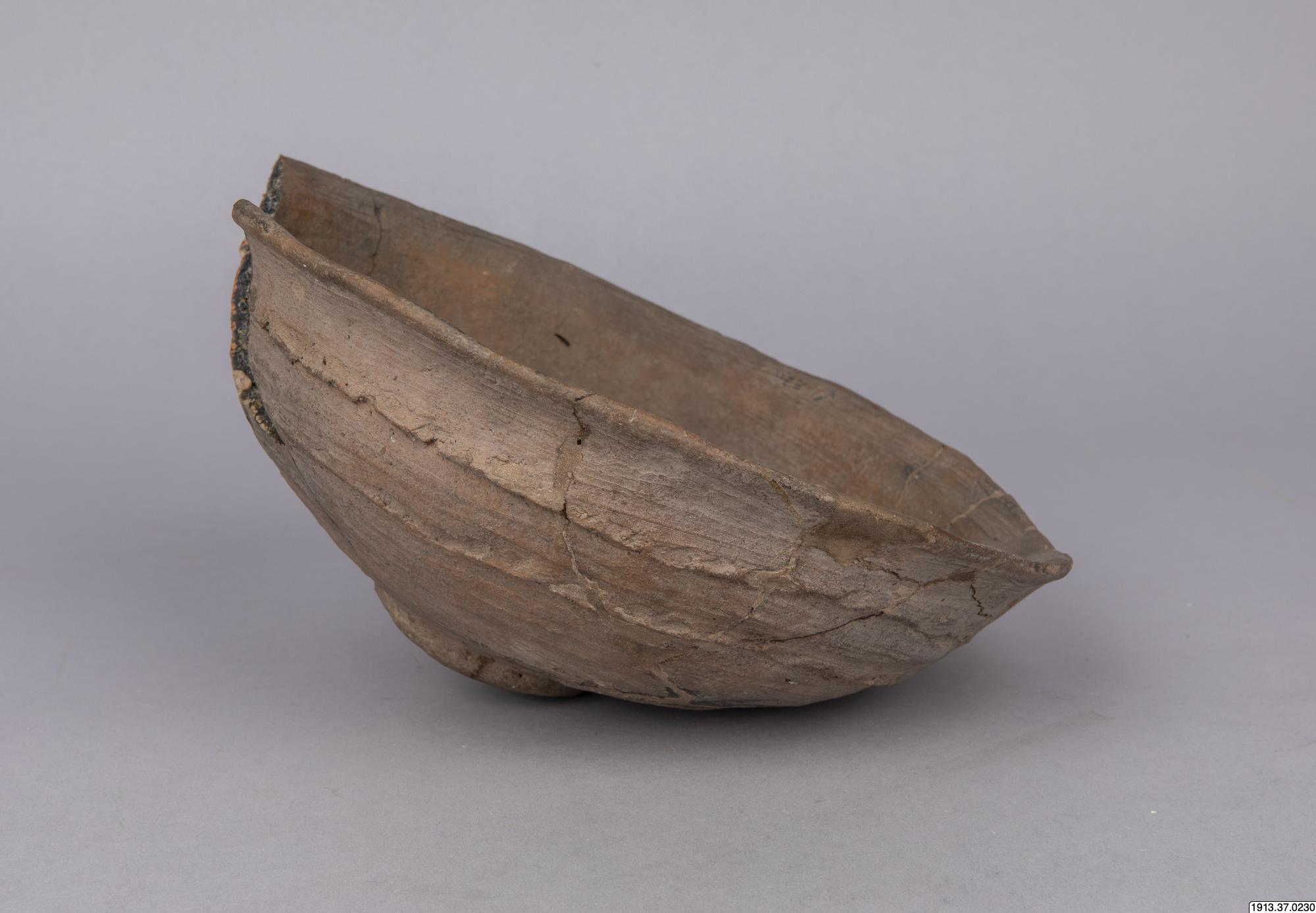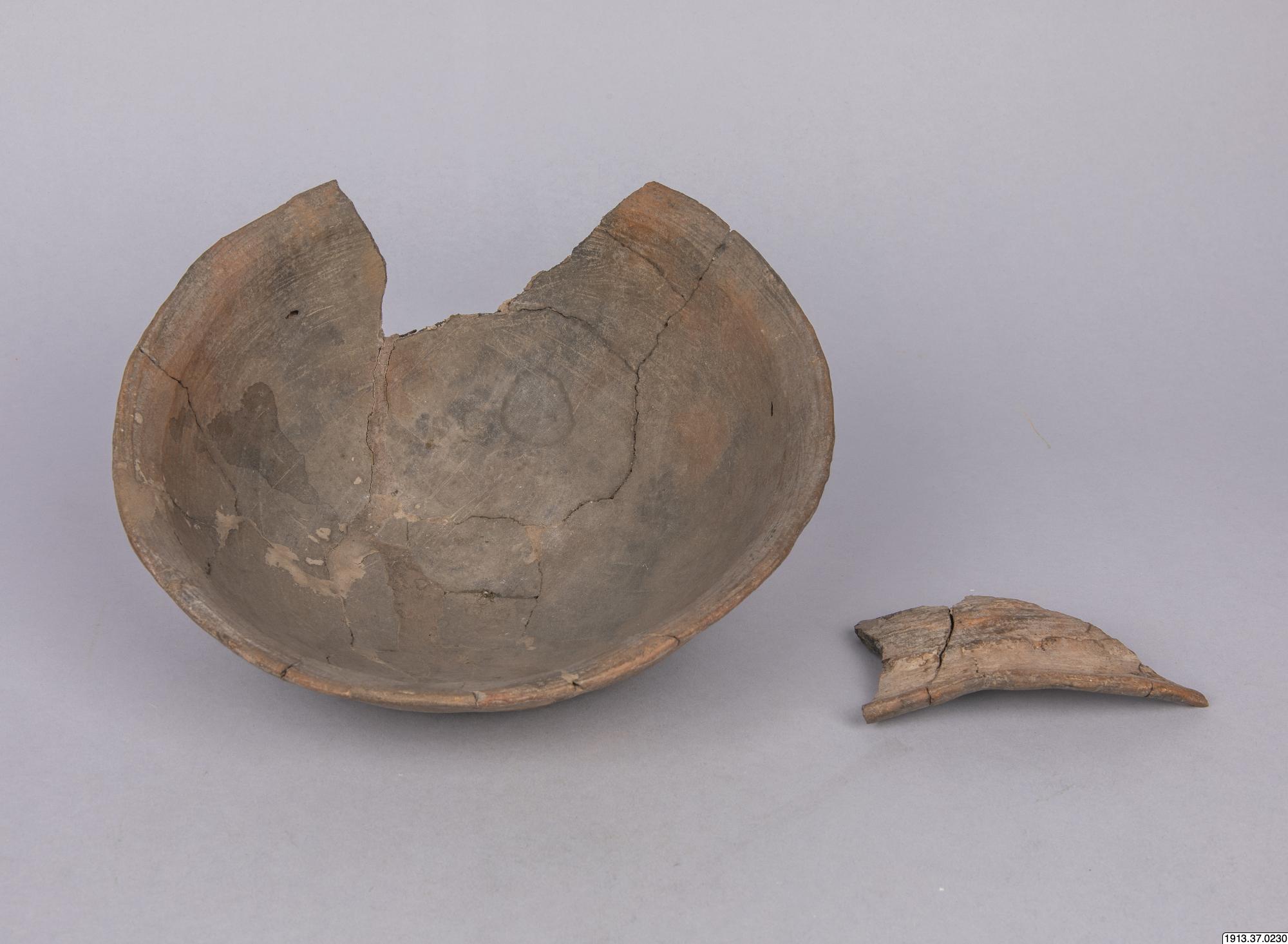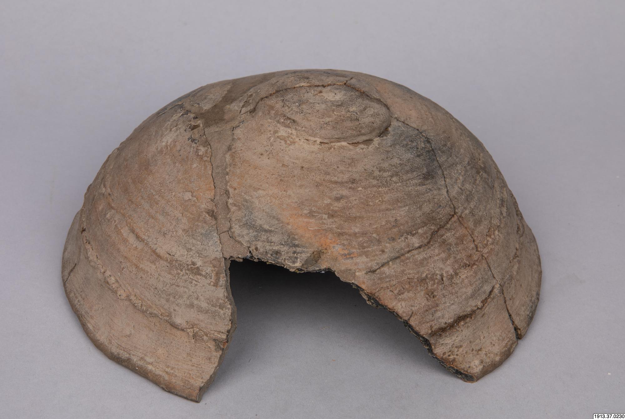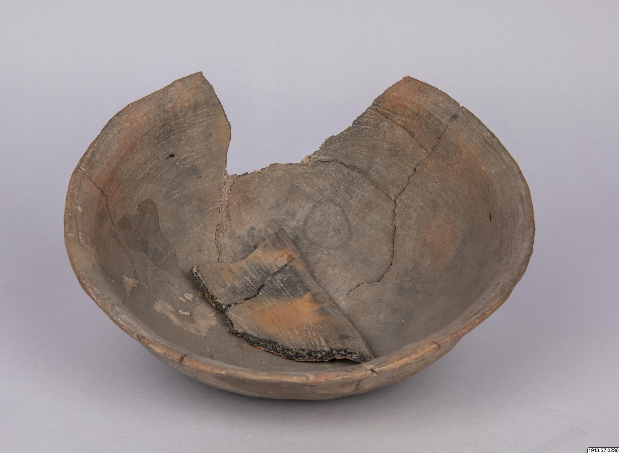 • Av brunt gods med mörkare flammor. Halvsfärisk form med liten plan bottenyta eller platta, och svagt utsvängd mynningskant. Rul- [ocr]