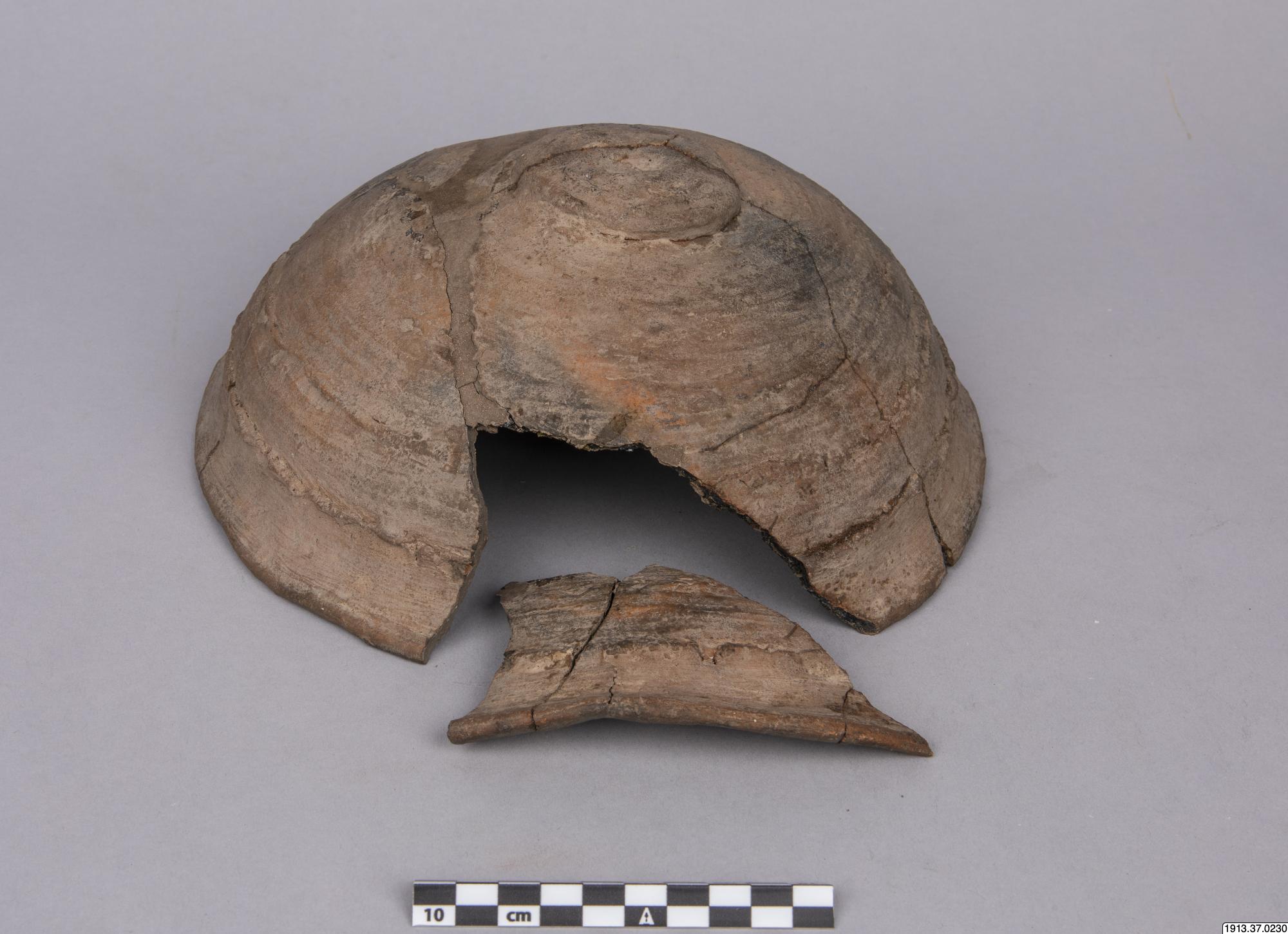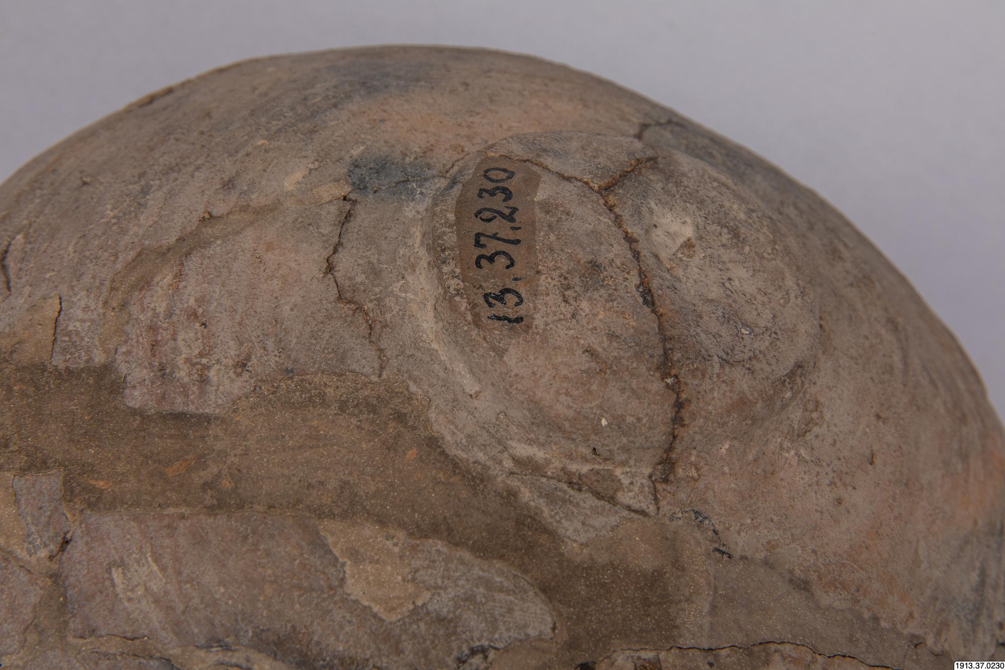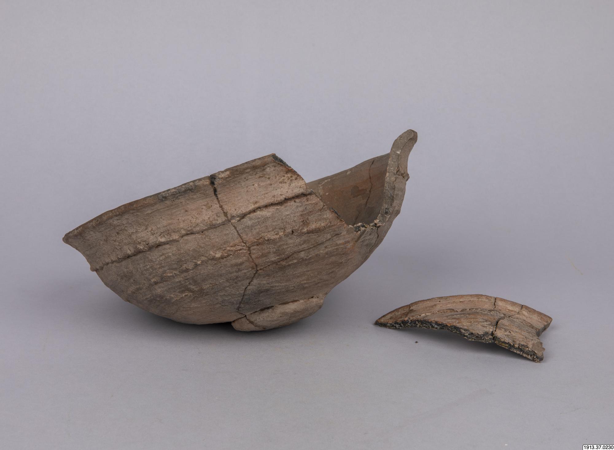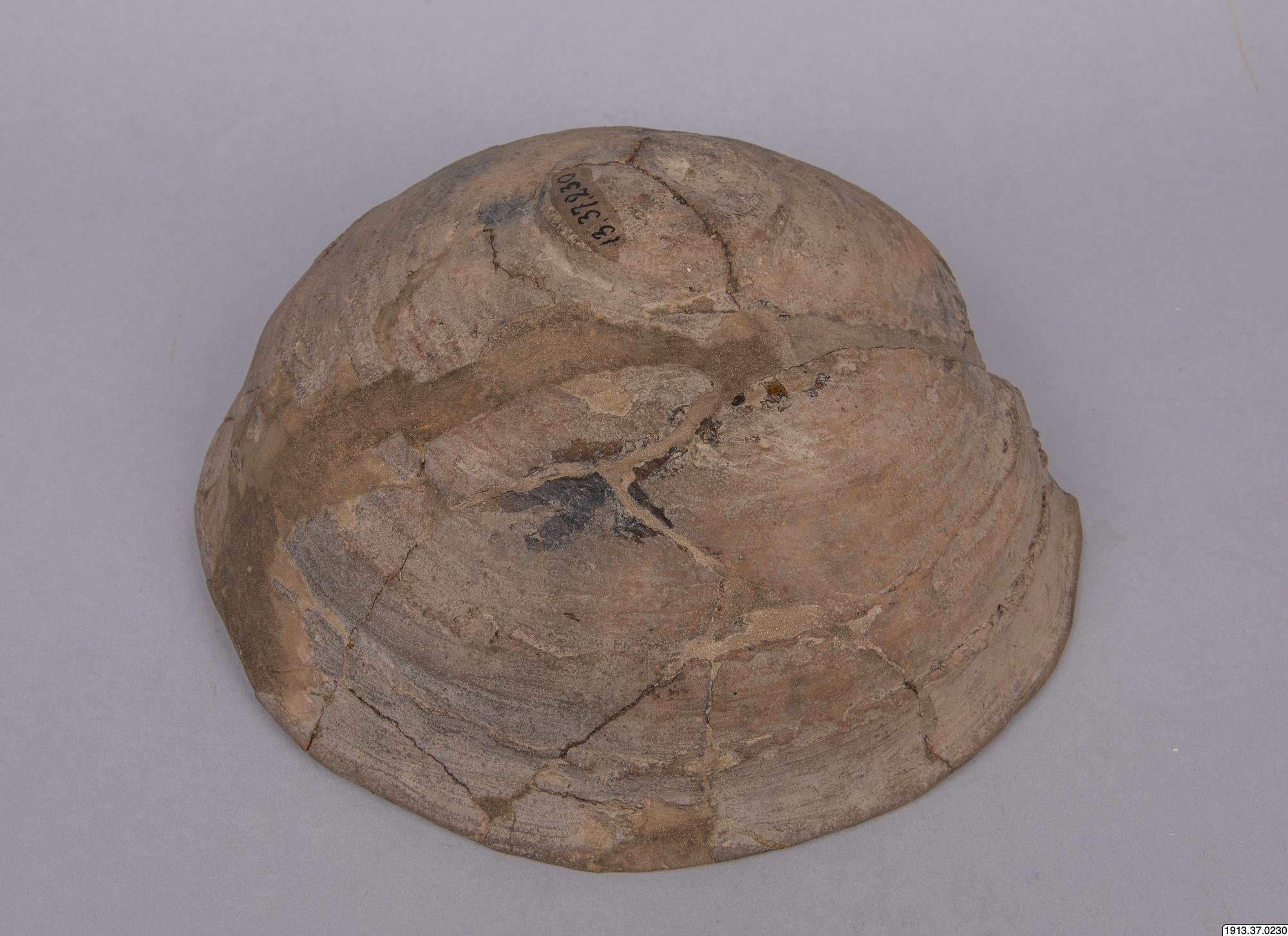 • Av brunt gods med mörkare flammor. Halvsfärisk form med liten plan bottenyta eller platta, och svagt utsvängd mynningskant. Rul- [ocr]