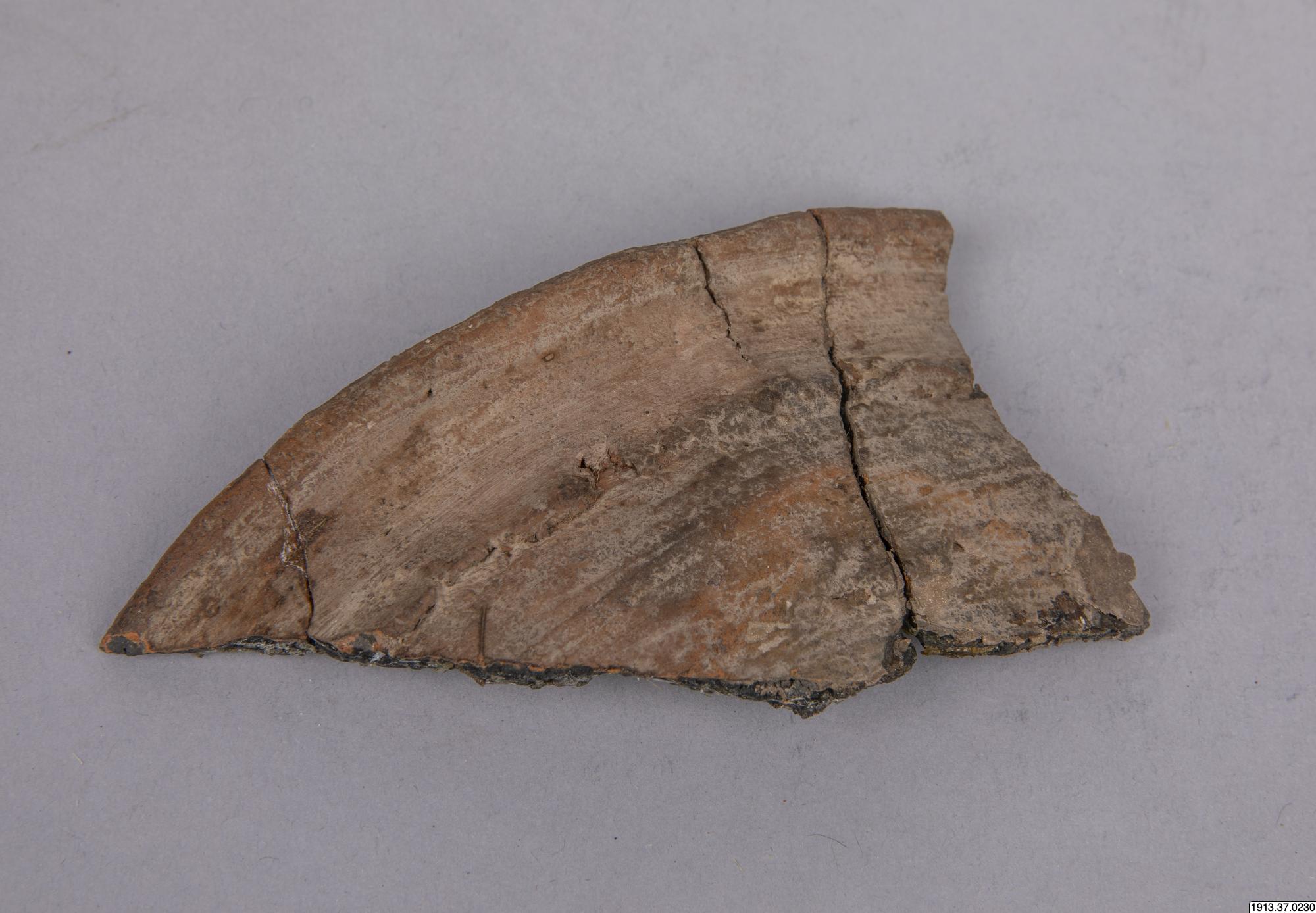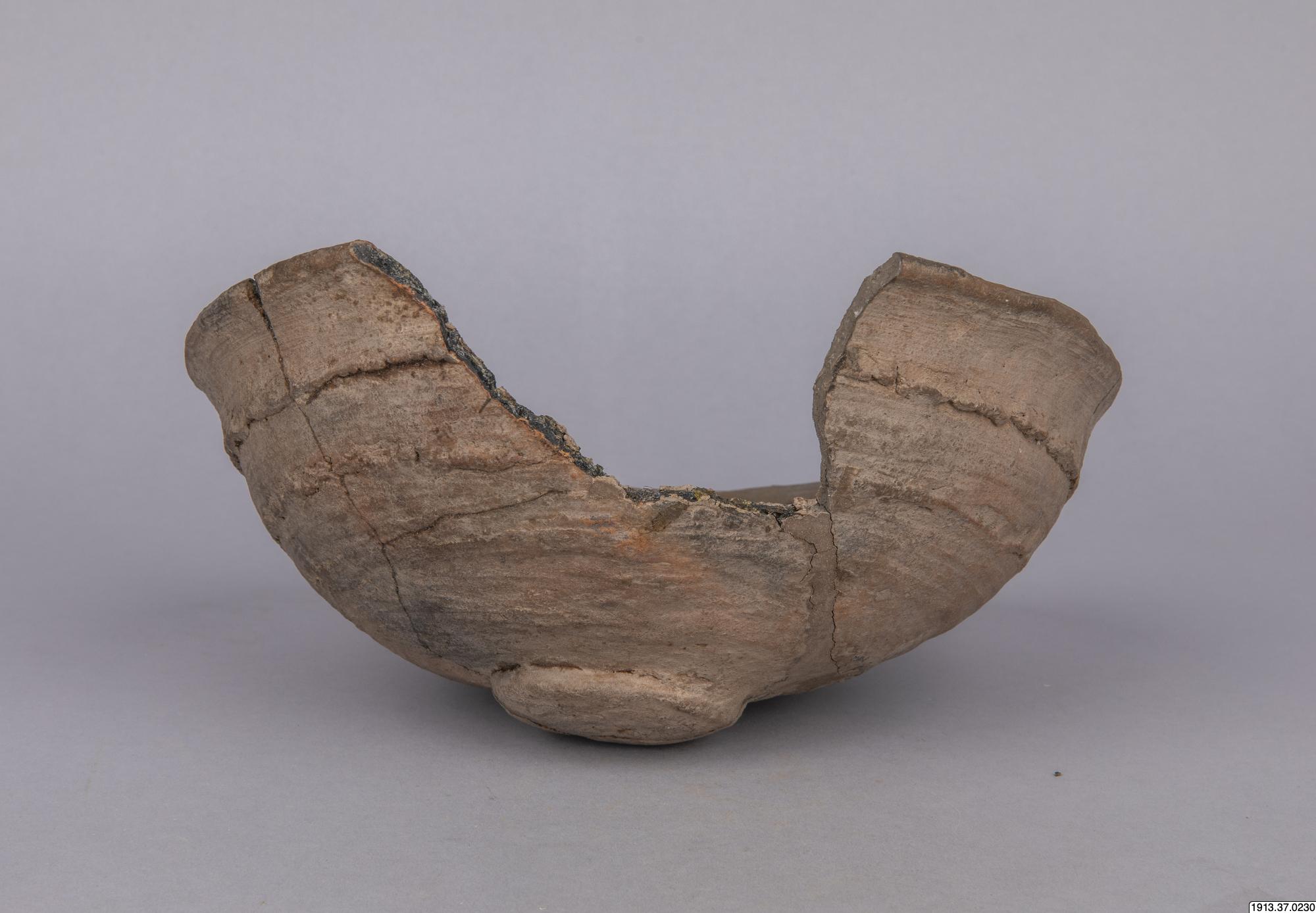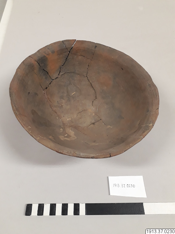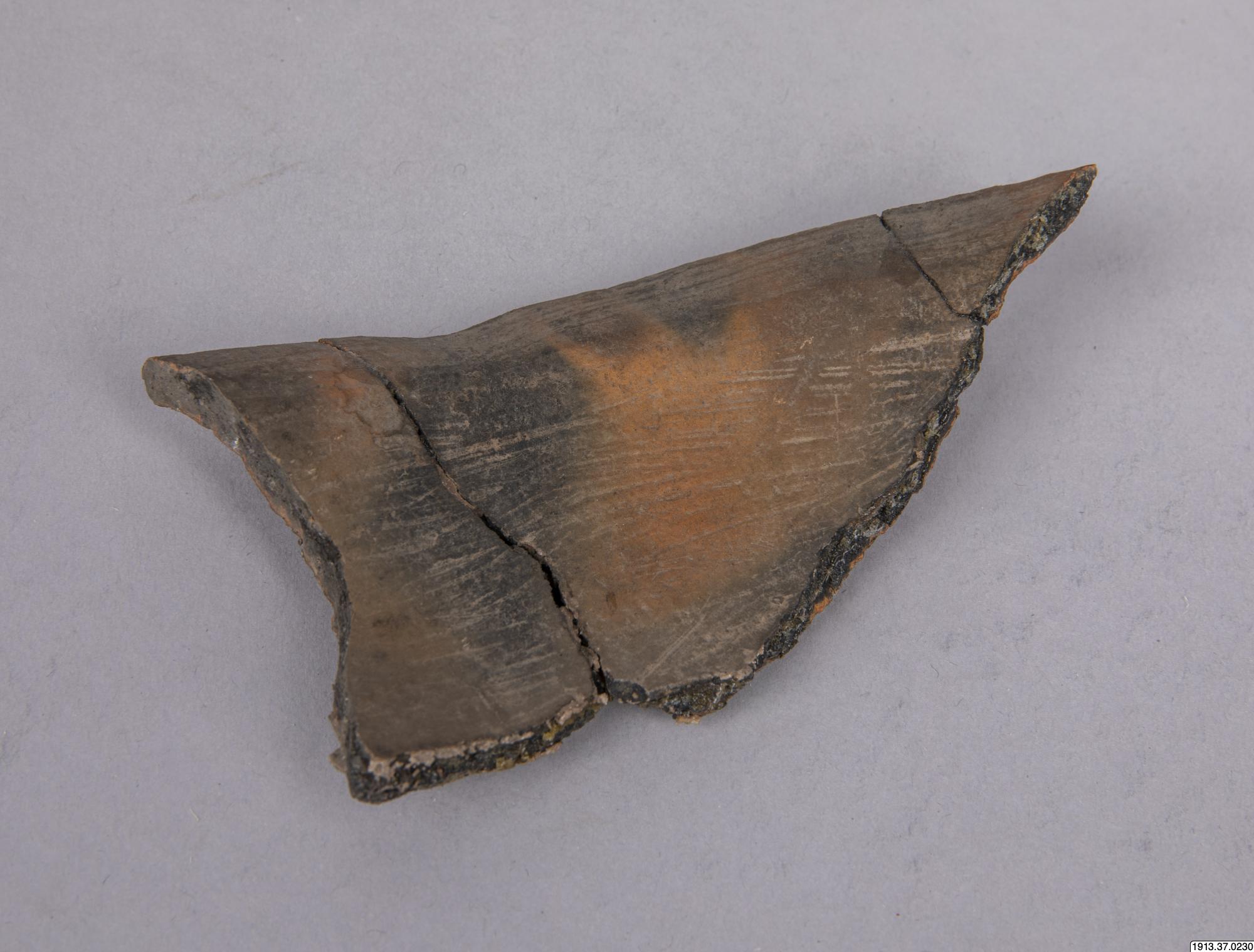 • Av brunt gods med mörkare flammor. Halvsfärisk form med liten plan bottenyta eller platta, och svagt utsvängd mynningskant. Rul- [ocr]