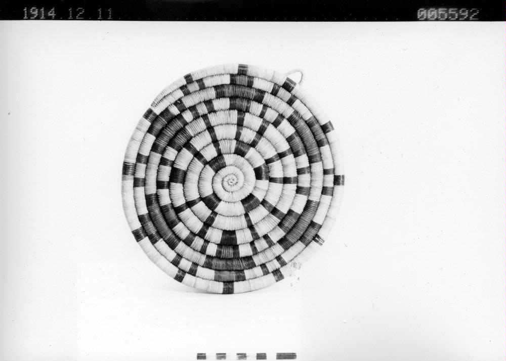 Plan, av mycket tjocka rullar, dekor i. brunt, rödbrunt och gult. På kanten en upphängningsögla. Rullarna bestå av fiberbuntar sammanhållna och fästade vid närmast föregående varv med lindning. På en etiket står "Mesa",ursprungsorten torde vara någon pueblo, antagligen hopi. Diam.: 27.3 cm. [ocr]
