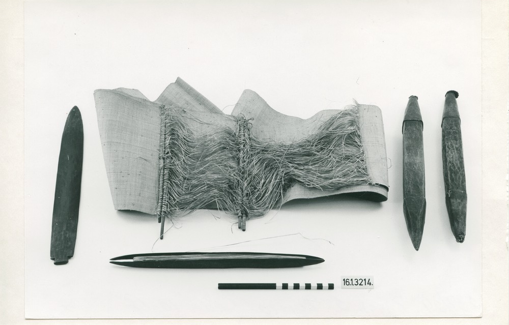 Vävstol med ofärgad bastvävnad. En skyttel och tre andra tillbehör av trä. Jfr. Edge Partington I 160. Santa Cruz ? Nya Hebriderna? Tapatyger från olika håll. 3215 3244 [ocr]
