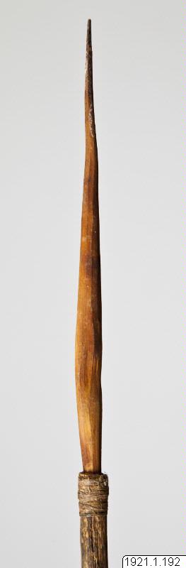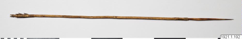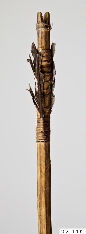 Pil. Fågelpil, "tjunus", "kjunus". Brun träspets, rundad utan hulingar. Skaft av lätt, märgfylld gren. Två styrfjädrar. Skaftets båda ändar kort lindade med bast.