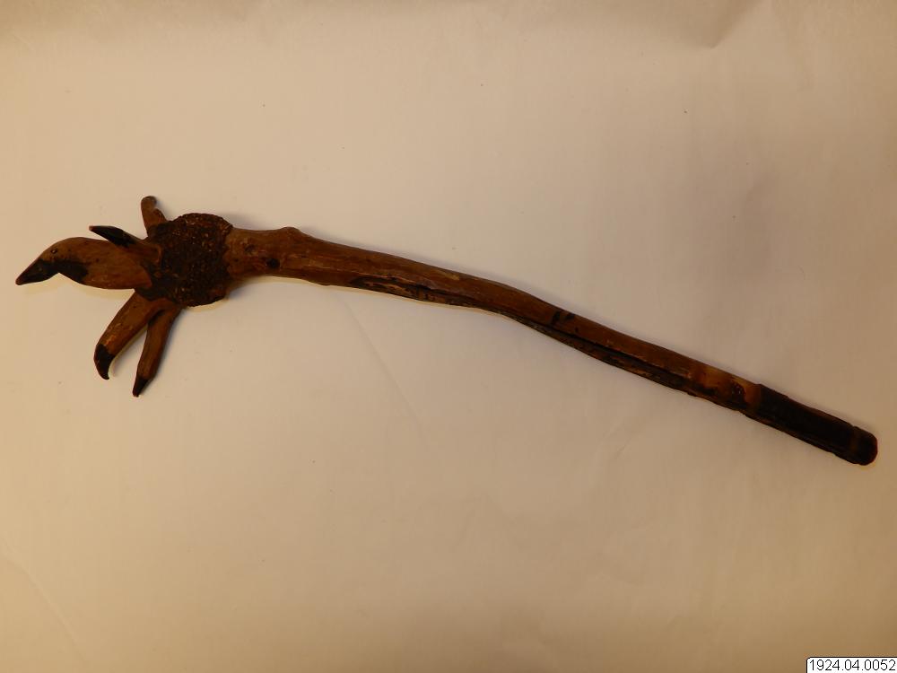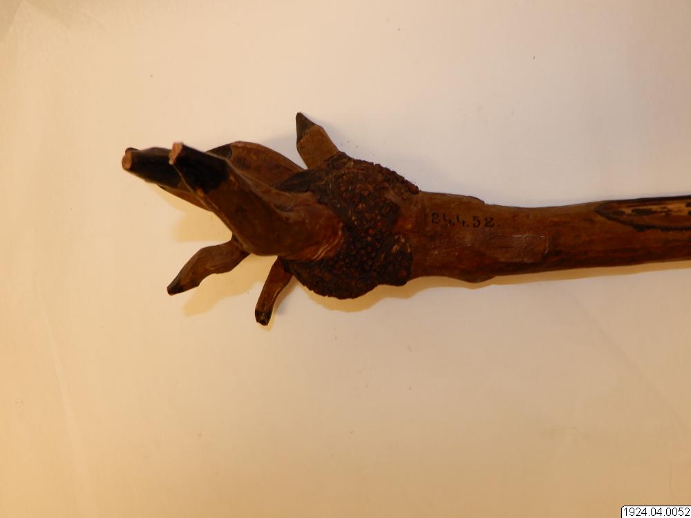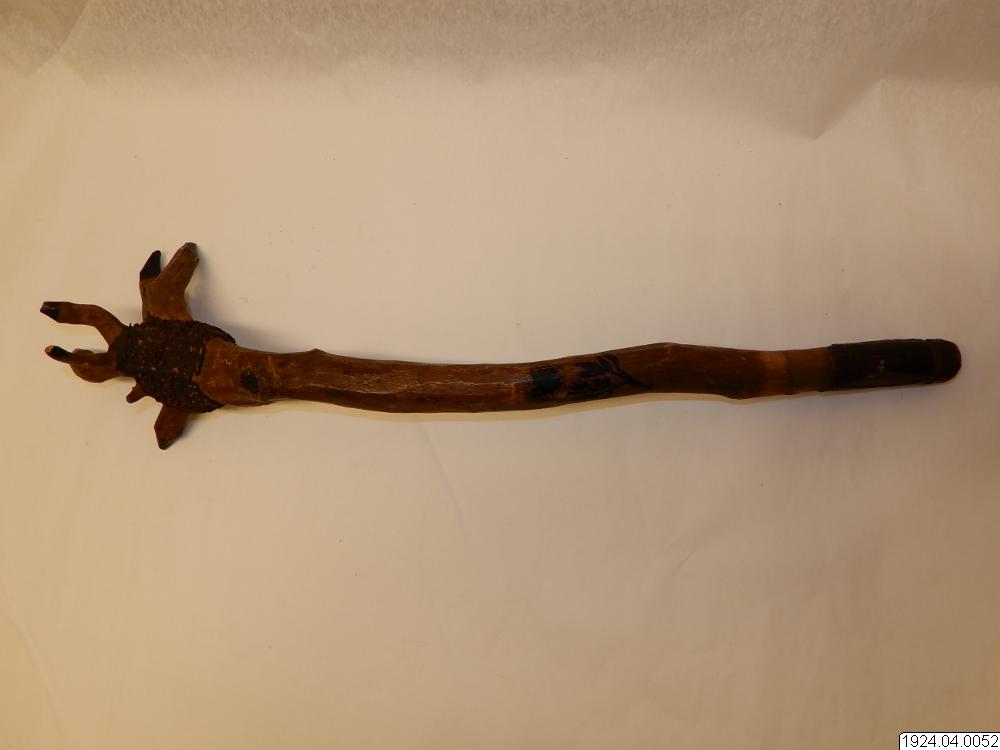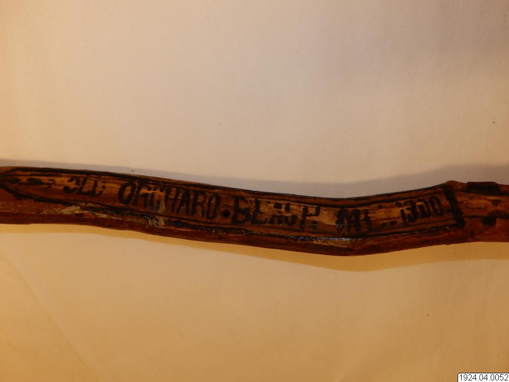 Knölarna gå ut i spetsar, ytterst svartmålade. På stammen målat i svarta bokstäver "Old Orchard Beagp. M.L. 1900". Bark kvarsitter ytterst::< :handtaget. Liknar bark av körsbärsträd. Längd:,51 cm. [ocr]