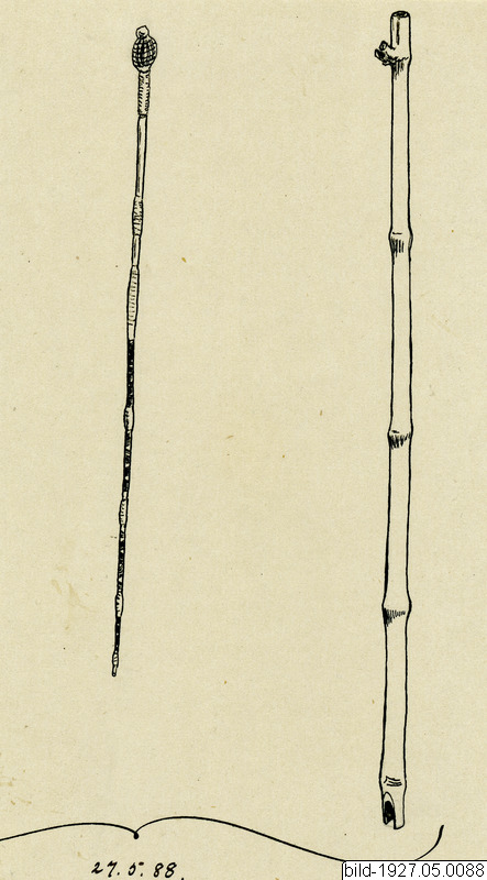 (se fig.) med sugrör, (se fig.) varmed öl drickes ur det för ett dryckesslag gemensamma kärlet. Staven är ett rör med genomborrade leder, och i denna rörformiga stav medföres sugröret, instucket så, att filtret i den grövre ända, som stickes ned i ölet, skjuter upp ur staven. Filtret består av ett stycke rör, vars vägg skurits upp till smala spånor, vilka med bast sammanflätats till en spolformig sil, varefter ändarna av spånorna med snören surrats tätt omkring sugrörets ända, Det tunna sugröret förstärkes med en tät bastlindning i nästan hela dess längd. Stavens längd: 165 cm. Tjocklek mellan lederna: högst 2.2 cm. Sugrörets längd: 126.5 em. Se G. Lindblom i Ethnos 1941, 1-2, s. 48. [ocr]