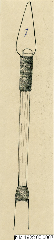 Pil för storvilt. Ovanligt lång. Klyka för strängen av "svartpalm", insatt i skaftänden och surrad med snöre. Skaft av cafla brava.: Pörskaft av svartpalm, instucketr"burrat som klykan. Spets av järn, äggformig, instucken, surrad Weil förskaftet (metalltråden tillsatt på museet). Mängd 205,5 cm. Pörskaftets längd 13,9 cm. Skaftets tjocklek 1,3 cm. Pörskaftets bredd 8 mm. Spetsens längd 3,8 cm. Bredd 1,3 cm. Stam: [ocr]