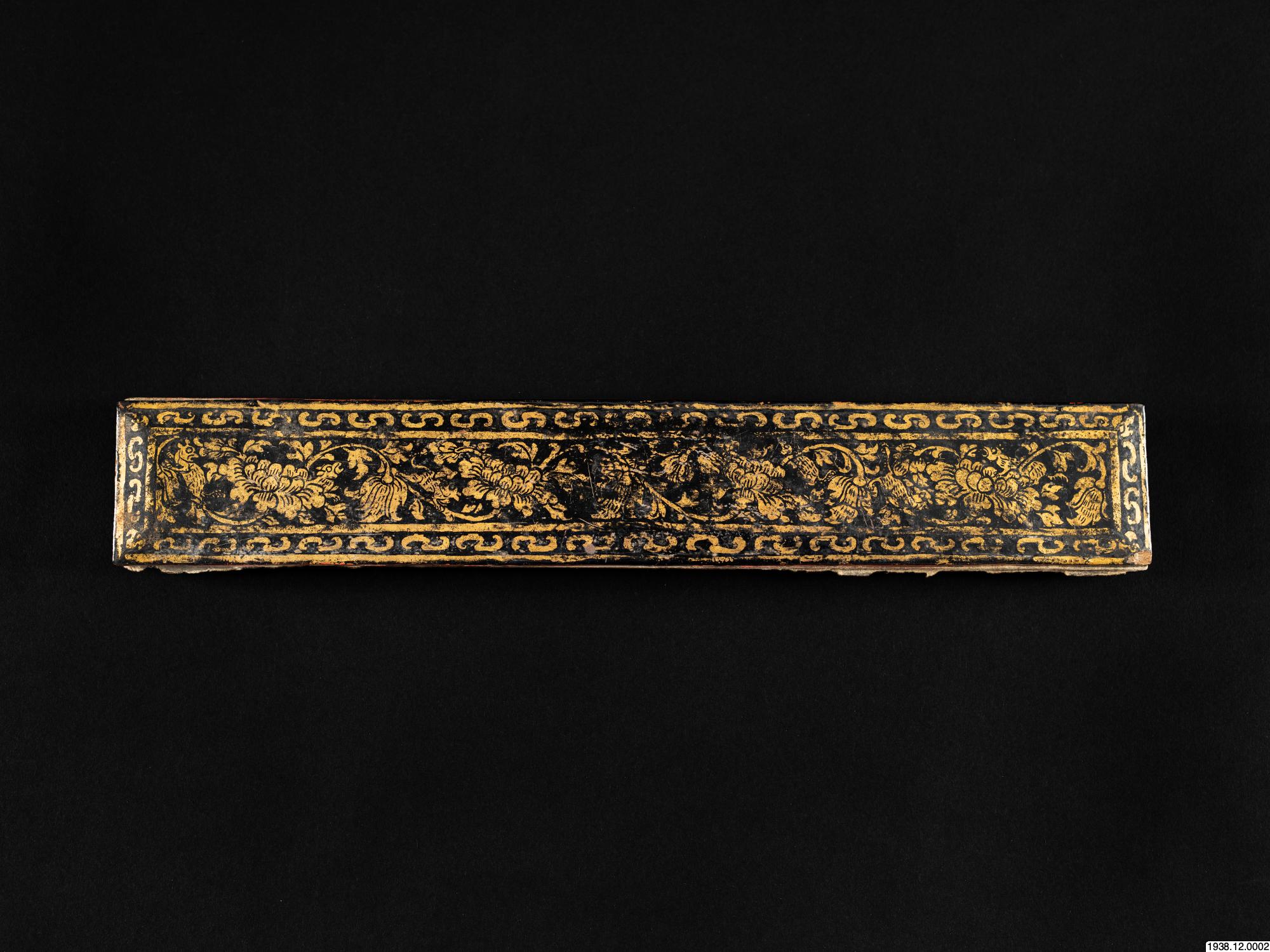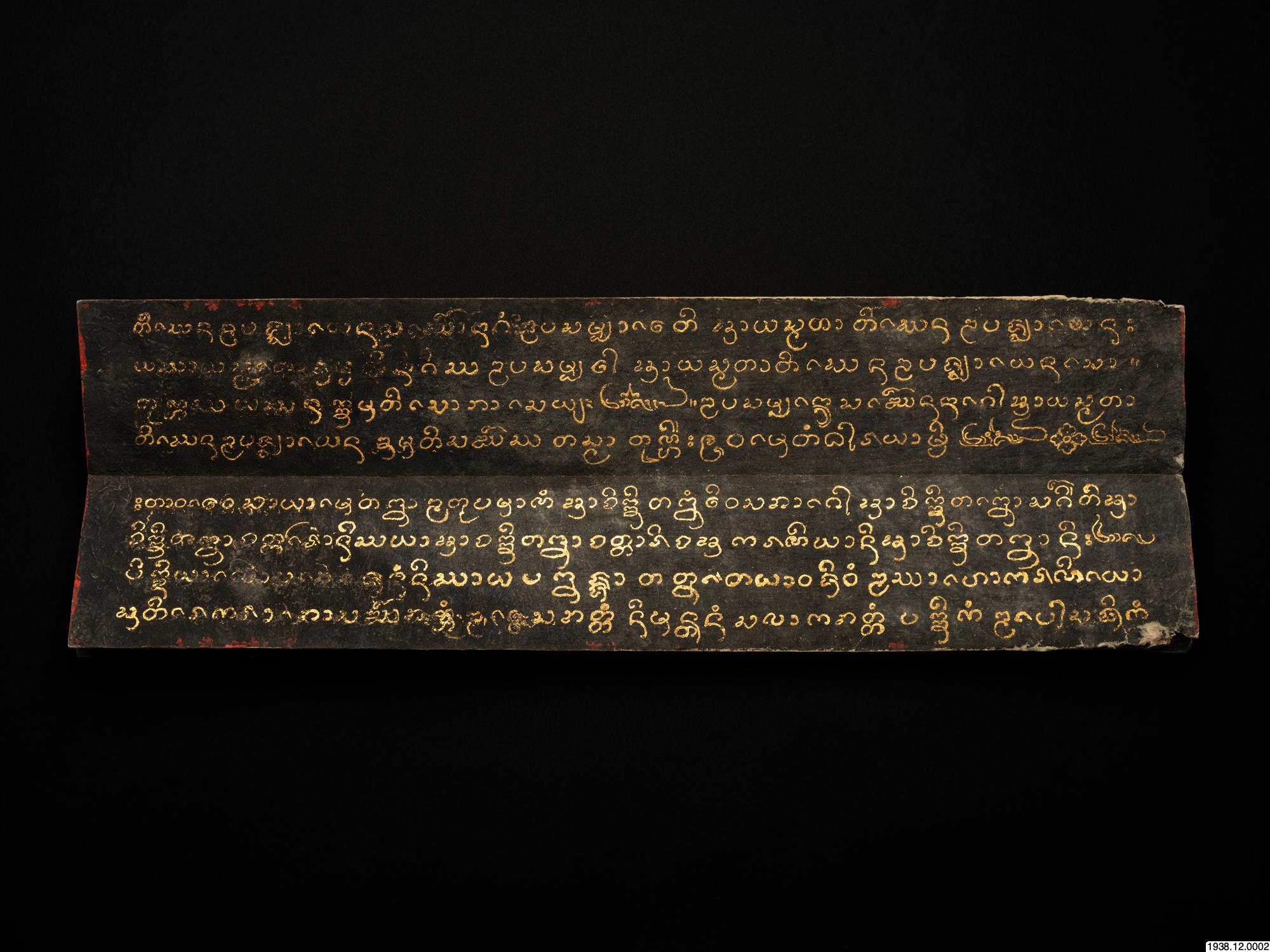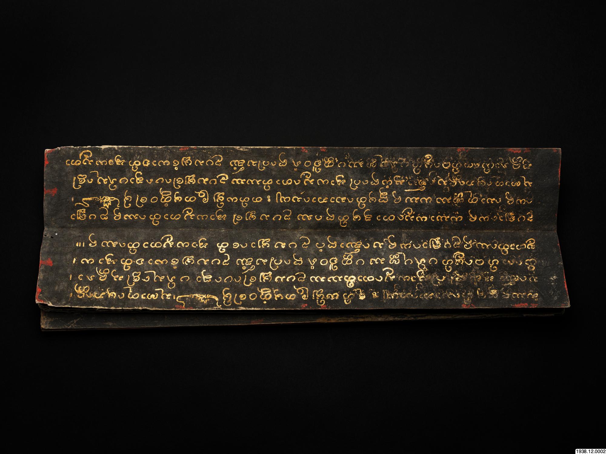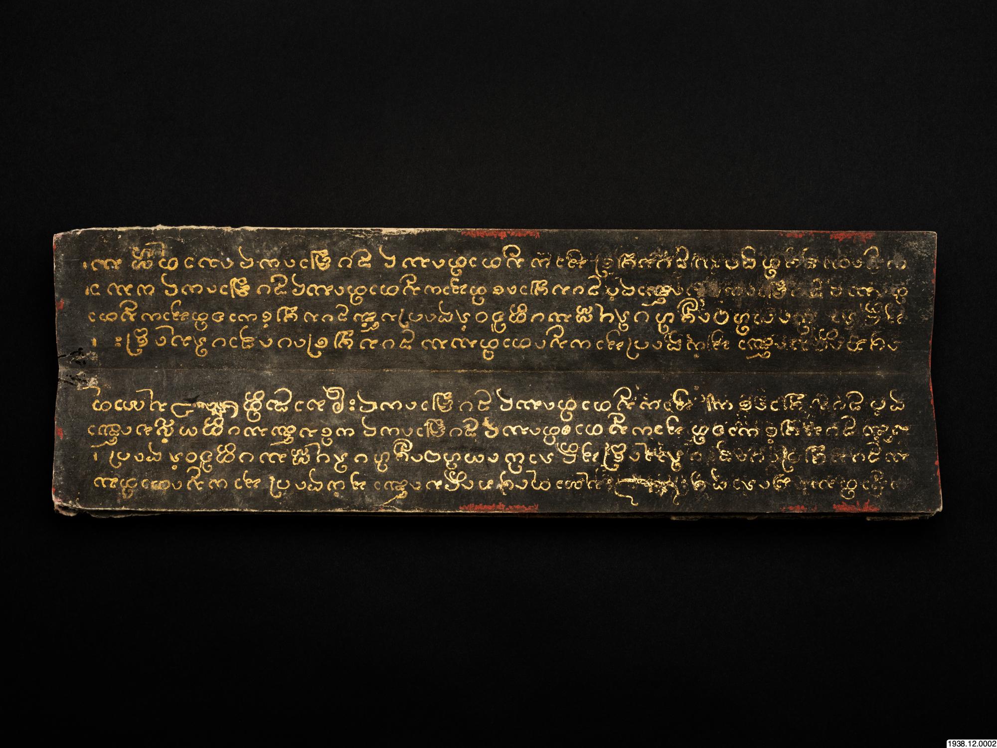 Guldskrift på svart papper. Pärmar av trä, svarta med förgyllda ornament. Innehåller paliformlerna för Upasampadå. Daterat: cullasakkaråj 1218 = 1856 e. Kr. Längd 55 cm. Bredd 8,9 cm. [ocr]