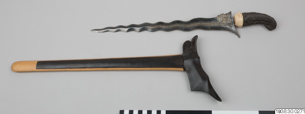 Kris av järn, med slida av trä. Vågformi med en nagaorm i inlagt arbete på bå da sidorna, dessutom på ena sidan Tjintja. Fästet är snidat i form av en trämask (KotjNt-Kotjbtan)och teir tillverkat av arengträ och elfenbens, [ocr]