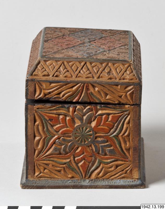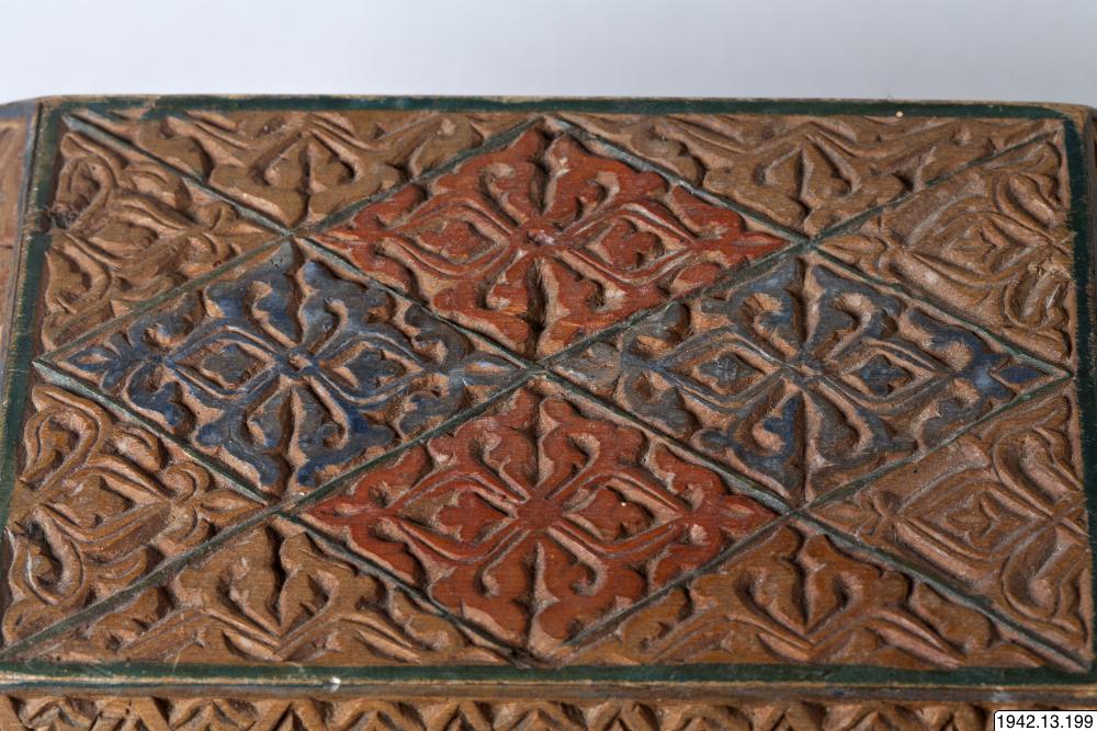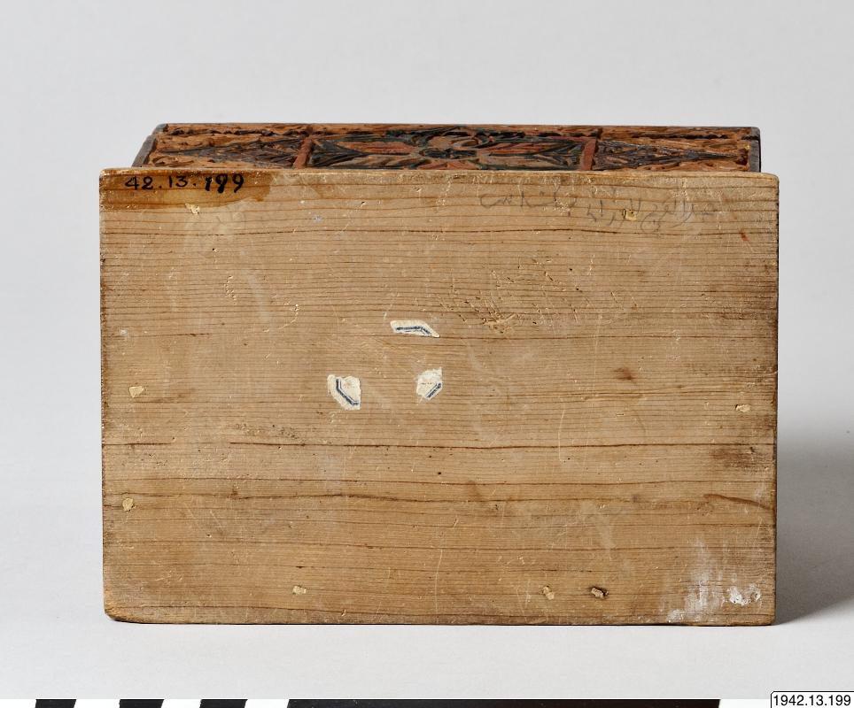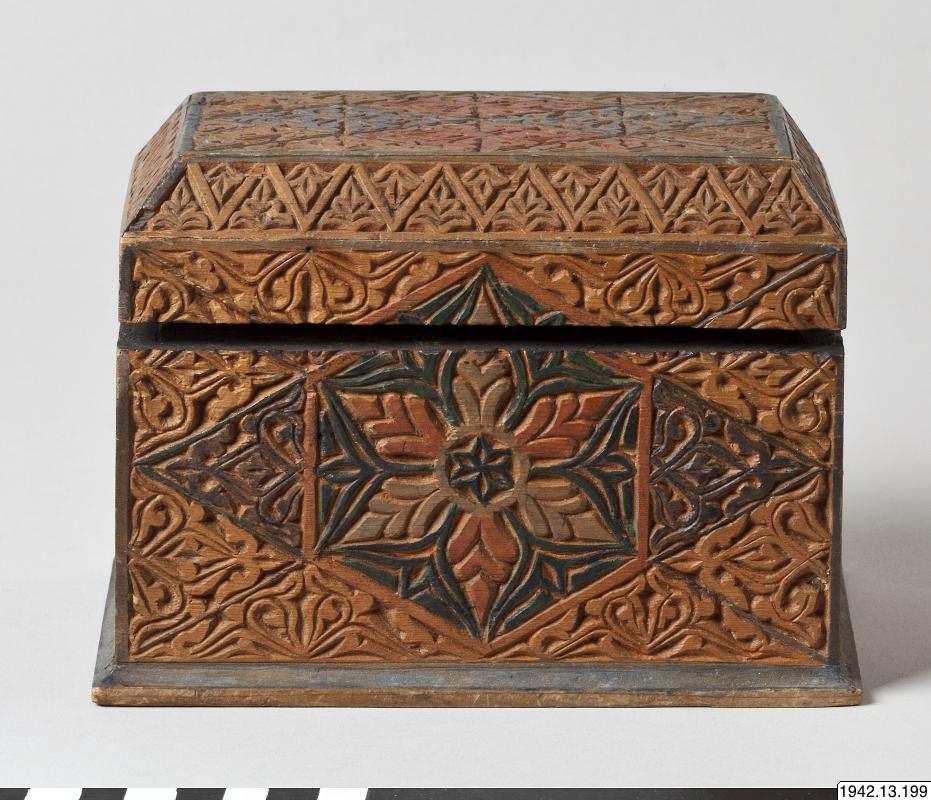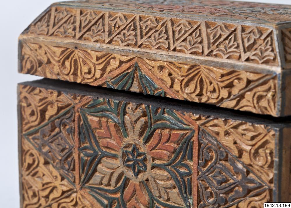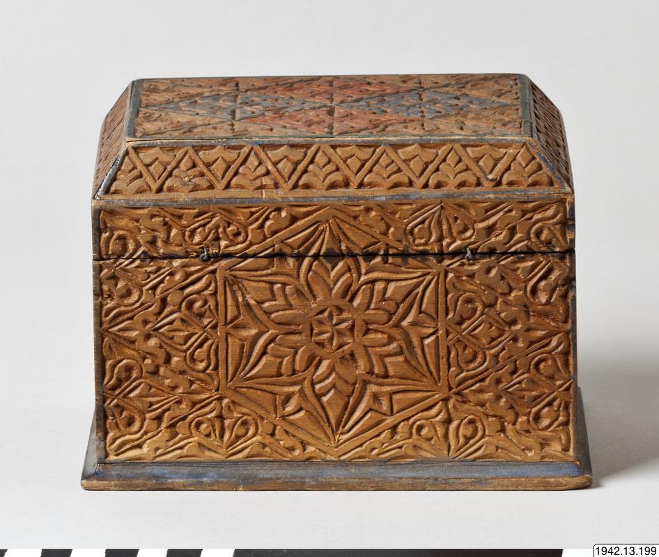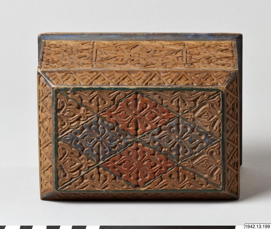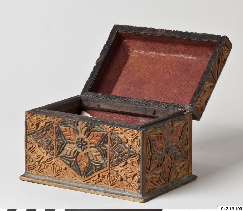 Skrin, arabiskt, med de för den spansk-moriska konsten typiska blom- och bladornamenten. Rektangulärt träskrin. Locket, som har avfasade övre kanter, fastsatt med gångjärn. Utskuren dekor, delvis målad i rött och svart. Skinnklädd innersida.