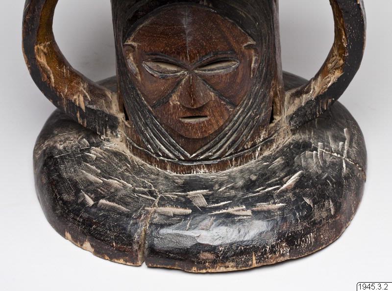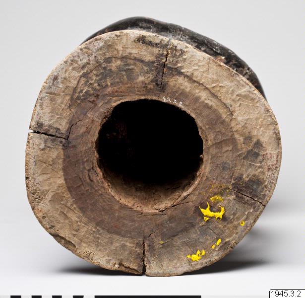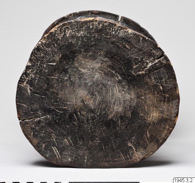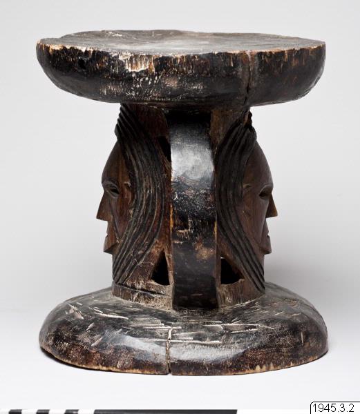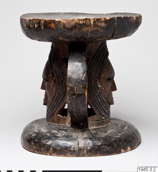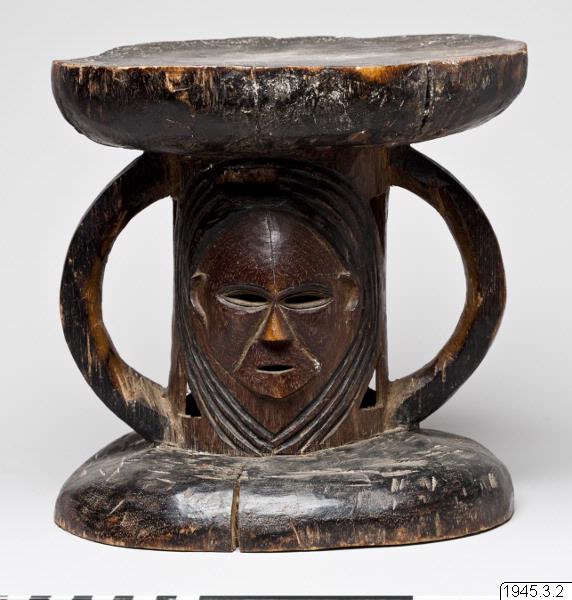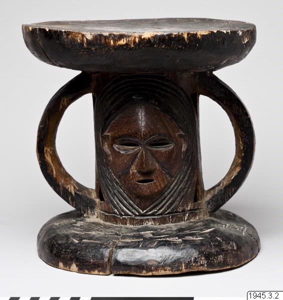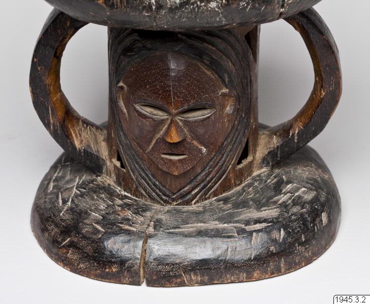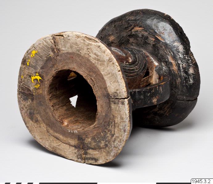 • Pall. Av trä, skuren i ett stycke. Den runda pelaren, ihålig, vilken uppbär den runda sitsen och det likaså runda fotpartiet, har ett litet ansikte utskuret på vardera sidan av pelaren (se foto). Dessa ansikten liknar masker men äro ej av samma typ som masken på nr 1. Höjd 26,5 cm. Sitsen 24,5 x 2 ,5 cm. (generalkatalogen)