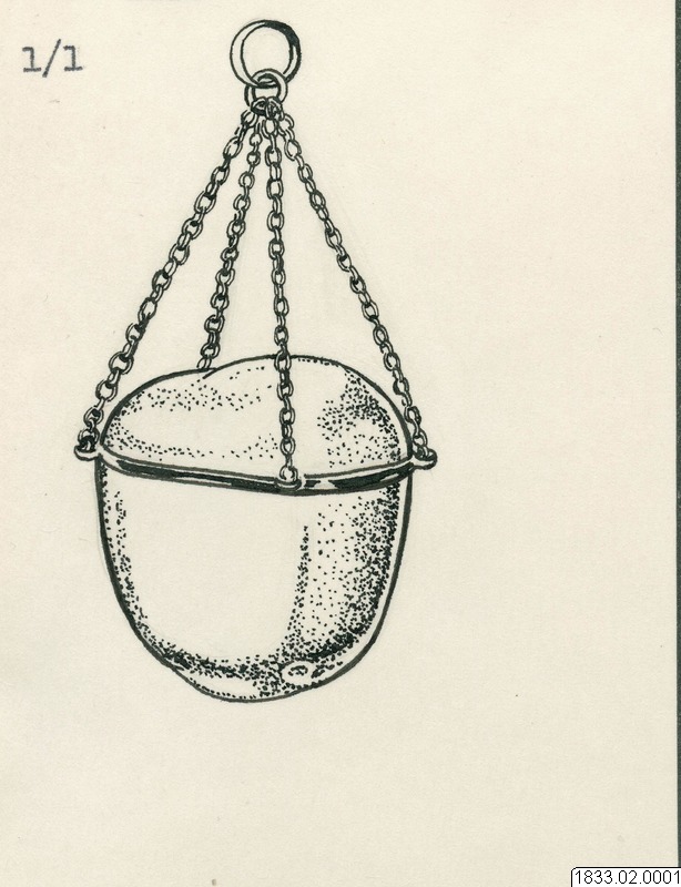 "Aegagropil. pers. pasen": Österländsk bezoar ur inälvorna hos Capra aegagrus (vildget), infattad i silverring med kedjor. Persien möjl. Tibet. (generalkatalogen)