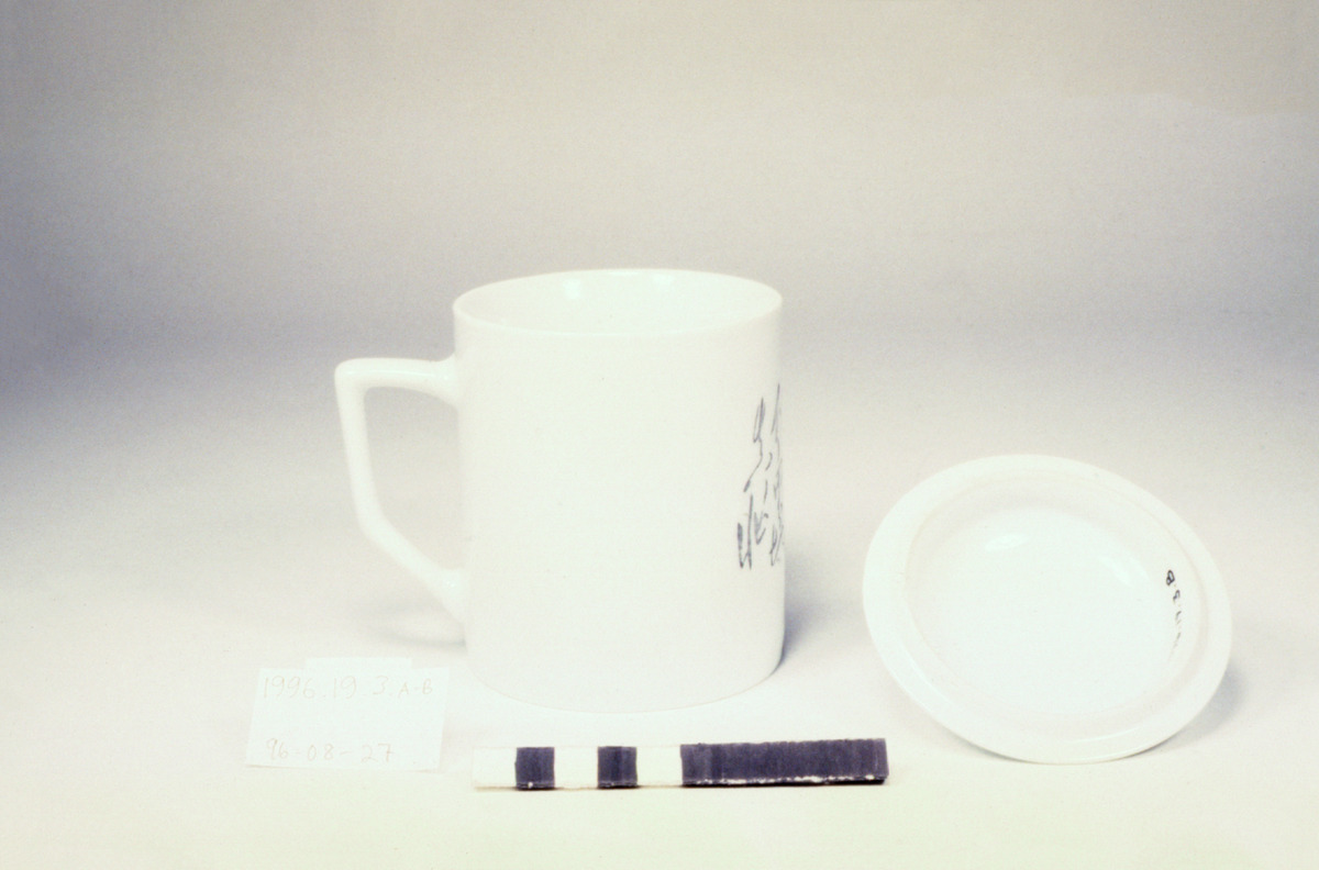 • Kopp i vitt porslin med lock. Kinesisk text på både koppen och locket där det står på kinesiska "tjäna folket".