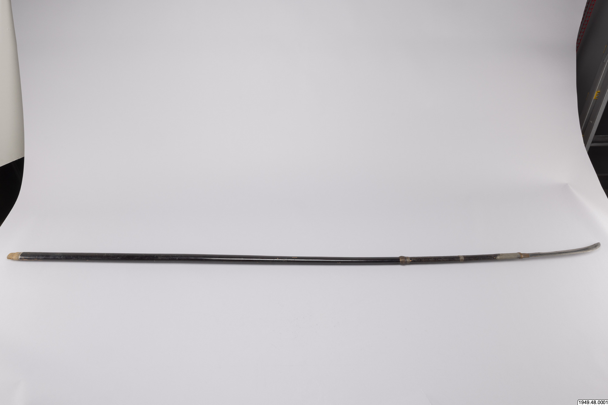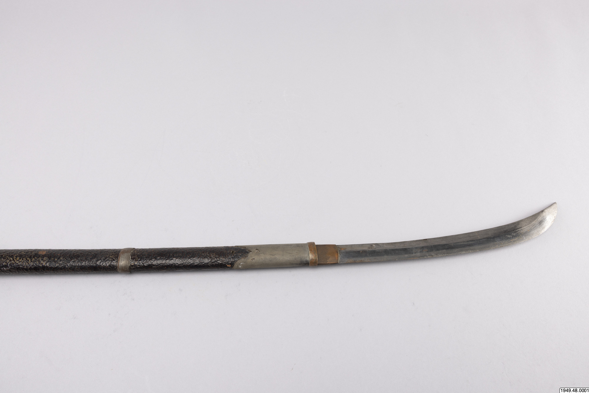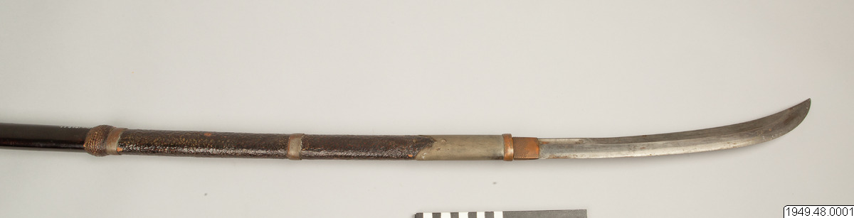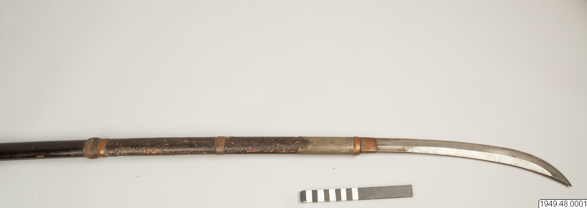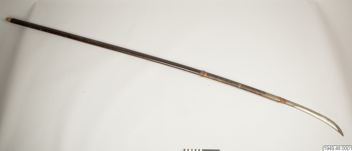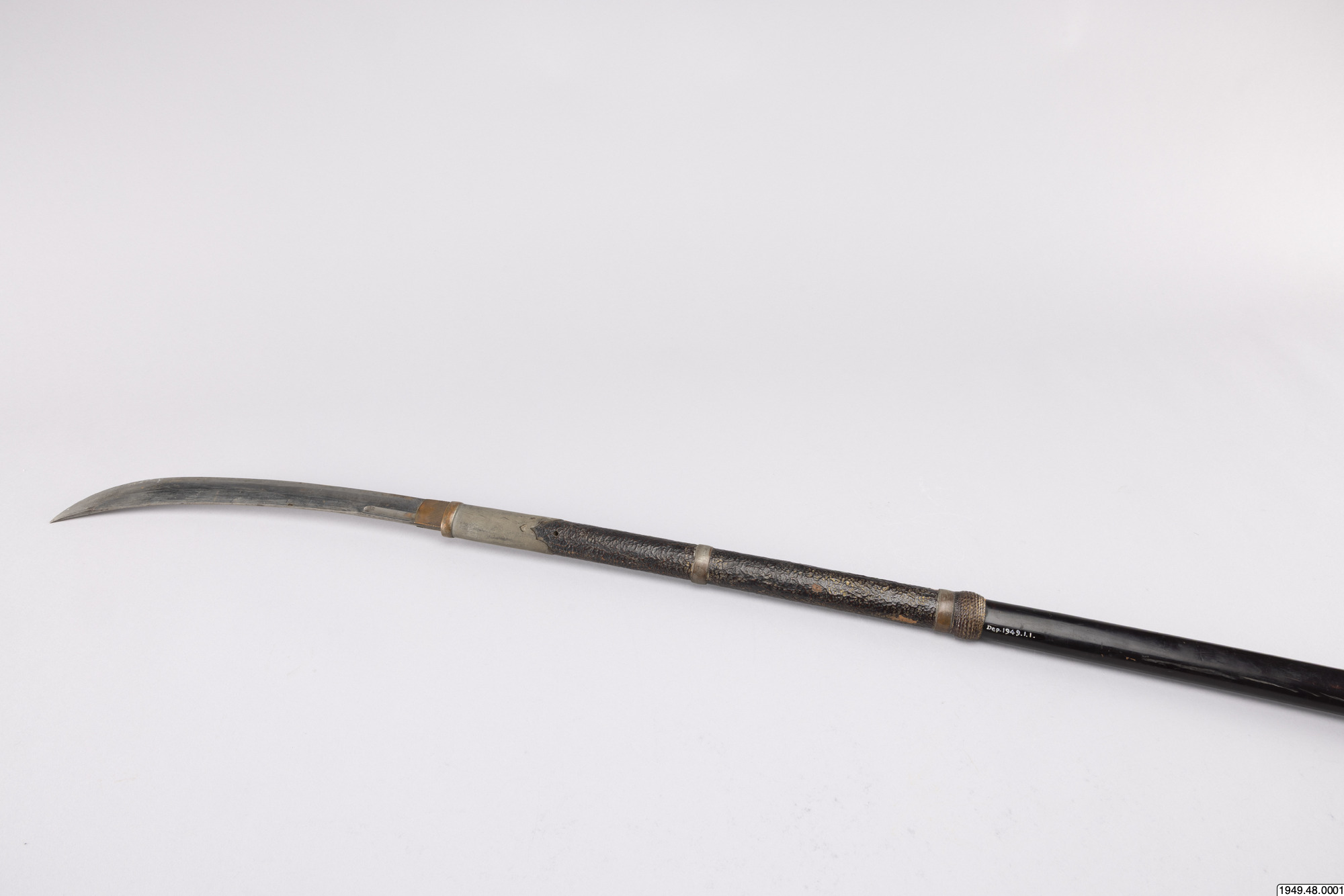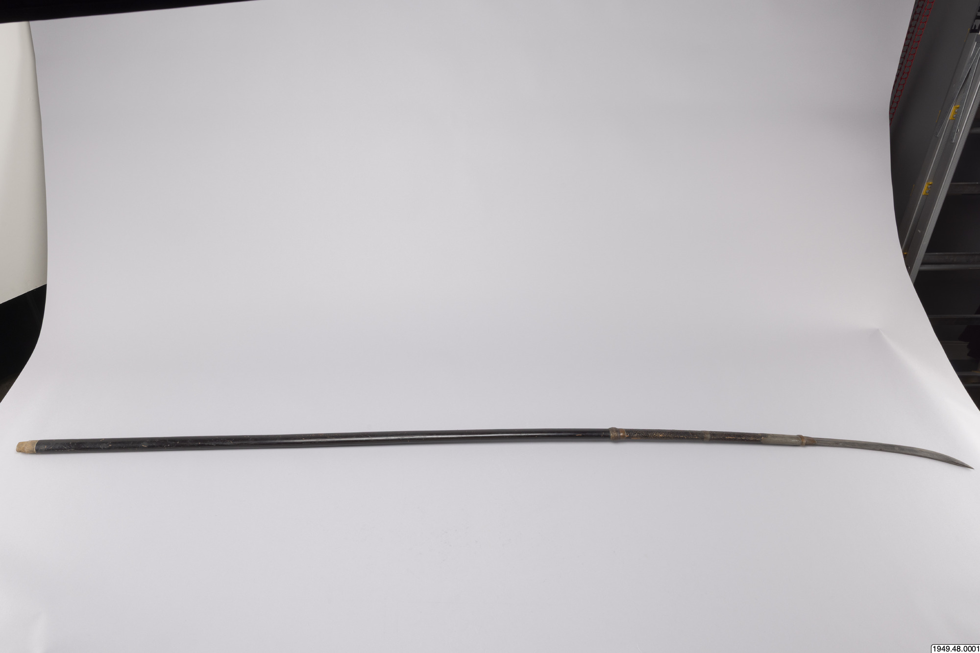 Eneggat spjut med något böjd spets i metall och långt svartlackerat skaft. Skaftet ca 240 cm långt. Kallas på japanska naginata.
