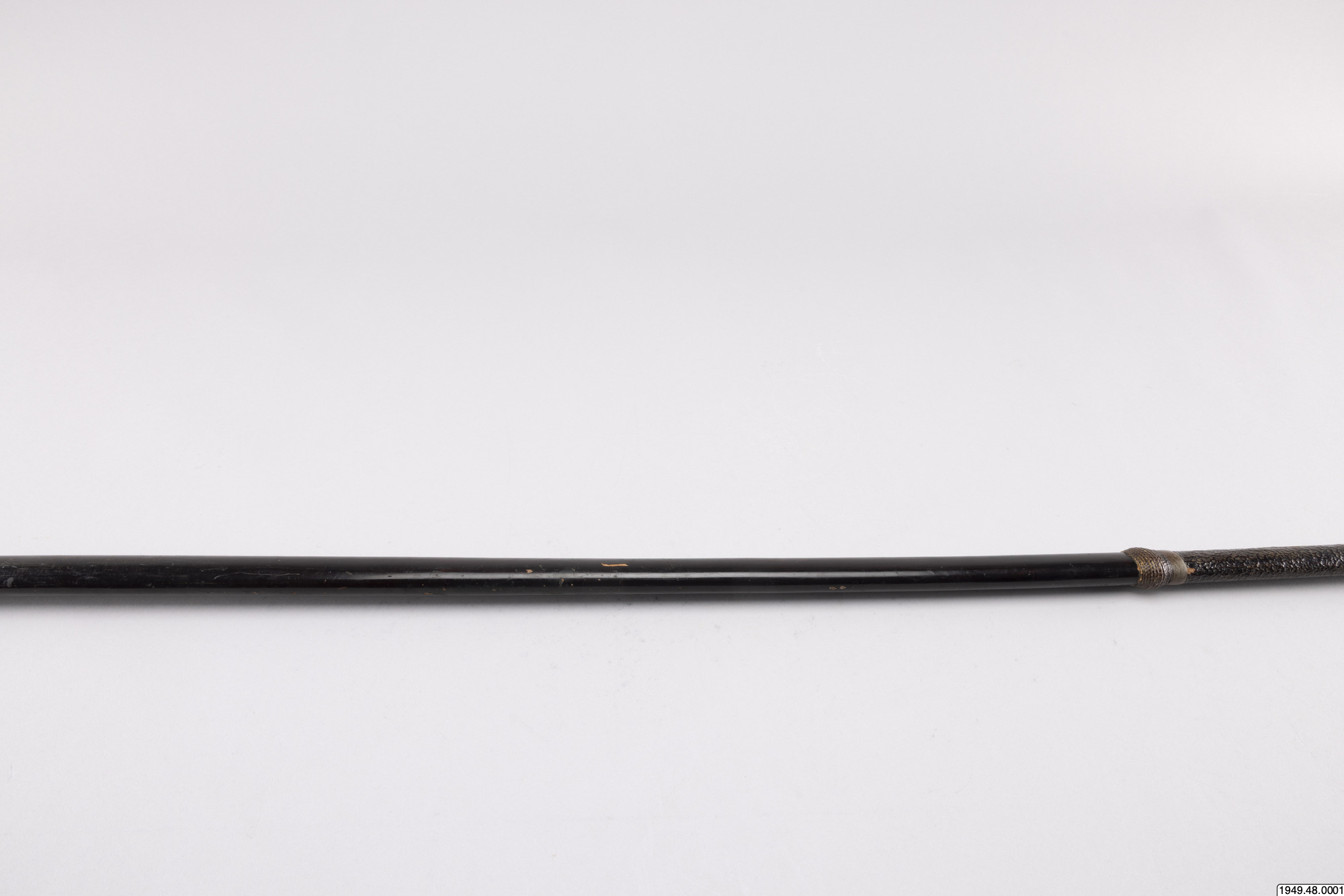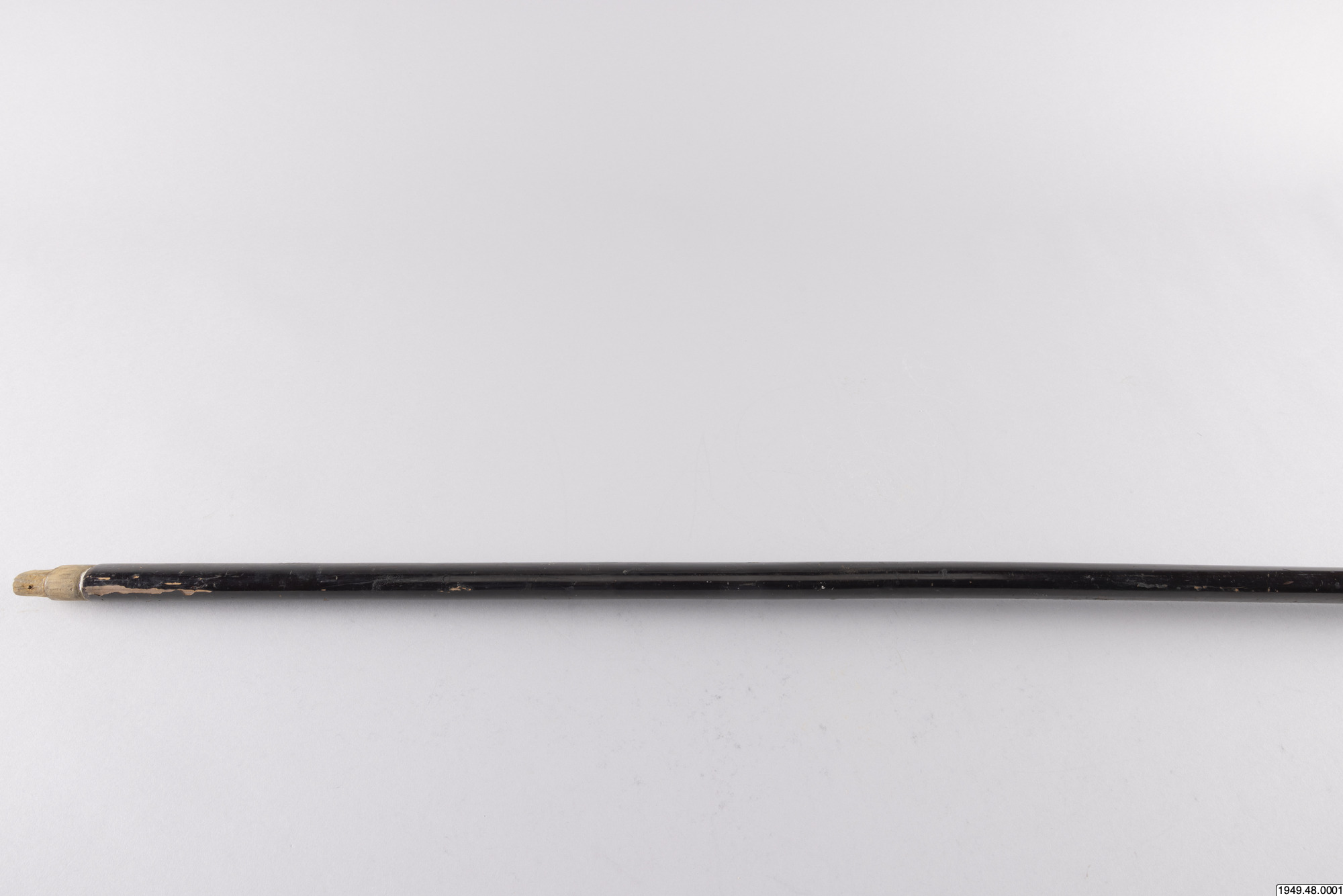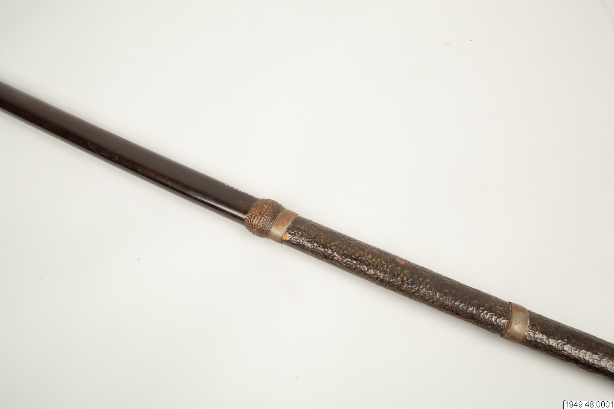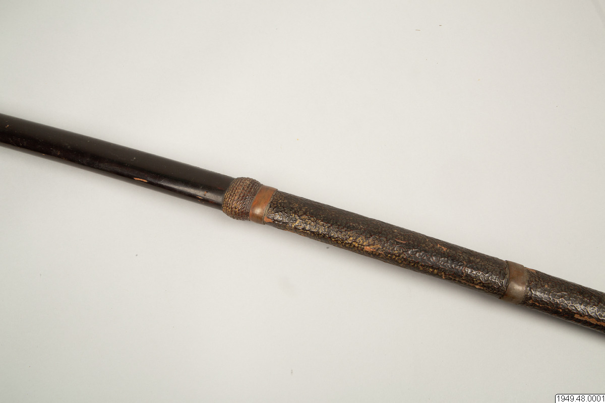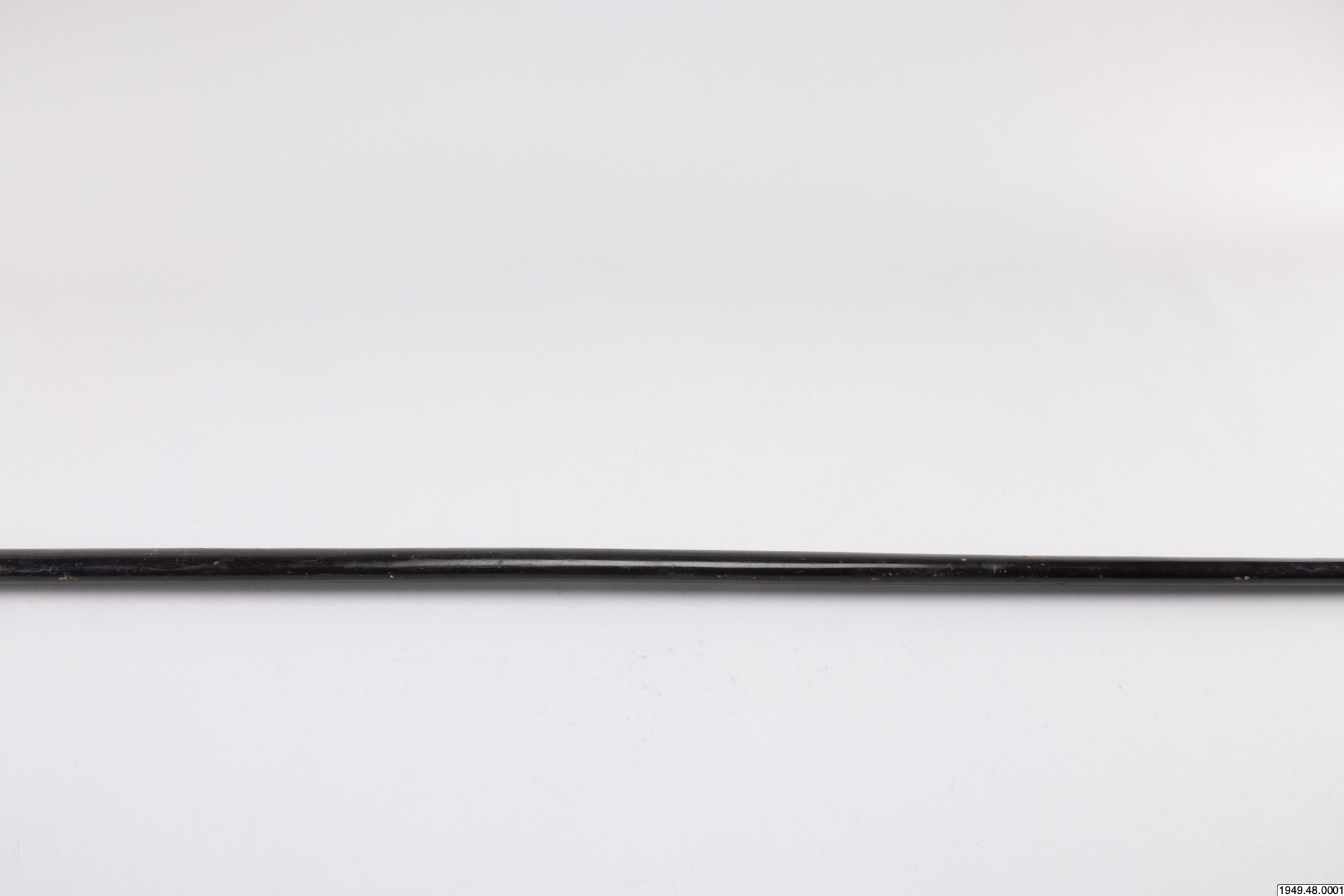 Eneggat spjut med något böjd spets i metall och långt svartlackerat skaft. Skaftet ca 240 cm långt. Kallas på japanska naginata.