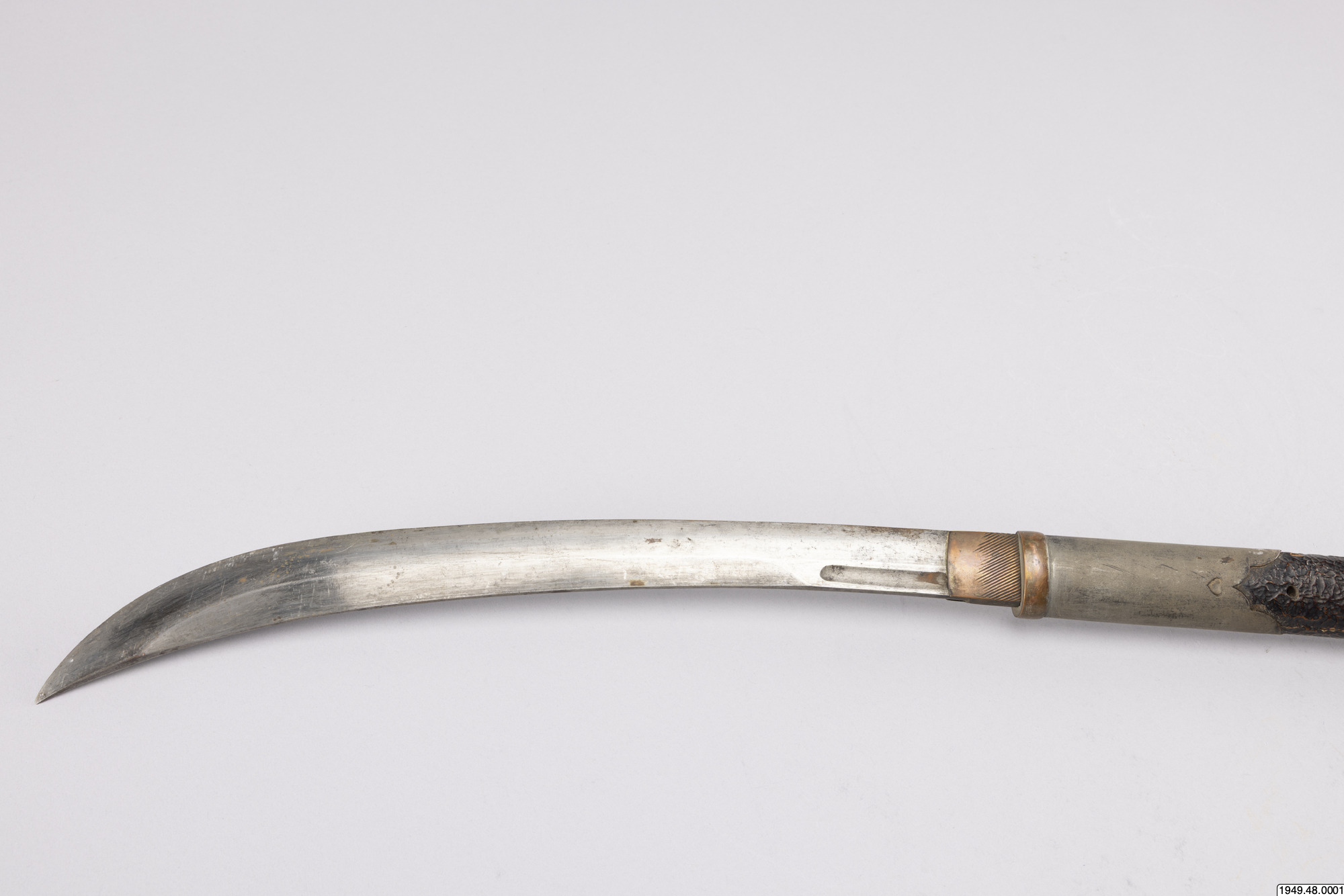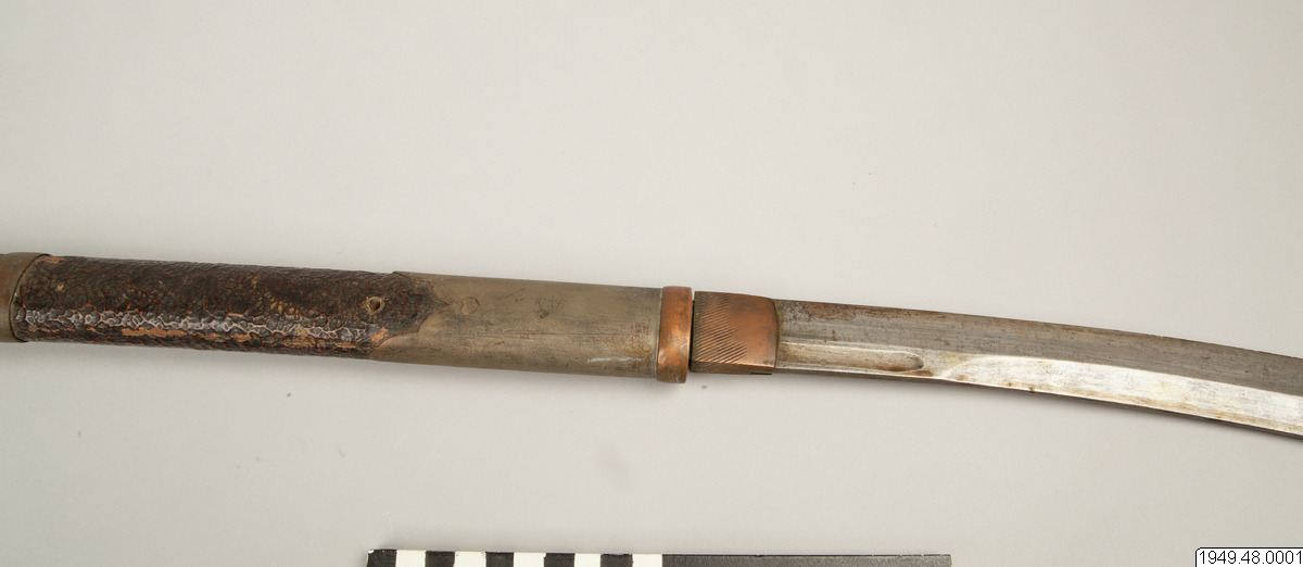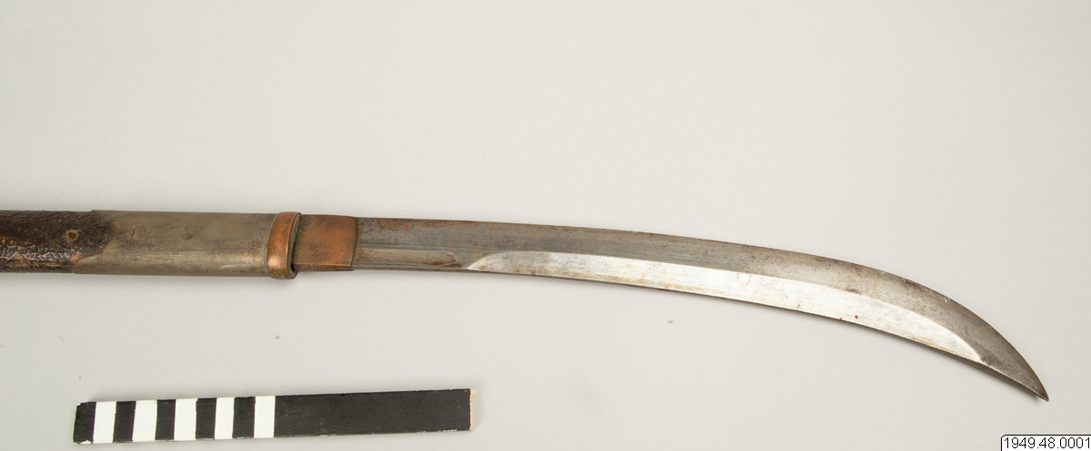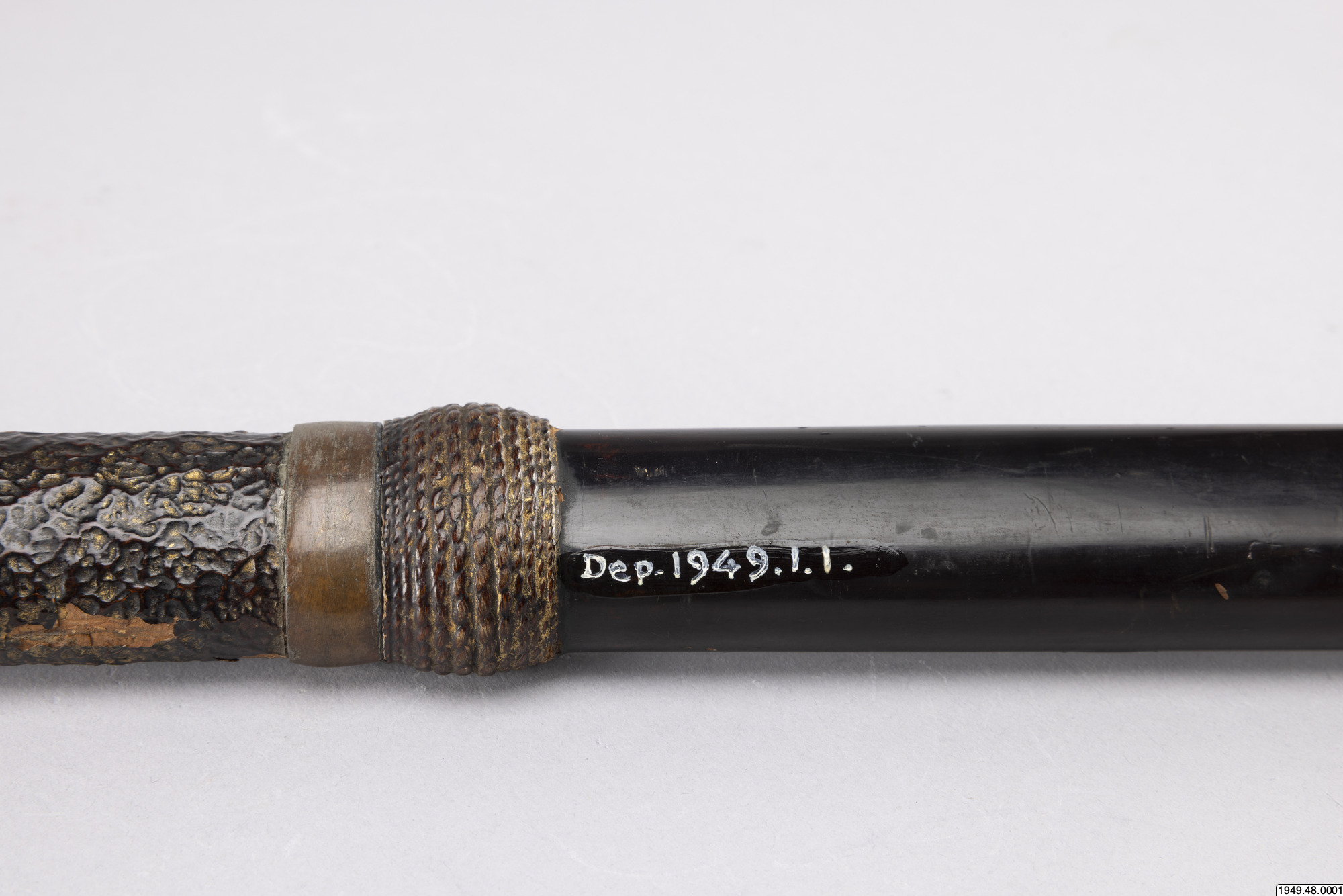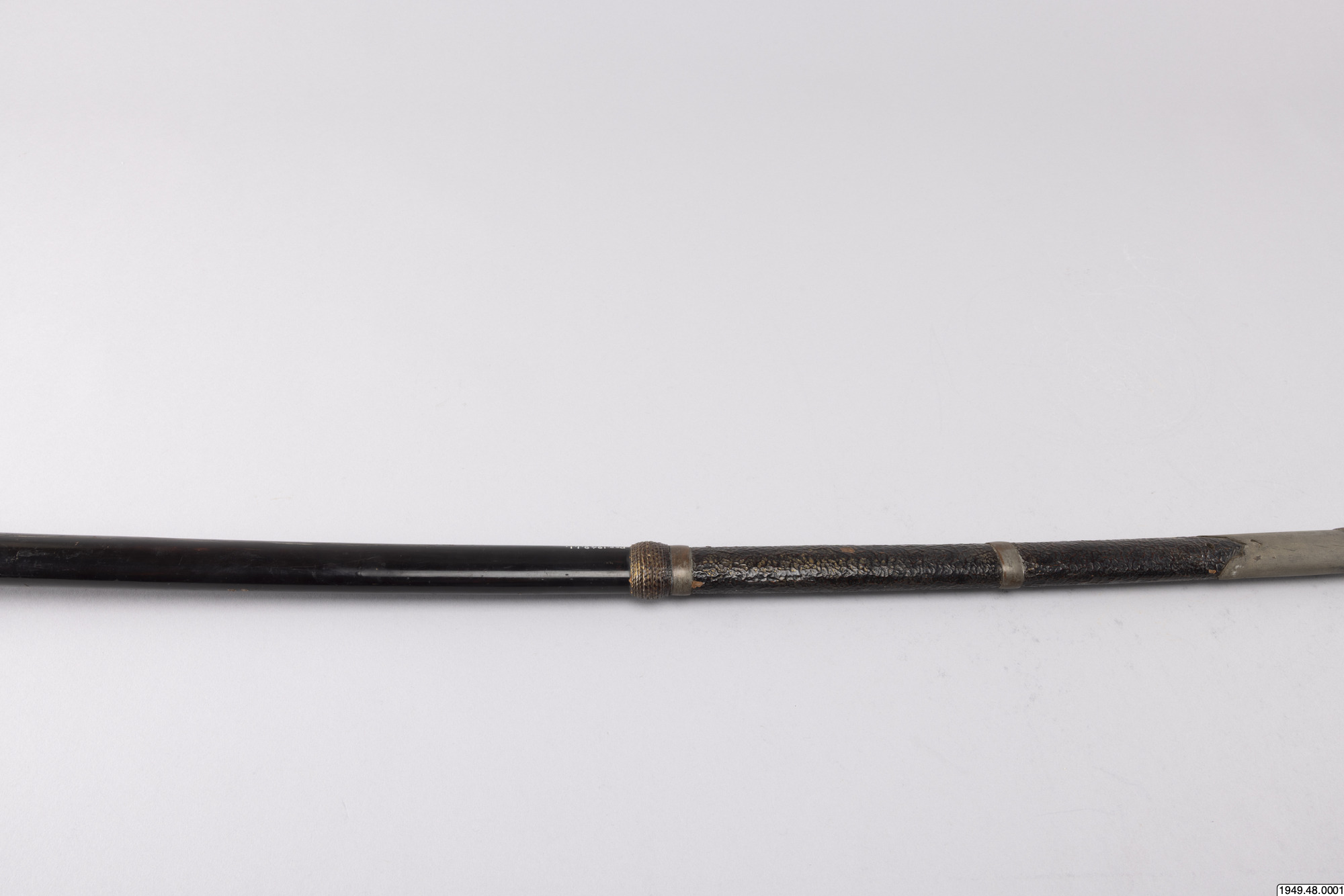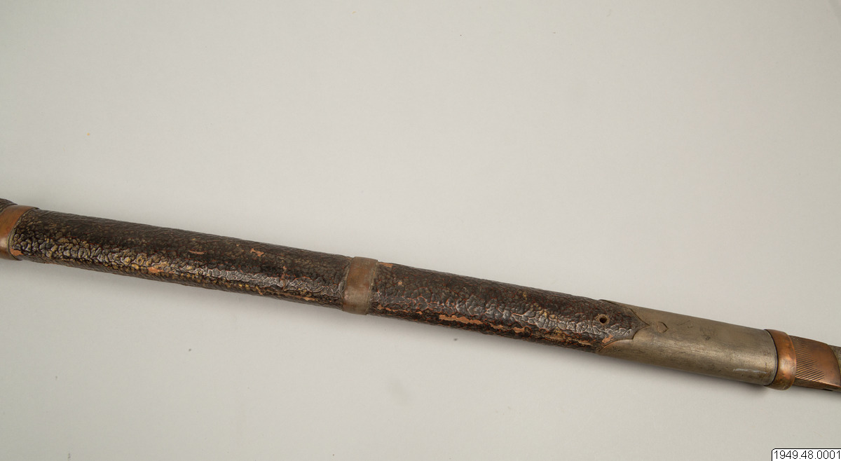 Eneggat spjut med något böjd spets i metall och långt svartlackerat skaft. Skaftet ca 240 cm långt. Kallas på japanska naginata.