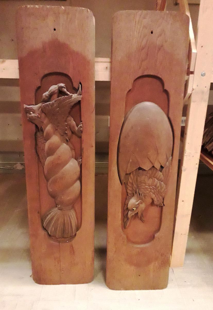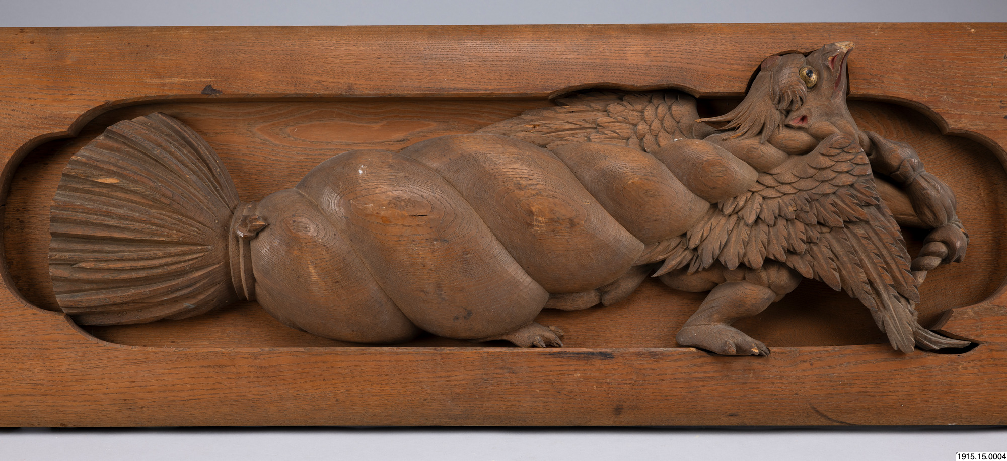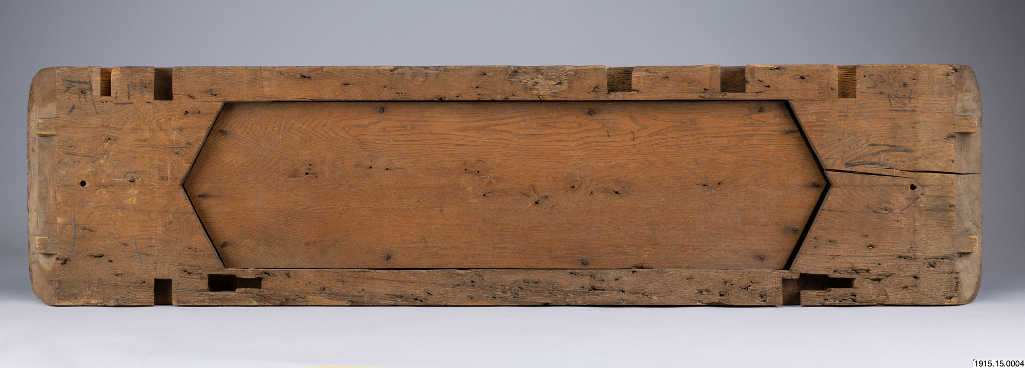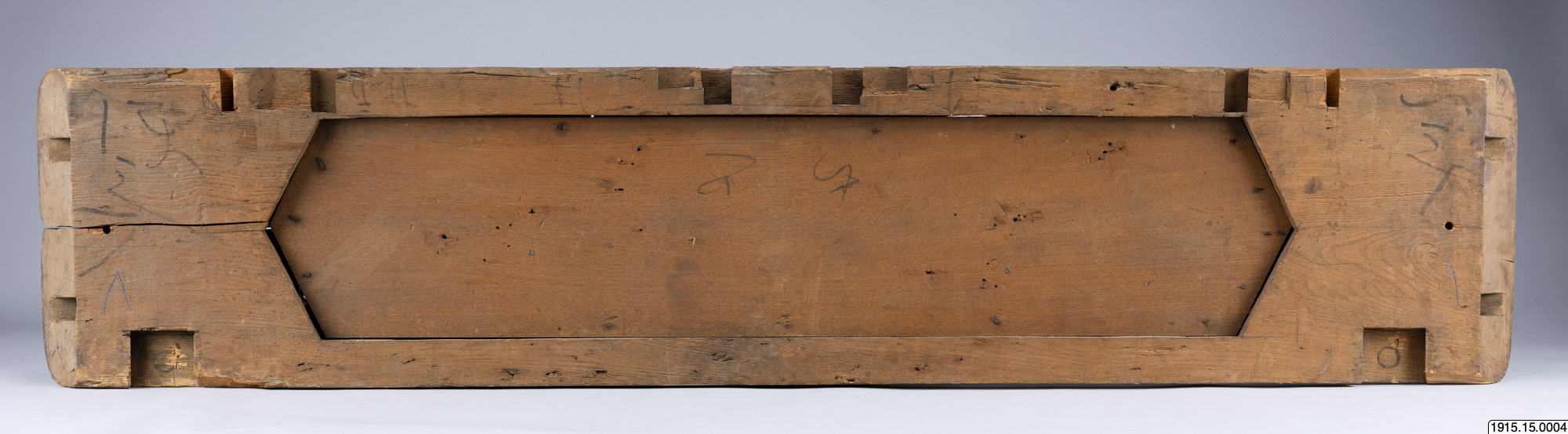 Processionsfigur, Kintoki, med ställning i flera delar. Sannolikt är inte de olika delarna märkta men en preliminär delobjektuppdelning har gjorts enligt följande: A) Figur (trä och Papier-mâché) B) Ställning, C-F: Fyra avlånga föremål i trä, tillsammans bildar de en rektangel - ett underrede eller en sockel. Tre (C-E) av de fyra föremålen är utsmyckade med karvade skulpturer föreställande mytolo...