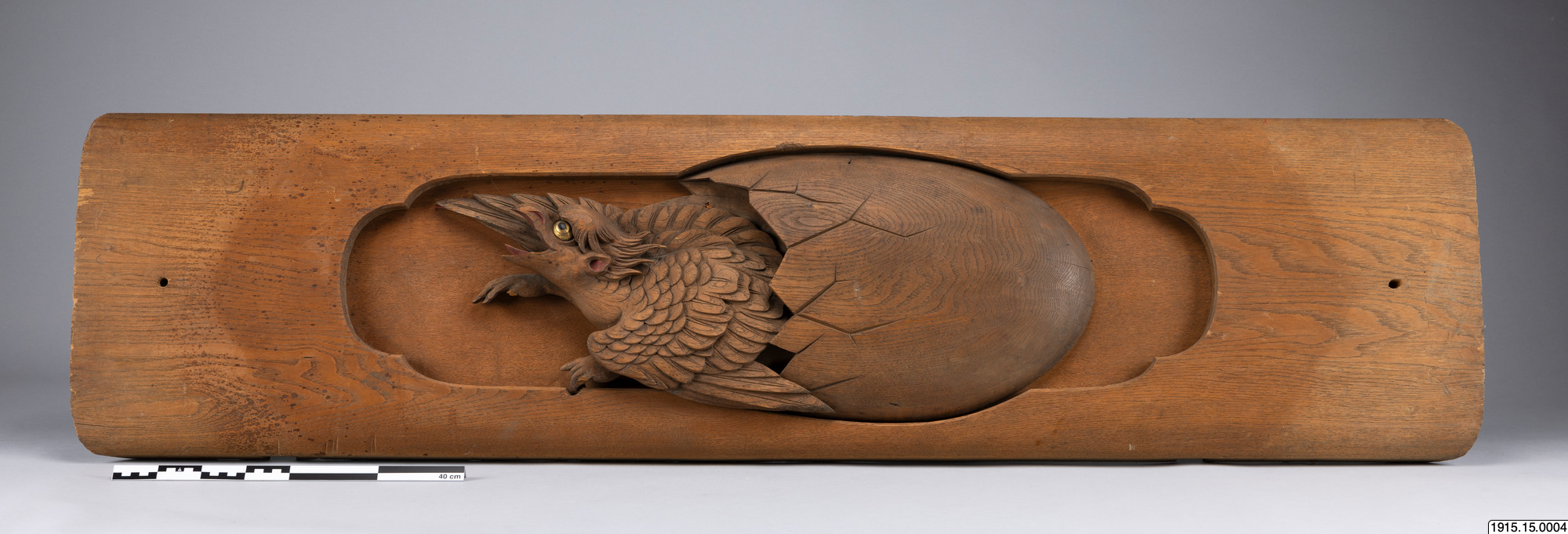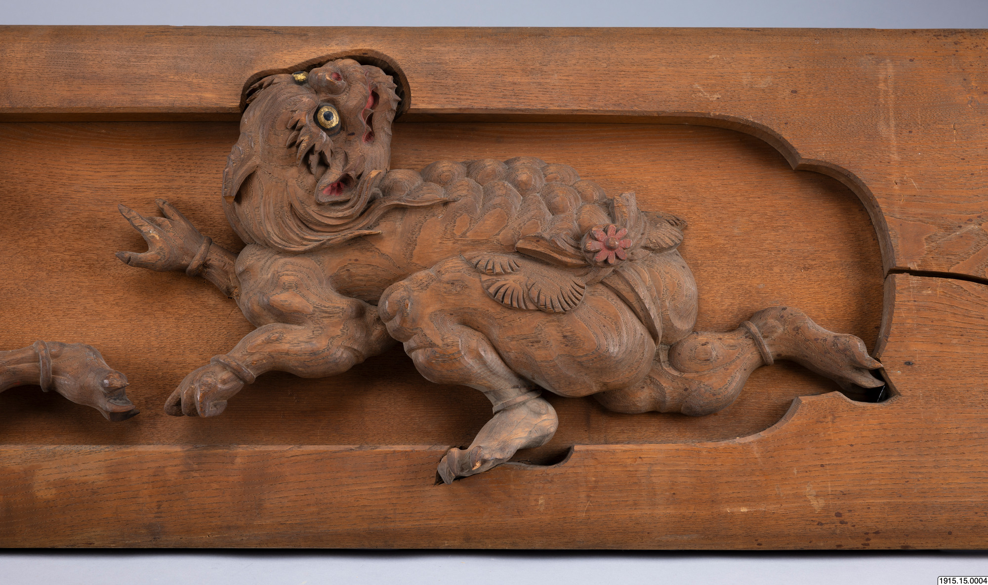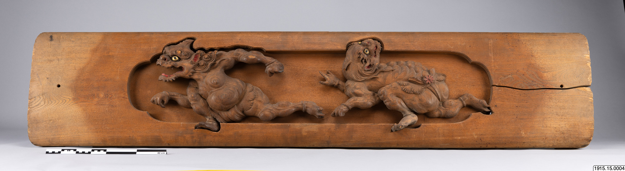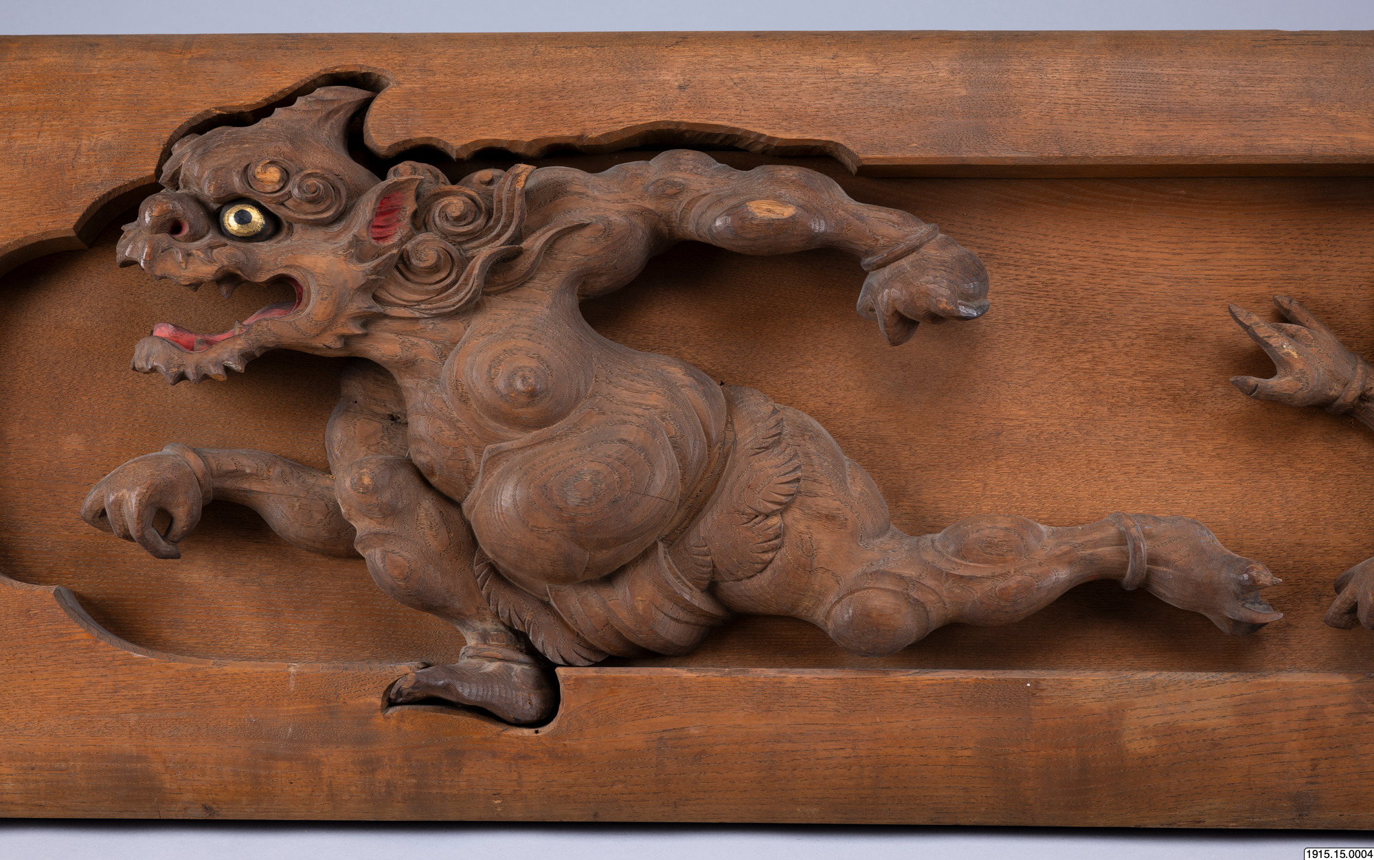 Japansk processionsstaty, föreställande Kintoki, en till gud upphöjd hjälte, som fördrifver onda andar (Oni) genom att kasta ärter efter dem. ^Andarna äro i relief afbildade å öfre estraden.På den nedre står en man iklädd den dräkt, som begagnas vid den fest, då dylika statyer af flera slag föras genom gatorna på vagnar, dragna af tjurar; framför dragarna gå karlar i festdräkt och framför dem små, likaledes festklädda barn, alla hållande vid vagnen fästa linor. Denna staty tillhör festen Kanda Mio-djin, som årligen firas i distriktet Kanda i Tokyo den I5 September. (Vanadisutställningen 1886)