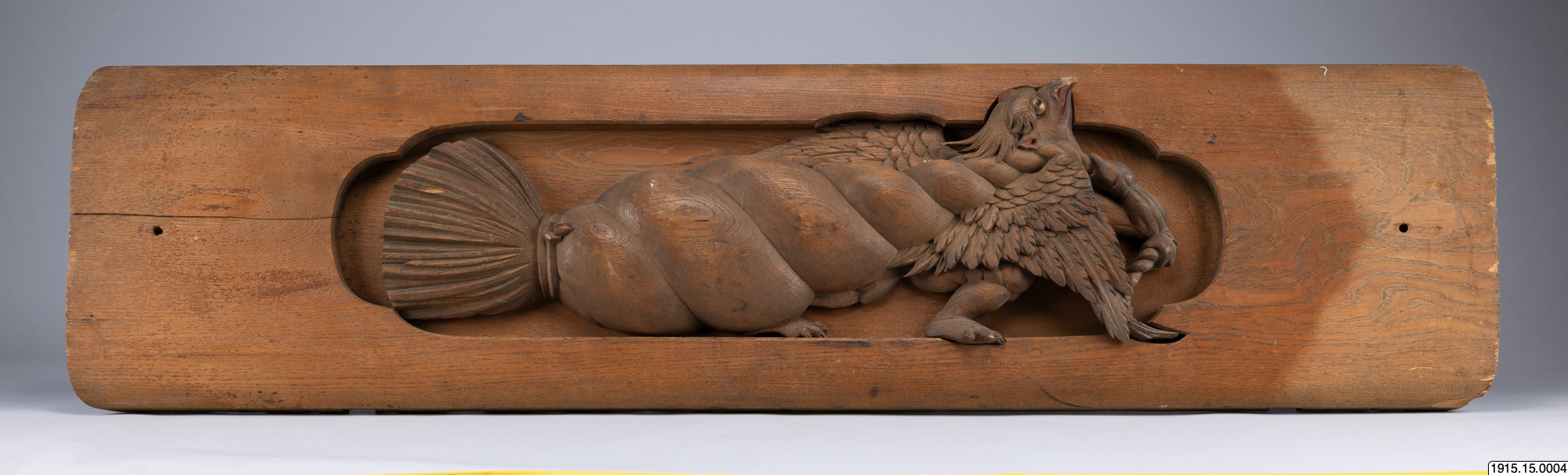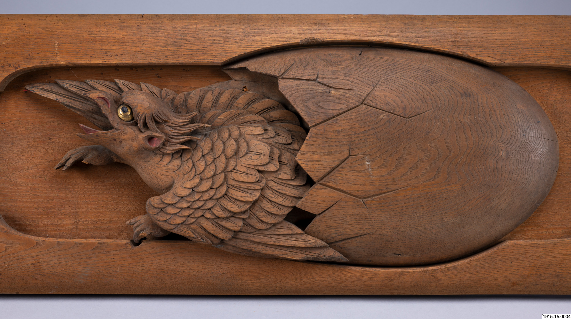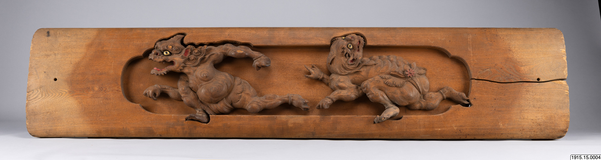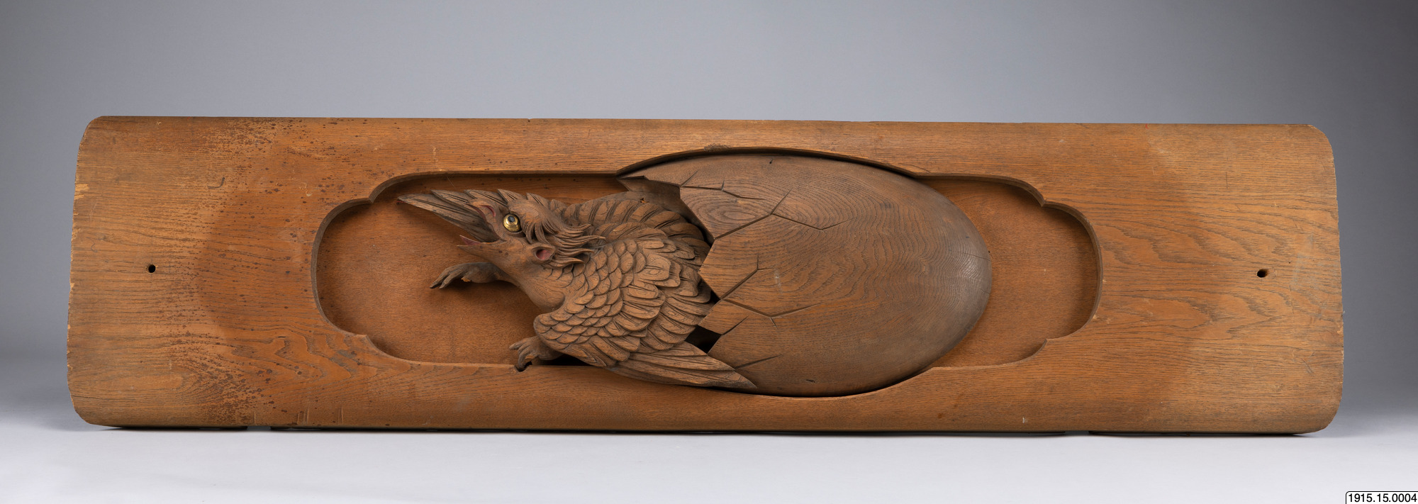 Japansk processionsstaty, föreställande Kintoki, en till gud upphöjd hjälte, som fördrifver onda andar (Oni) genom att kasta ärter efter dem. ^Andarna äro i relief afbildade å öfre estraden.På den nedre står en man iklädd den dräkt, som begagnas vid den fest, då dylika statyer af flera slag föras genom gatorna på vagnar, dragna af tjurar; framför dragarna gå karlar i festdräkt och framför dem små, likaledes festklädda barn, alla hållande vid vagnen fästa linor. Denna staty tillhör festen Kanda Mio-djin, som årligen firas i distriktet Kanda i Tokyo den I5 September. (Vanadisutställningen 1886)