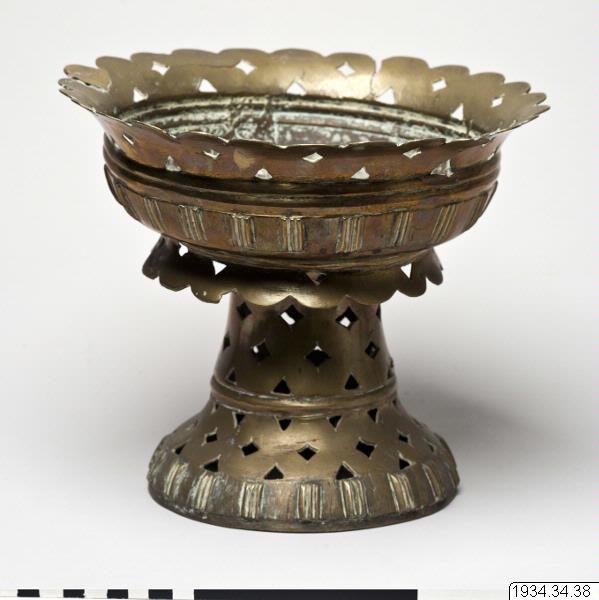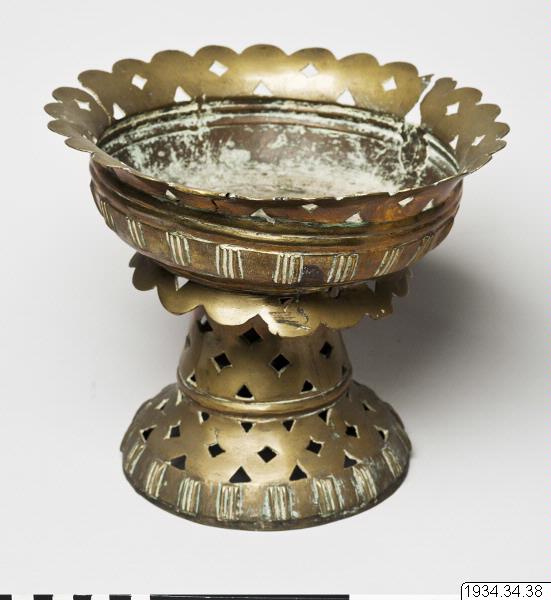 En vid skål med fot. Skålens kant är bladformig genombruten av stjärnliknande hål. Skålen ser ut att vara av mässing eller brons. Skålens insida kan vara av koppar. Utsidan av skåldelen är väldigt blank och dekorerad med ett band av stavar som löper runt om. Foten är fastnitad på skåldelen med 1 nit, de tre andra saknas. Foten är genombruten av en triangelformad dekor och längs med fotens nederka...Visa hela