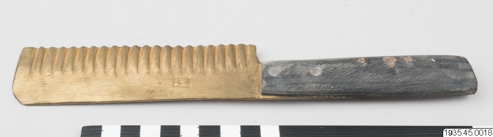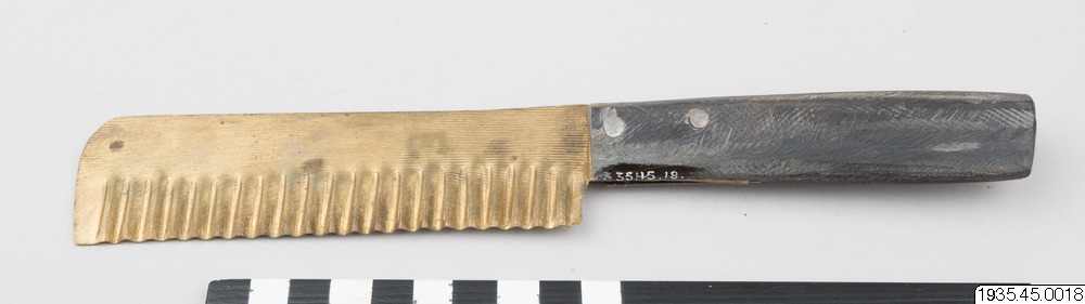 • Potatisskalare av mässing med träskaft. Själva skalaren ser ut som en kam utan hål mellan tänderna. L. 24.3 cm. Nr 16, 17 och 18 äro framställda på platsen. Nr 16 och 18 användes blott av den fattigare befolkningen medan 17 ännu användes helt allmänt i provinserna. (katalog).