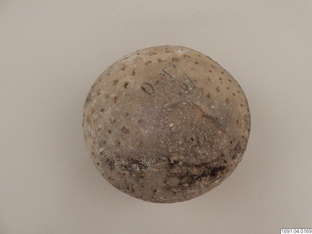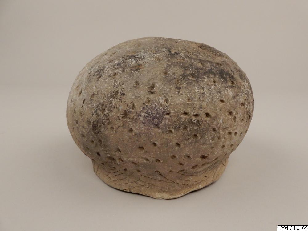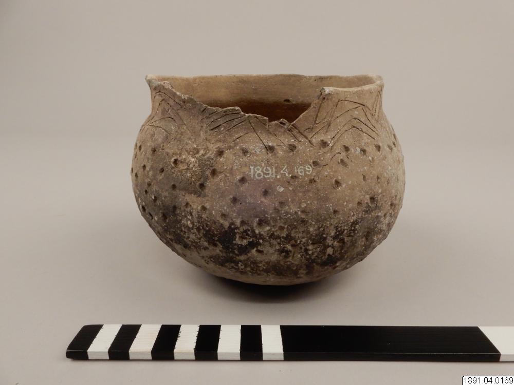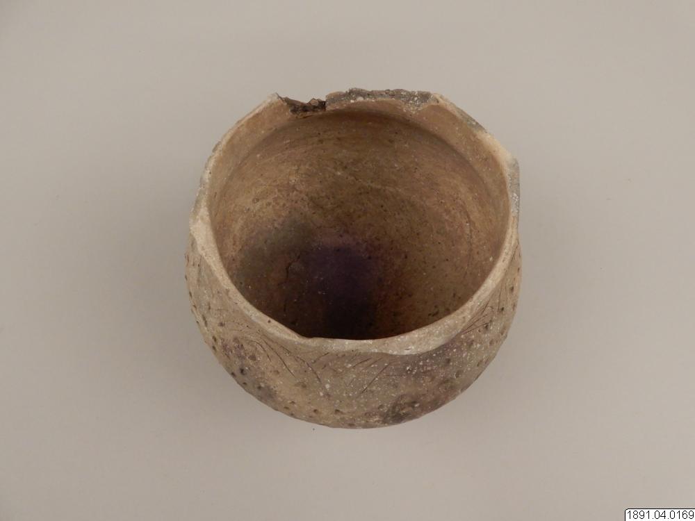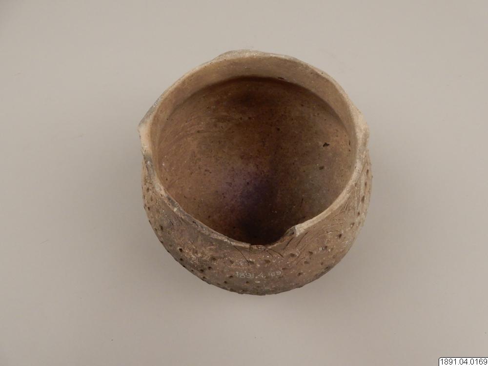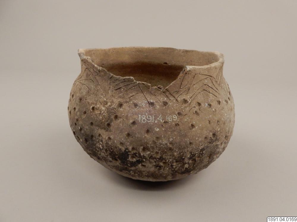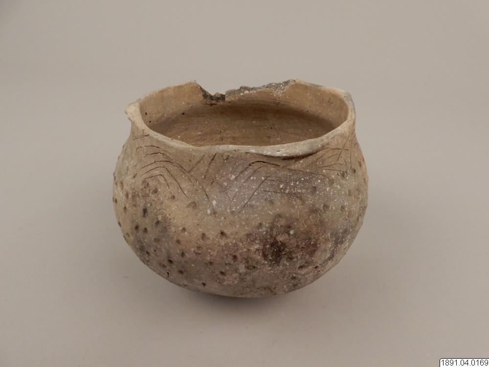 Kärl, klotformigt med vid mynning, försedd med 4 små halvmånformiga utsprång (handtag). Längs övre kanten ornerad med oregelbundna inristade zigzaglinjer. Kärlets sidor prydda med små tre- och fyrsidiga samt runda fördjupningar. Skadat i kanten, några bitar saknas. Höjd: 12,7 cm. Diam.: 17,8 cm.