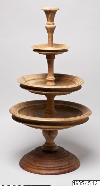 10-13. Fruktställningar. Av trrä. Vackert svarvarbete. 3 skålar av avtagande storlek, anordnade över varandra. H. 64 cm. "Native made fruit bowls or stands. These are made in a small village by the local carpenter and carver and with very primitive tools. I am sending you these to show Filipine wood and handicraft". (Nathorst). (generalkatalogen)