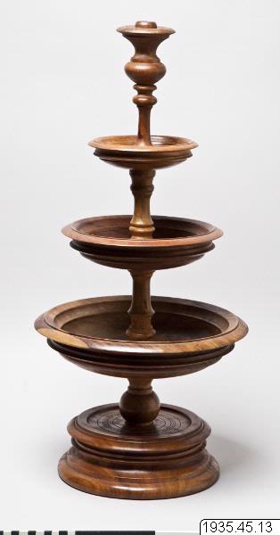 10-13. Fruktställningar. Av trrä. Vackert svarvarbete. 3 skålar av avtagande storlek, anordnade över varandra. H. 63,5 cm. "Native made fruit bowls or stands. These are made in a small village by the local carpenter and carver and with very primitive tools. I am sending you these to show Filipine wood and handicraft". (Nathorst). (generalkatalogen)