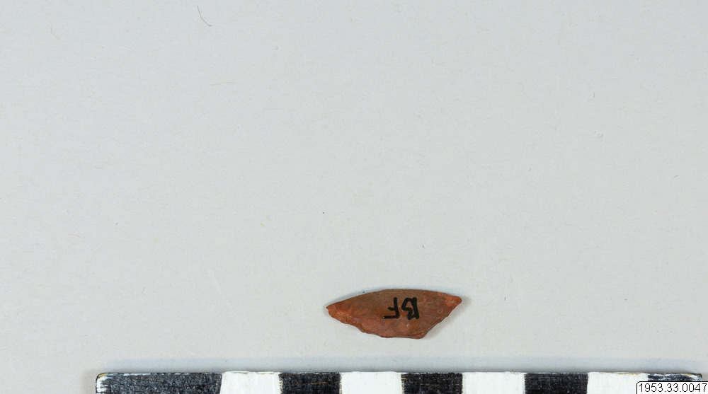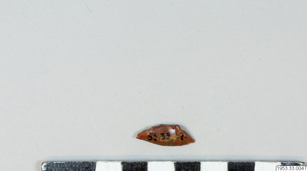 • Halvmånformigt litet stenredskap. Av rödaktig bergart. Se nr. 25.