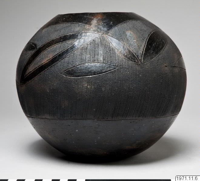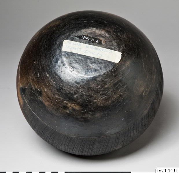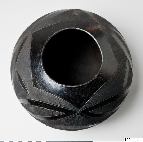 Kärl i svart lergods, klotformat med cirkelrund öppning och med något avplanad botten. Finstreckig dekor till en cirkellinje runt kärlets nedre del, femuddig kant omkring öppningen och släta lancettformade bladornament på övre sidan om kärlet.