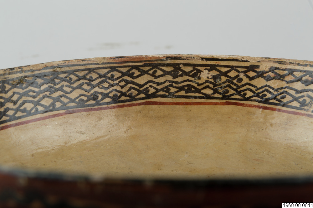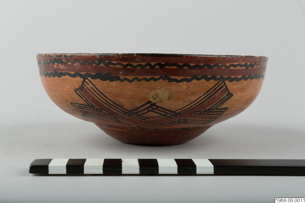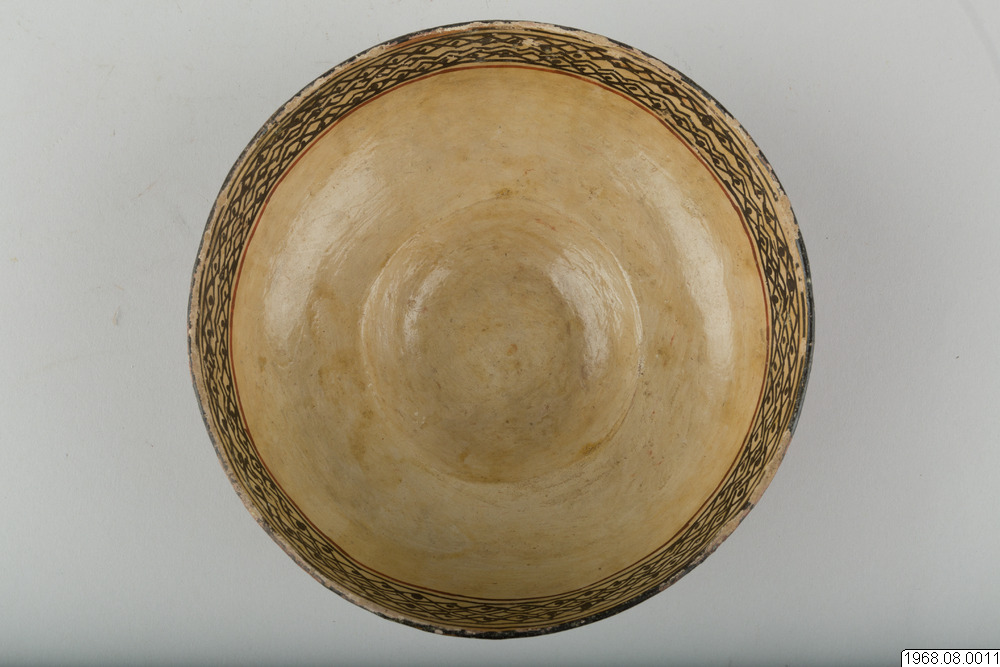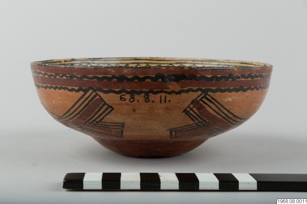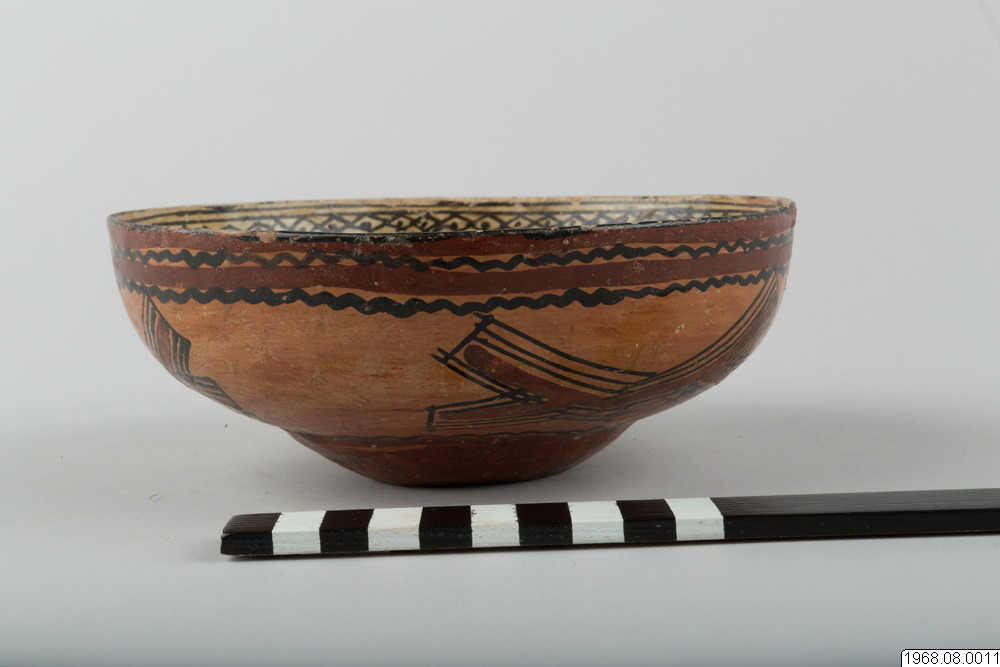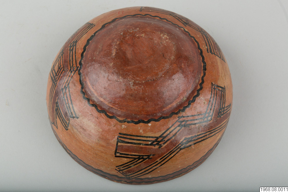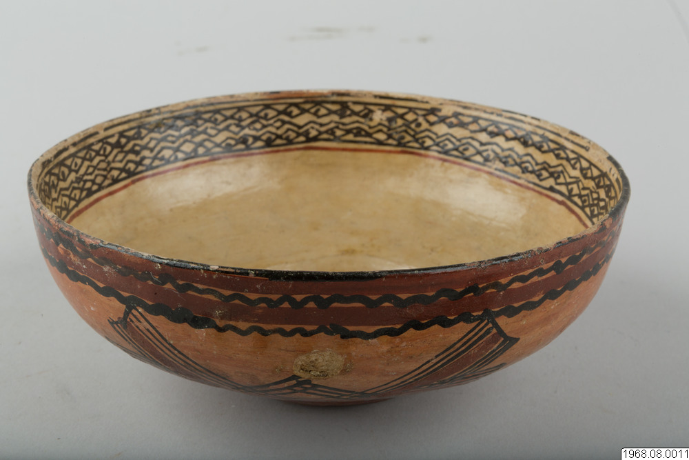 • Skål av lergods. Geometrisk dekor i brunrött och mörktbrunt på rödgul botten. Dekor även invändigt. Kantbård. (Generalkatalog)