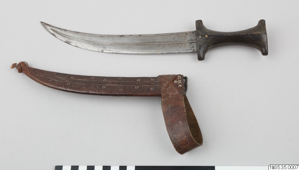 Dolk. Krökt klinga med mörkt fäste av horn. Fästets båda ändar bilda plana ytor. Skida av läder mörkbrunt nedtill slutande i en rund knopp. Skidans ena sida ornerad med i lädret insänkta rundlar, vardera innehållande ett kors. Den andra sidan visar vinkelformiga ornament vars spetsar stå emot varandra. I skidans övre del är fästad en kort läderrem varför vapnet tydligen är en armdolk.Remmen är fö...