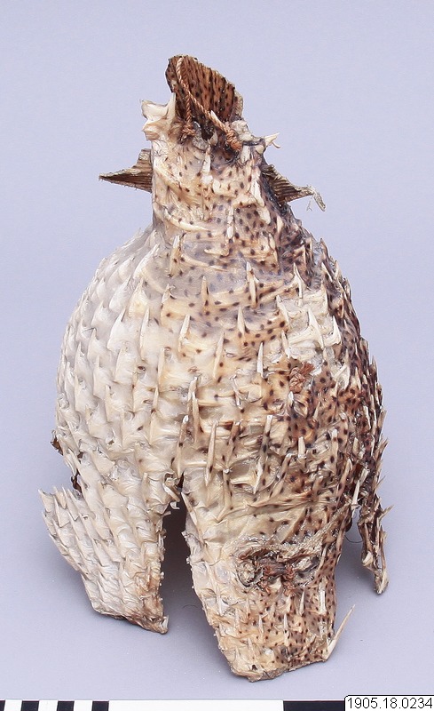 • Hjälm av skinn av taggfisk. (dep. i Gbg:s mus. 1942). Gilbert-öarna.