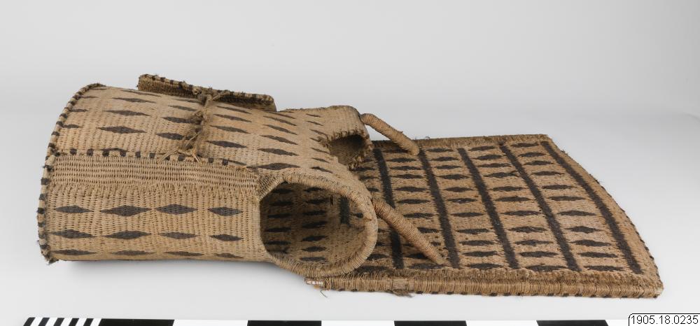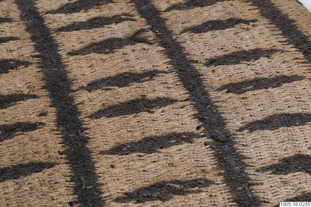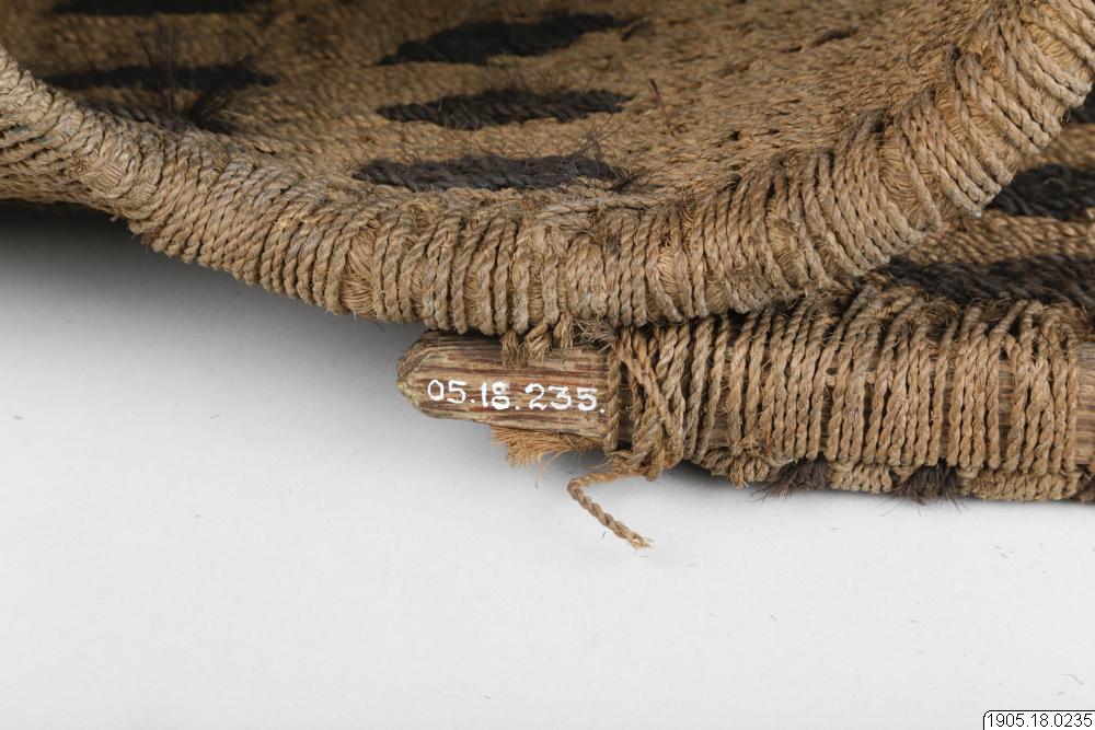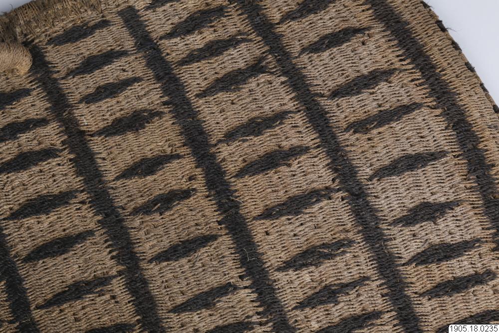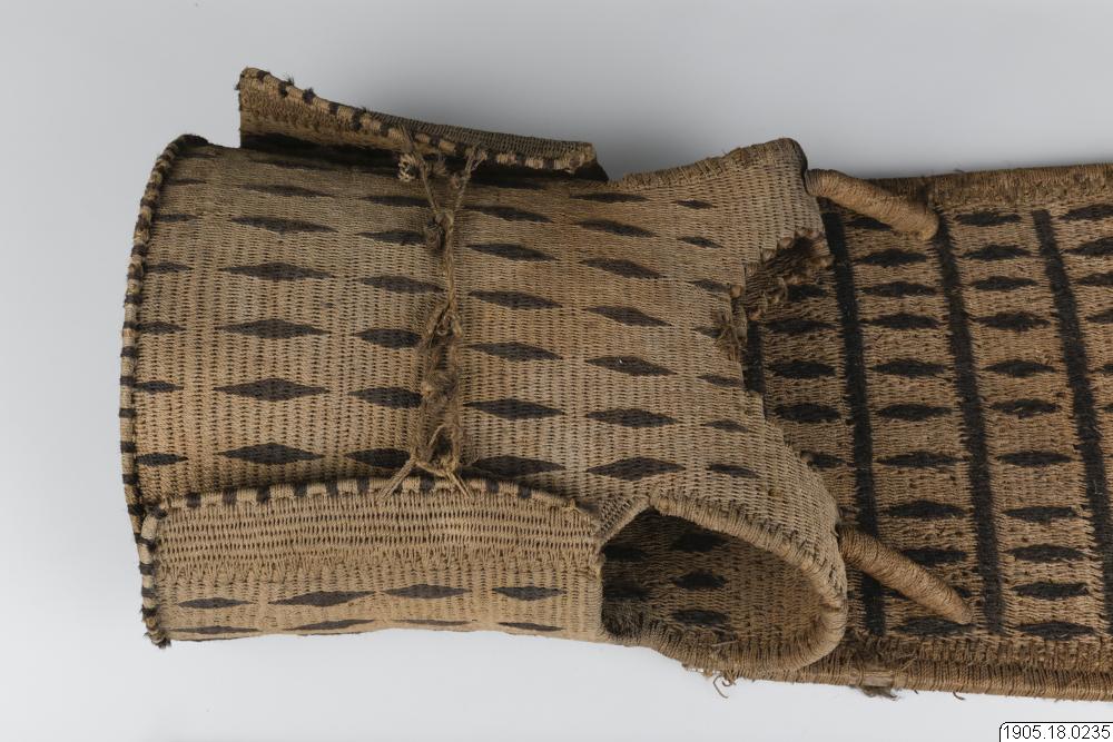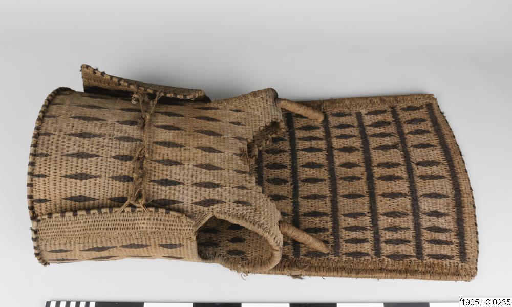 Harnesk av kokosfibrer. På skärmen bakom huvudet sex svarta tvärgående ränder och mellan dessa vertikala, på bröst och rygg endast de senare. Gilbert-öarna