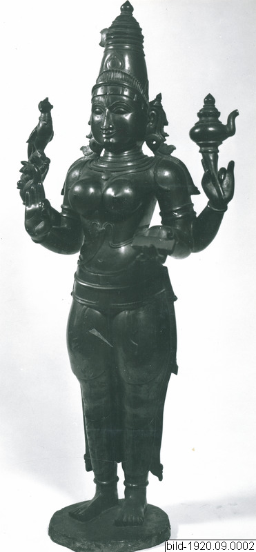 Står på en rund platta. Spetsig huvudbonad med månskära och med sidopartier vid öronen. Fyra armar med överarmar, gemensamma. De båda översta riktade uppåt, den högra håller i en ring med en fågel (påfågelhöns); den vänstra på ett skaft ett föremål liknande en kittel med tut, en lota. Den nedre högra armens hand gör en religiös gest med tummen och pekfingret mot varandra och har på insidan av handen en figur. Den nedre vänstra armens hand håller ett parallellipipediskt föremål. Gördel med nedhängande band. fotringar. (generalkatalogen).Stäng