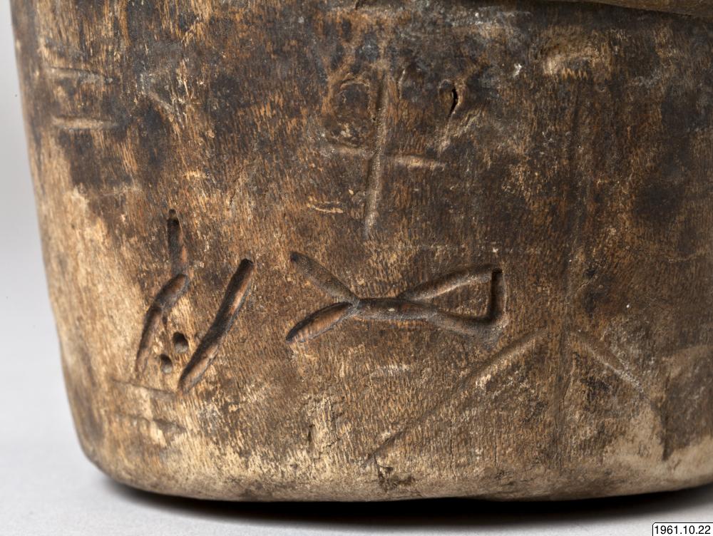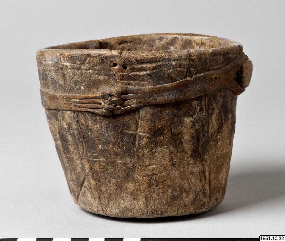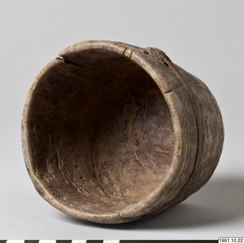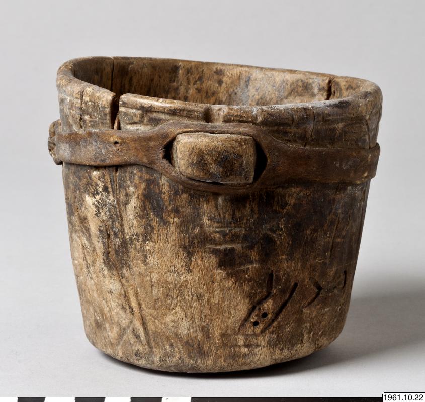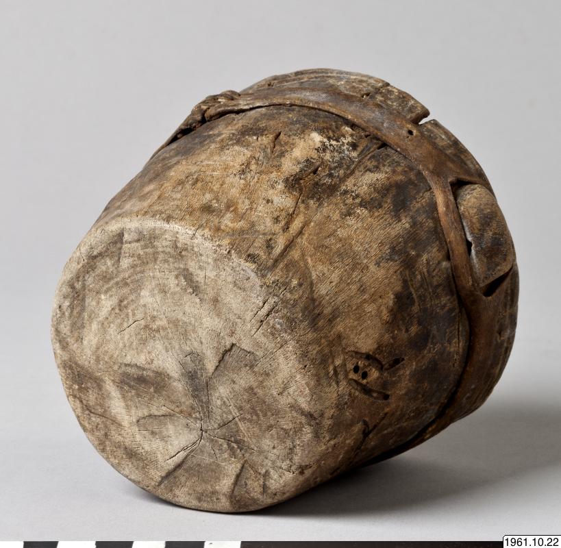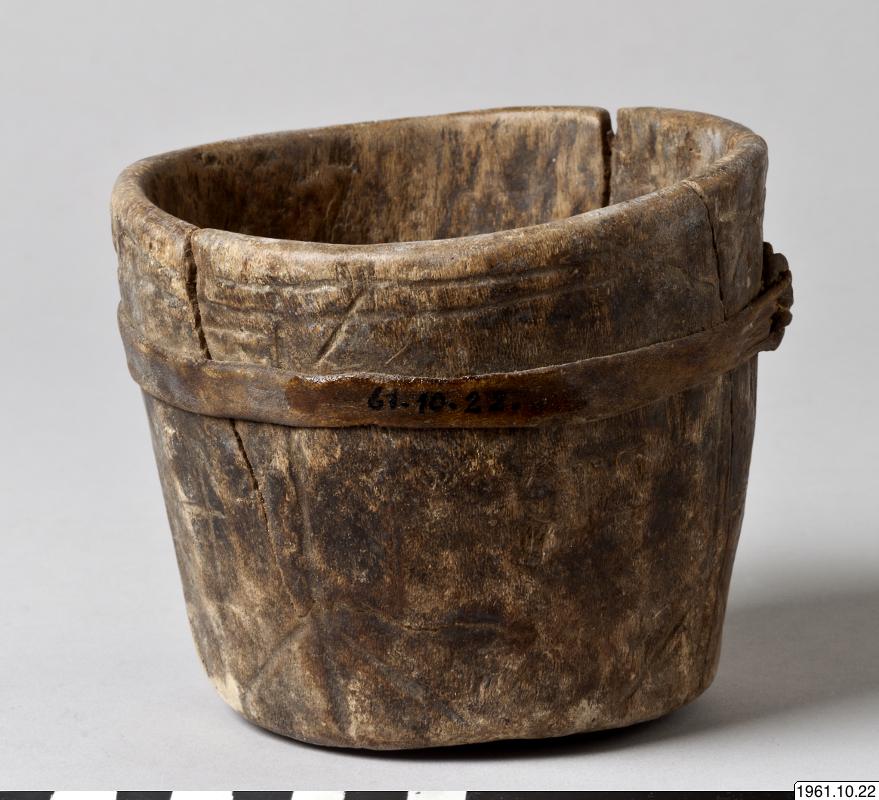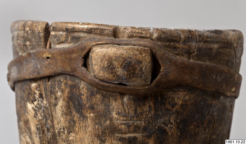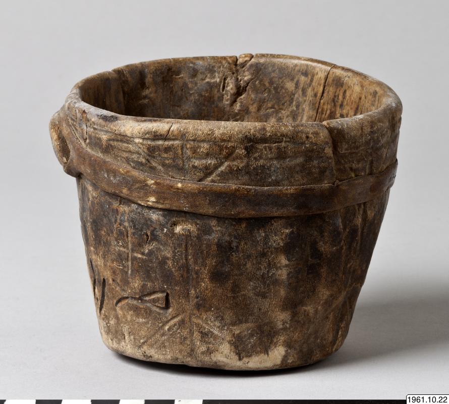 Mått av trä. Cylindrisk form, men något vidgande sig mot mynningen, som på yttersidan är ornerad med en skinnremsa och har inskuren, enkel dekor.