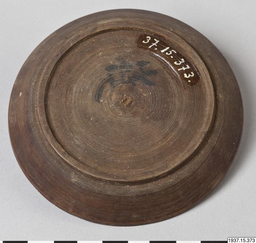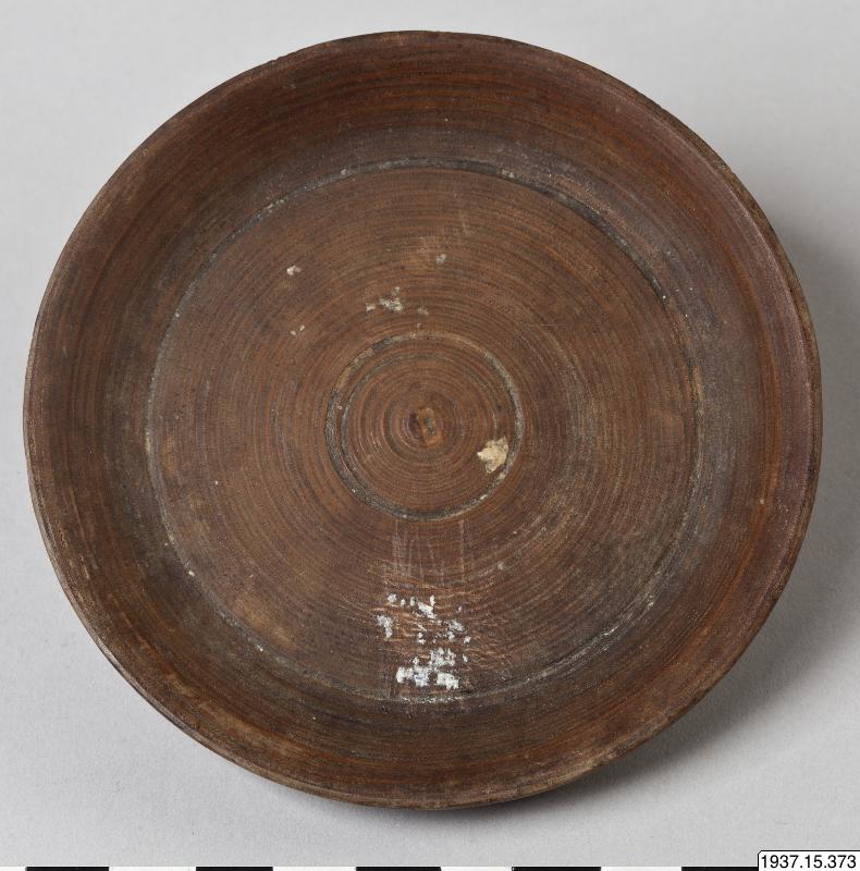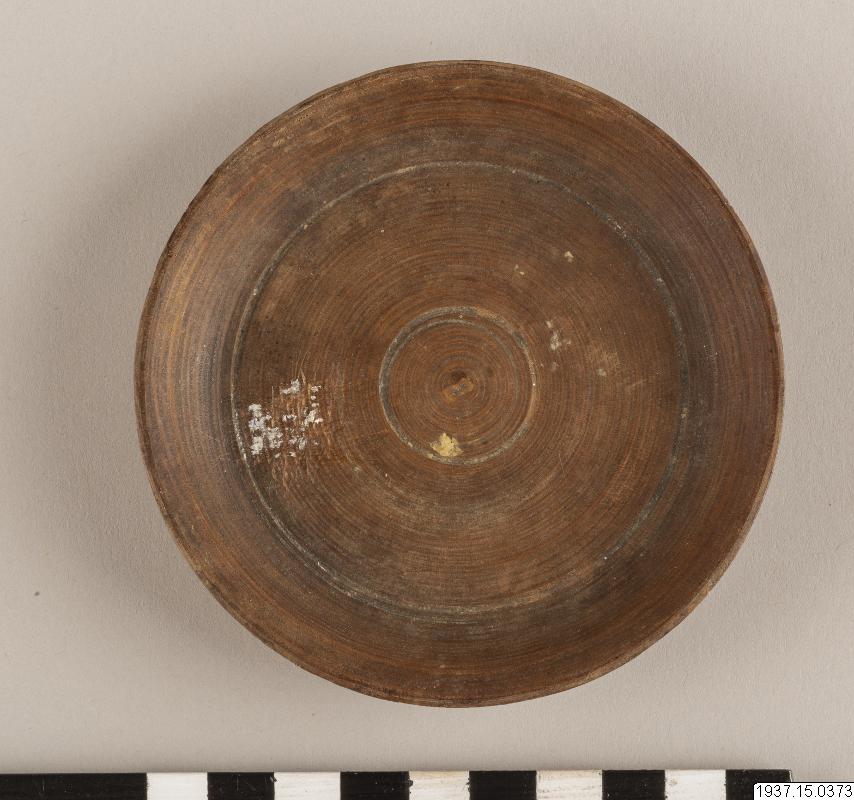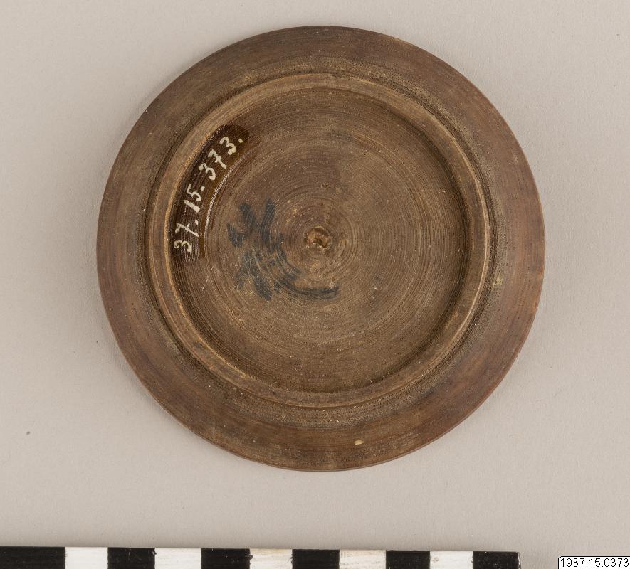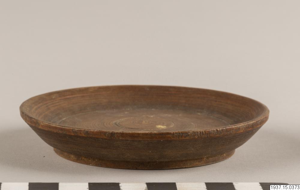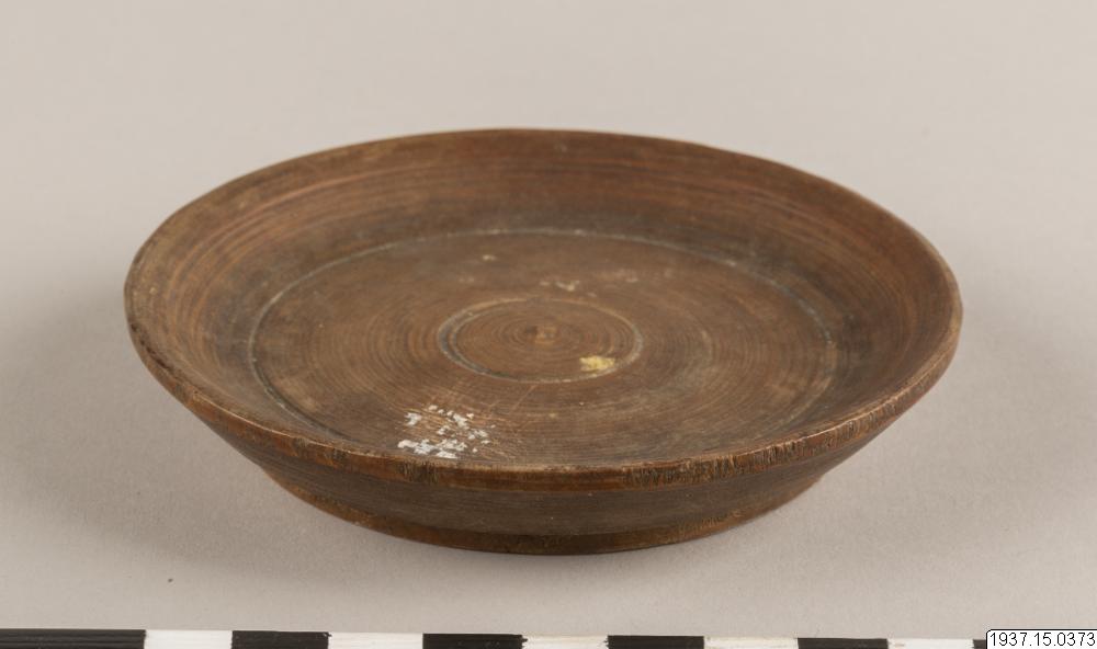 This wooden dish has flared sides that curve down to a foot in the lowest section. The base within the footrim is flat. The outer edge of the rim of the dish was trimmed vertically. This dish was turned on a lathe from one piece of wood. The turning marks remain visible. Two incised rings on the interior of the dish – one where the base meets the sides, and one at the centre – add a decorative element to the otherwise plain dish. An inscription or sign is written in black on the base of the dish. The surface was treated with a surface coating, possibly lacquer. Wood-turning is a traditional craft in Korea and craftspeople have been known for being especially skilful at turning wood, producing a large variety of round-shaped objects for ritual or everyday use such as dishes, bowls, trays, and small round tables (Korean: soban). To produce wooden wares, the wood was first cut and roughly shaped (Korean: chogari). After drying, the piece of wood was then worked into its final shape (Korean: jaegari). Wooden wares were typically finished with a surface coating of lacquer. Simple decorations of incised lines, along with the visible turning or tool marks and the natural pattern of the wood grain, give these objects a special aesthetic appeal.
