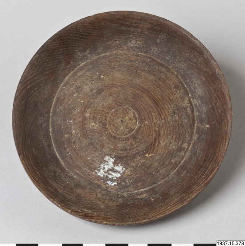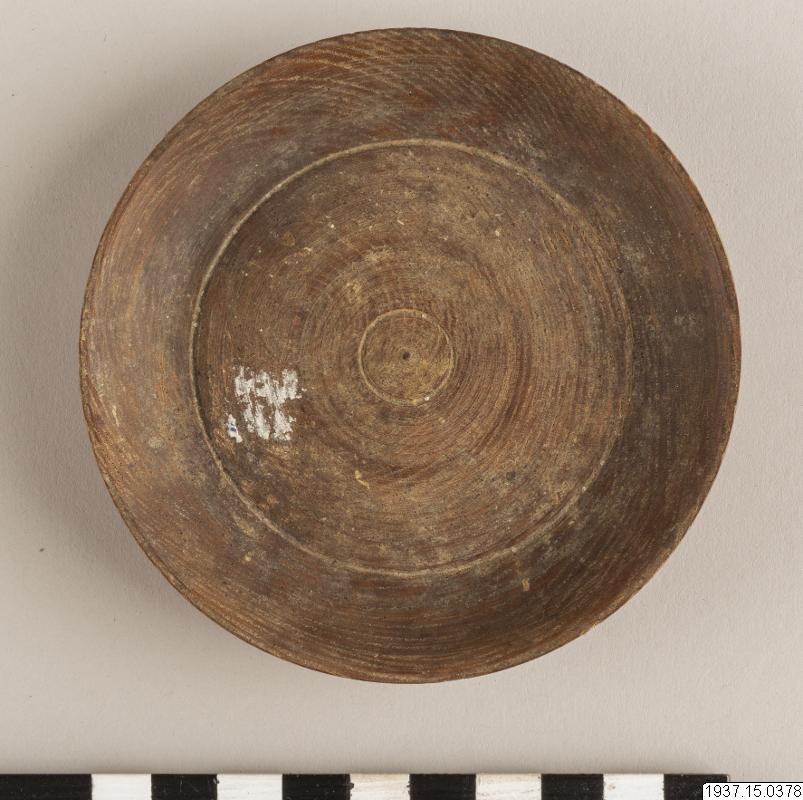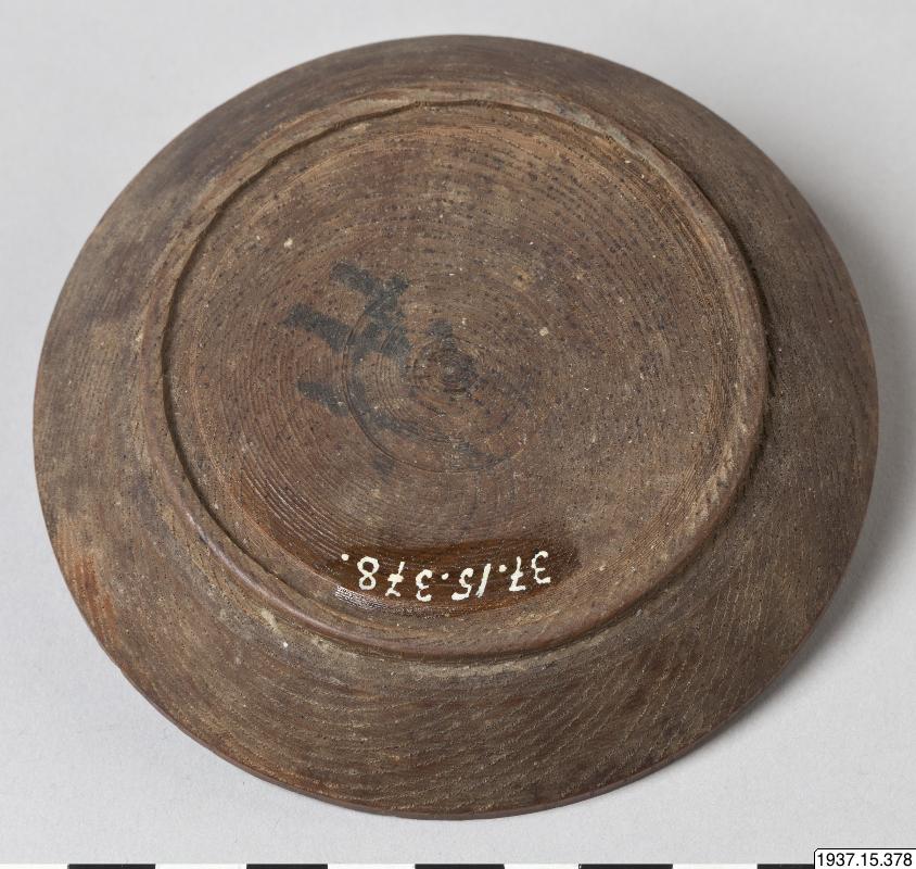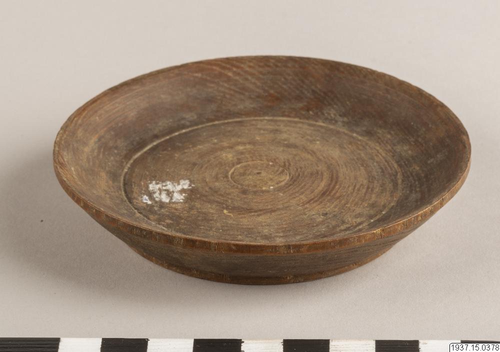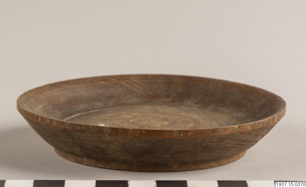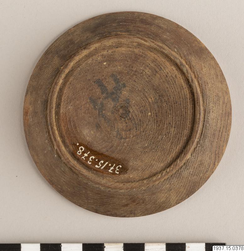 This wooden dish has flared sides that curve in the lowest section, above a foot. The base inside the footrim is flat, but has a deep line turned along the footrim. The outer edge of the rim of the dish was trimmed vertically. This dish was turned on a lathe from one piece of wood. The turning marks remain visible. Two incised rings on the interior of the dish – one where the base meets the sides, and one at the centre – add a decorative element to the otherwise plain dish. An inscription or sign is written in black on the base of the dish. The surface was treated with a surface coating, possibly lacquer. Wood-turning is a traditional craft in Korea and craftspeople have been known for being especially skilful at turning wood, producing a large variety of round-shaped objects for ritual or everyday use such as dishes, bowls, trays, and small round tables (Korean: soban). To produce wooden wares, the wood was first cut and roughly shaped (Korean: chogari). After drying, the piece of wood was then worked into its final shape (Korean: jaegari). Wooden wares were typically finished with a surface coating of lacquer. Simple decorations of incised lines, along with the visible turning or tool marks and the natural pattern of the wood grain, give these objects a special aesthetic appeal.